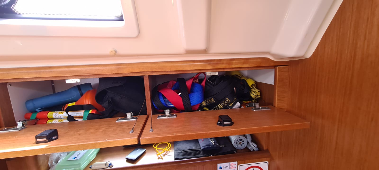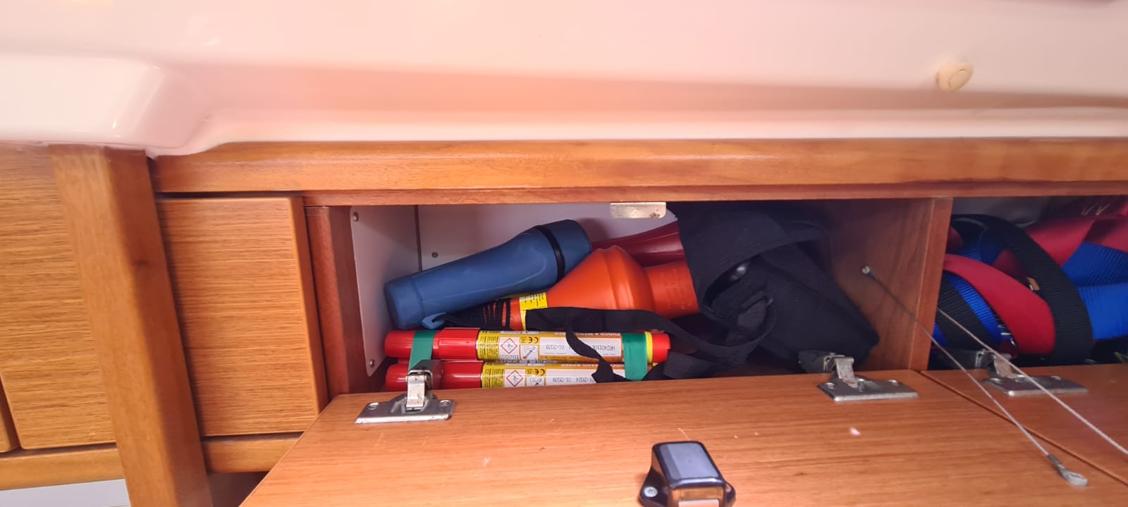Safety Autopilot, Bilgepumpe, Bootsmannstuhl, Bordapotheke, Bordwerkzeug, Bugstrahlruder, Feststoffschwimmwesten, Feuerlöscher, Flaggen, Lifebelts, Nebelhorn, Notsignale, Reserve-Motoröl, Rettungsbojenlicht, Rettungsring, Taschenlampe, UKW-Funk, Zweitanker