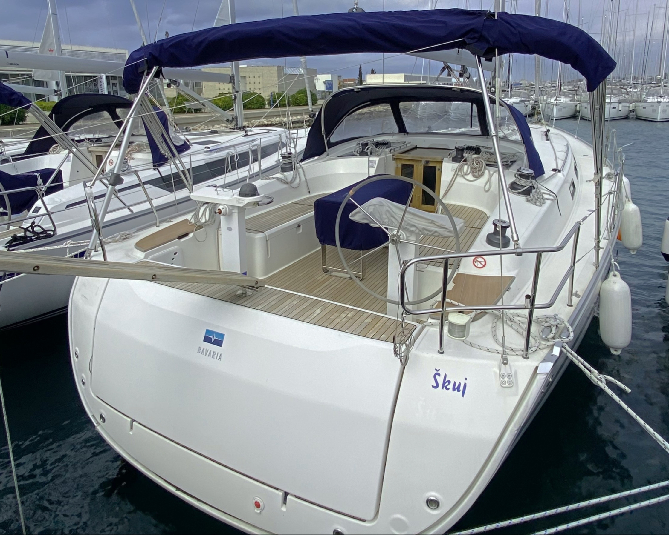 | Outside | 220 V-Landanschluss, Anker mit Kette, Ankerwinsch, Badeplattform, Biminitop, Cockpitdusche, Cockpittisch, Dieselkanister , elektr. Ankerwinsch, Fender, Festmacherleinen, Gangway, Kugelfender, Kunststoff-Eimer (Pütz), Sprayhood, Teak im Cockpit, Wasserkanister , Wasserschlauch, Windex |