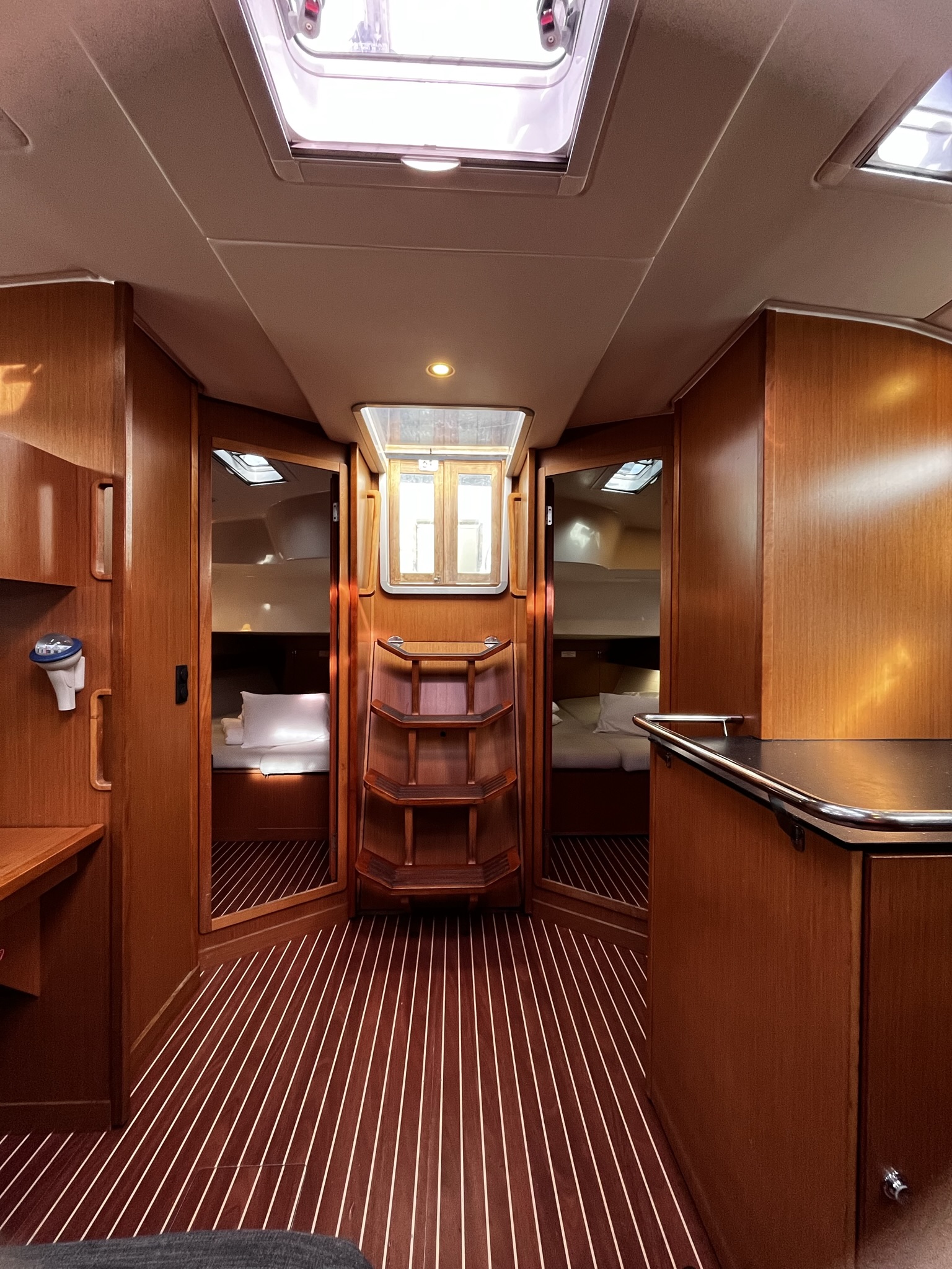 | Navigation | Barometer, GPS mit Kartenplotter im Cockpit, Handpeilkompass, Navigationsbesteck, Tridata (Log, Echolot, Windm.) |