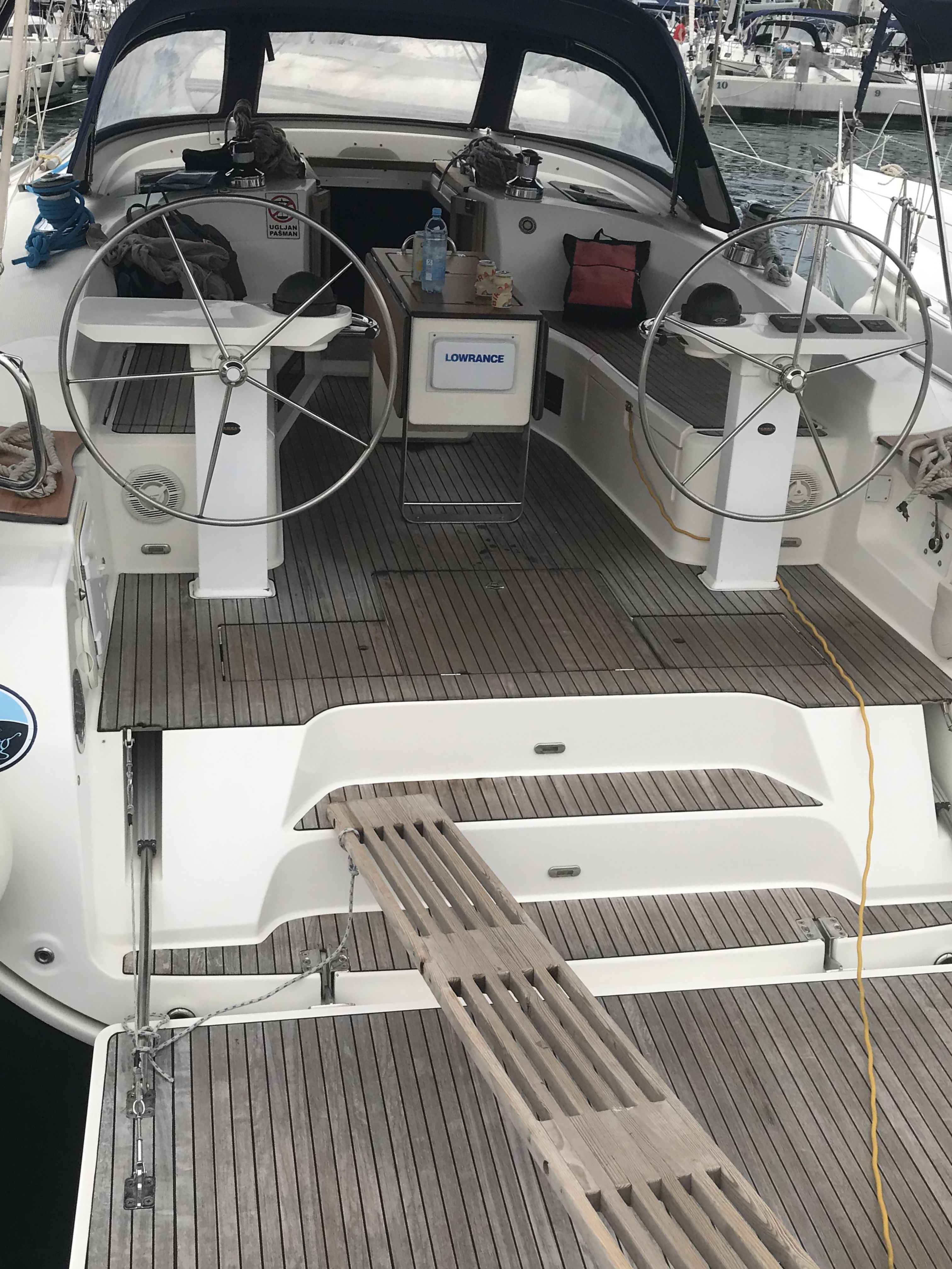 Outside Badeplattform, Biminitop, Bootshaken, Buganker, Cockpitdusche, Cockpittisch, Deckbürste, Dieselkanister , Eimer mit Seil, elektr. Ankerwinsch, Fender, Festmacherleinen, Gangway, Sprayhood, Wasserschlauch, Winschen