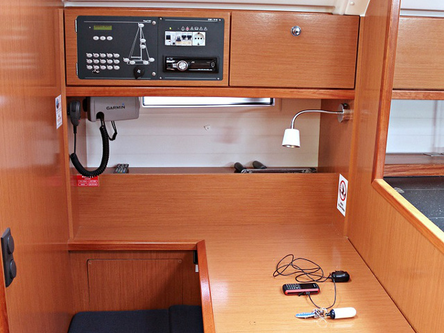 | Navigation | Barometer, Echolot, Fernglas, GPS mit Kartenplotter im Cockpit, Hafenhandbücher, Handpeilkompass, Kompass, Navigationsbesteck, Seekarten, Sumlog, Windmesser |