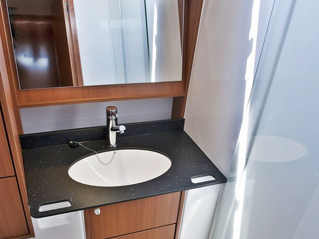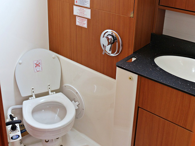 | Inside | 12V Steckdose, 220V Steckdosen, Gasherd, Kleiderbügel, Kühlschrank, Ladegerät, Landstromkabel, Luftpumpe für Beiboot, Pantryausstattung, Radio mit CD und MP3, Salontisch absenkbar, Spülbecken, Trichter, TV, Warmwasser |