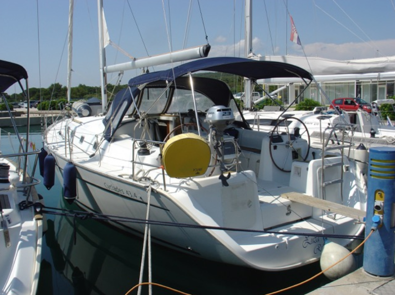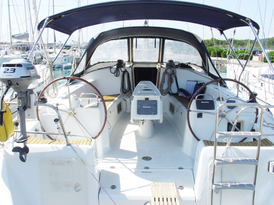 | Outside | 220 V-Landanschluss, Anker mit Kette, Badeleiter, Badeplattform, Biminitop, Cockpitdusche, Cockpitlautsprecher, Cockpitpolster, Cockpittisch, elektr. Ankerwinsch, Fender, Gangway, Sonnensegel, Sprayhood, Teak im Cockpit, Windex |