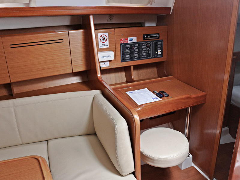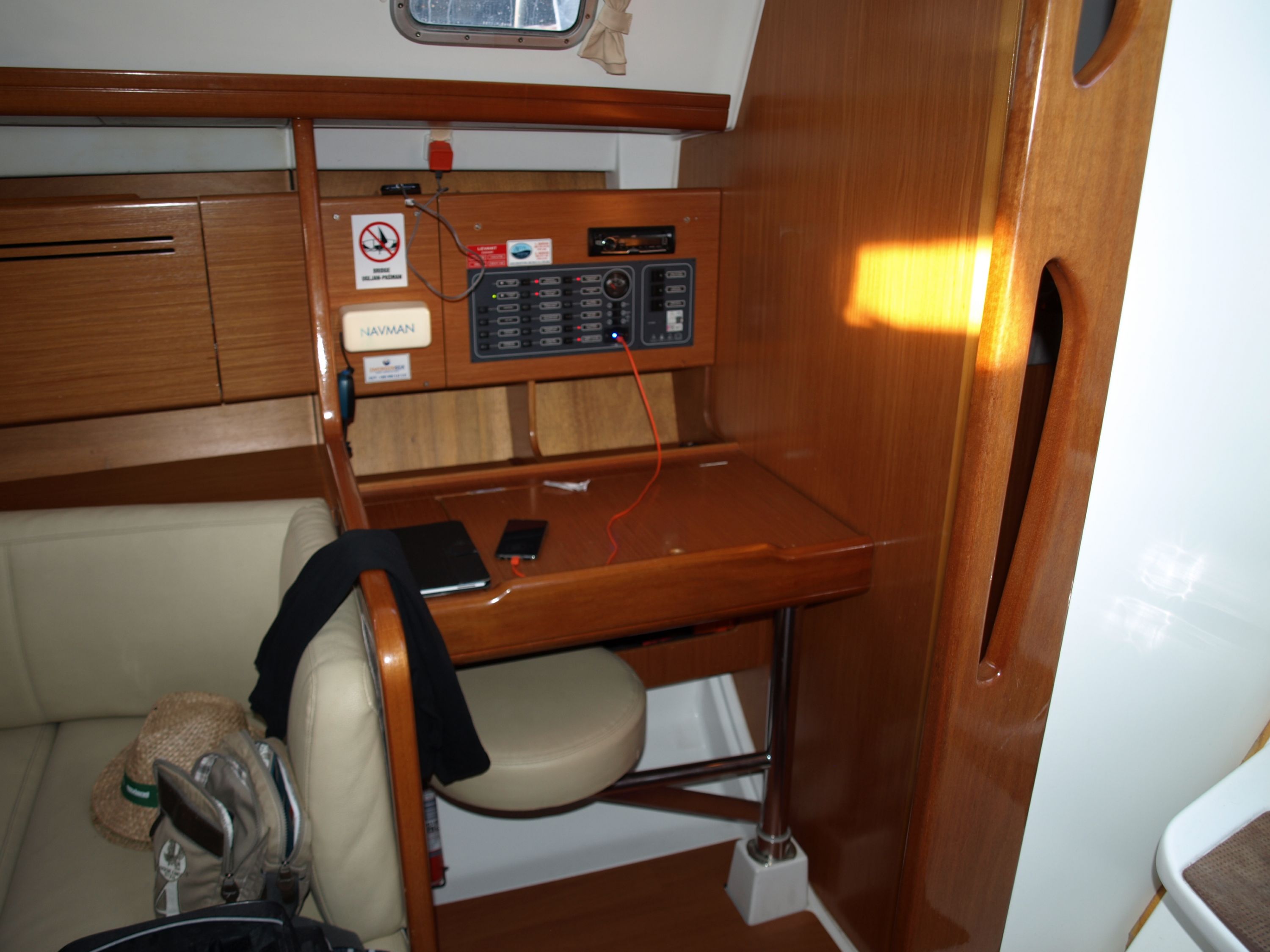 | Navigation | Barometer, Echolot, Fernglas, GPS mit Kartenplotter im Cockpit, Hafenhandbücher, Handpeilkompass, Kompass, Navigationsbesteck, Seekarten, Sumlog, Windmesser |