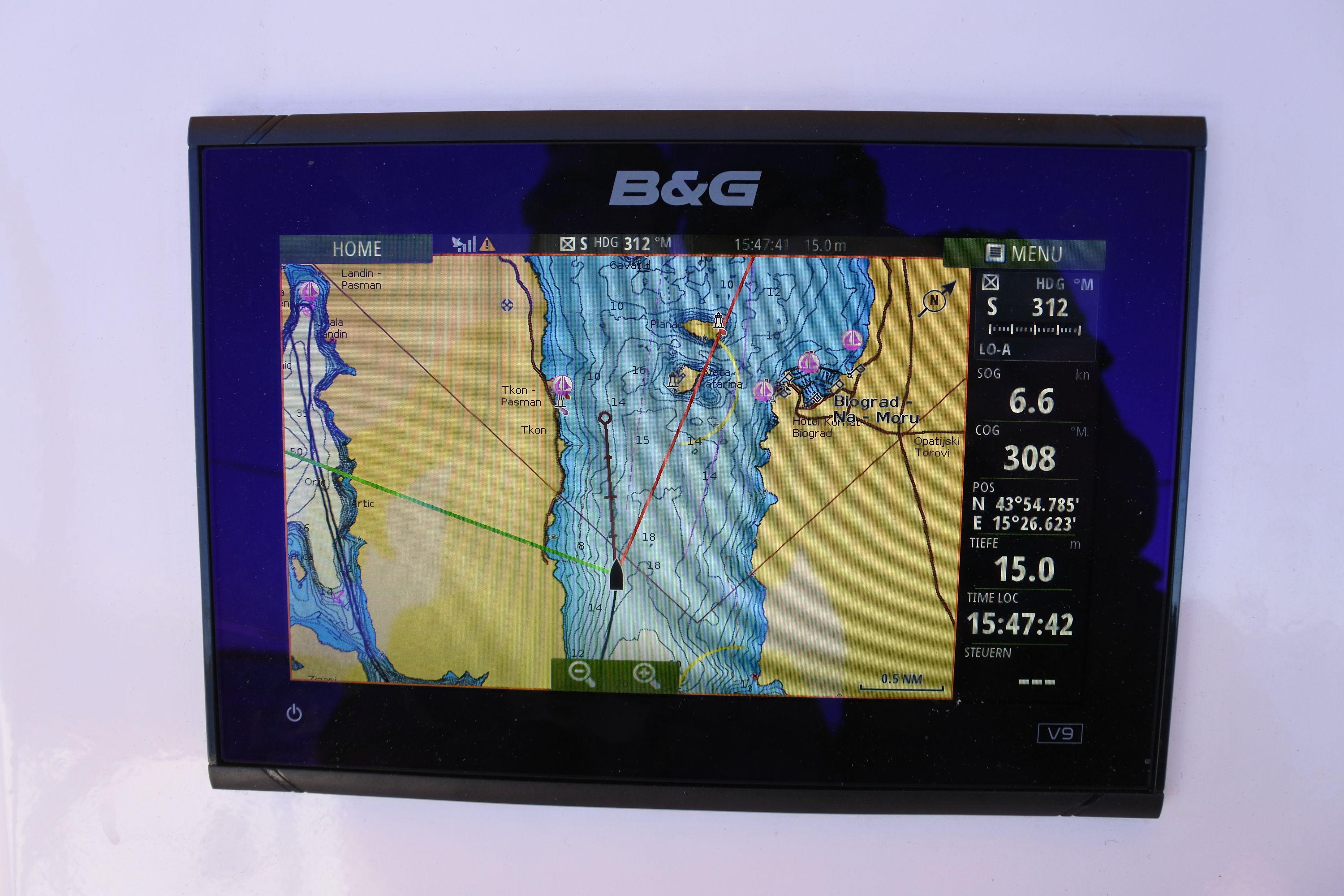 | Navigation | Echolot, Fernglas, GPS mit Kartenplotter im Cockpit, Hafenhandbücher, Kompass, Seekarten, Windmesser |