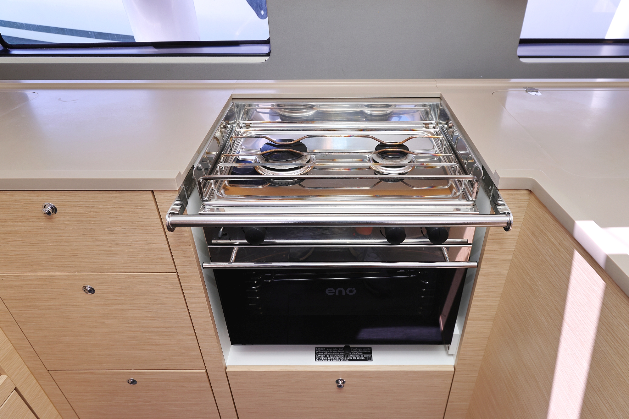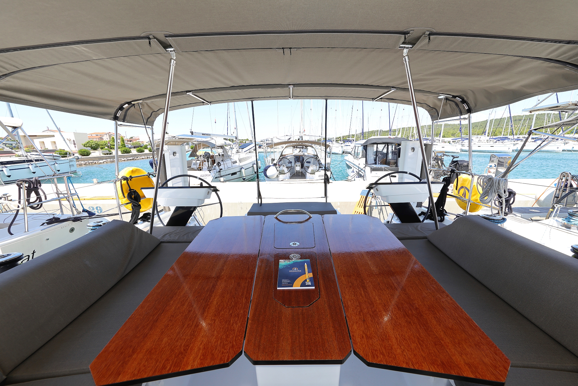 | Outside | 220 V-Landanschluss, Badeplattform, Biminitop, Bootshaken, Cockpitdusche, Cockpitlautsprecher, Cockpitpolster, Cockpittisch, Fender, Festmacherleinen, Gangway, Grill, Solaranlage, Sprayhood, Wasserschlauch, Windex, Winschen |