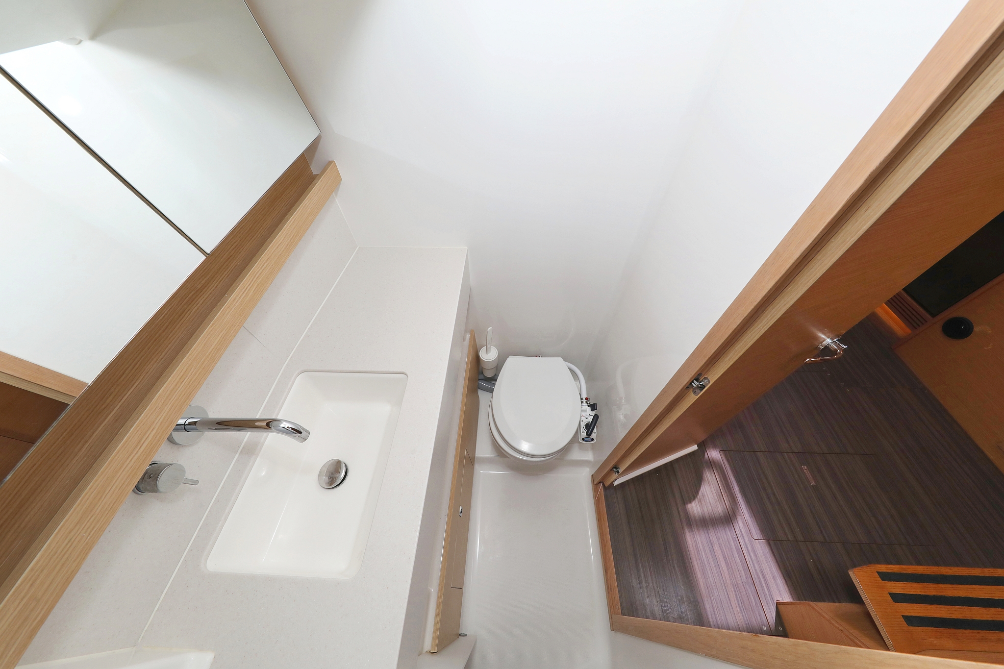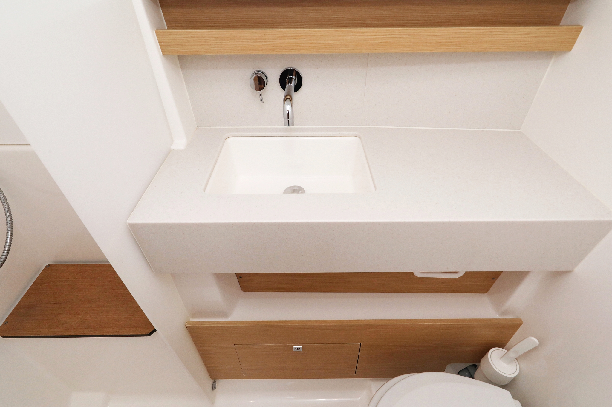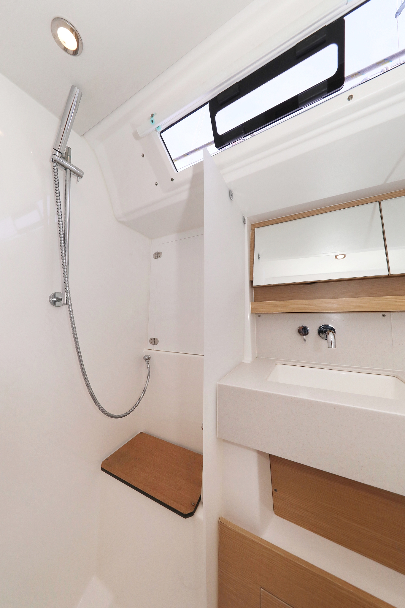 | Outside | 220 V-Landanschluss, Anker mit Kette, Badeplattform, Biminitop, Bootshaken, Cockpitdusche warm/kalt, Cockpitlautsprecher, Cockpitpolster, Cockpittisch, elektr. Ankerwinsch, Fender, Festmacherleinen, Gangway, Grill, Sprayhood, Wasserschlauch, Winschen |