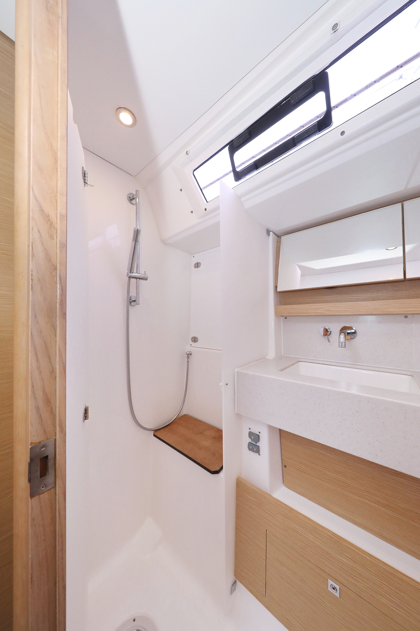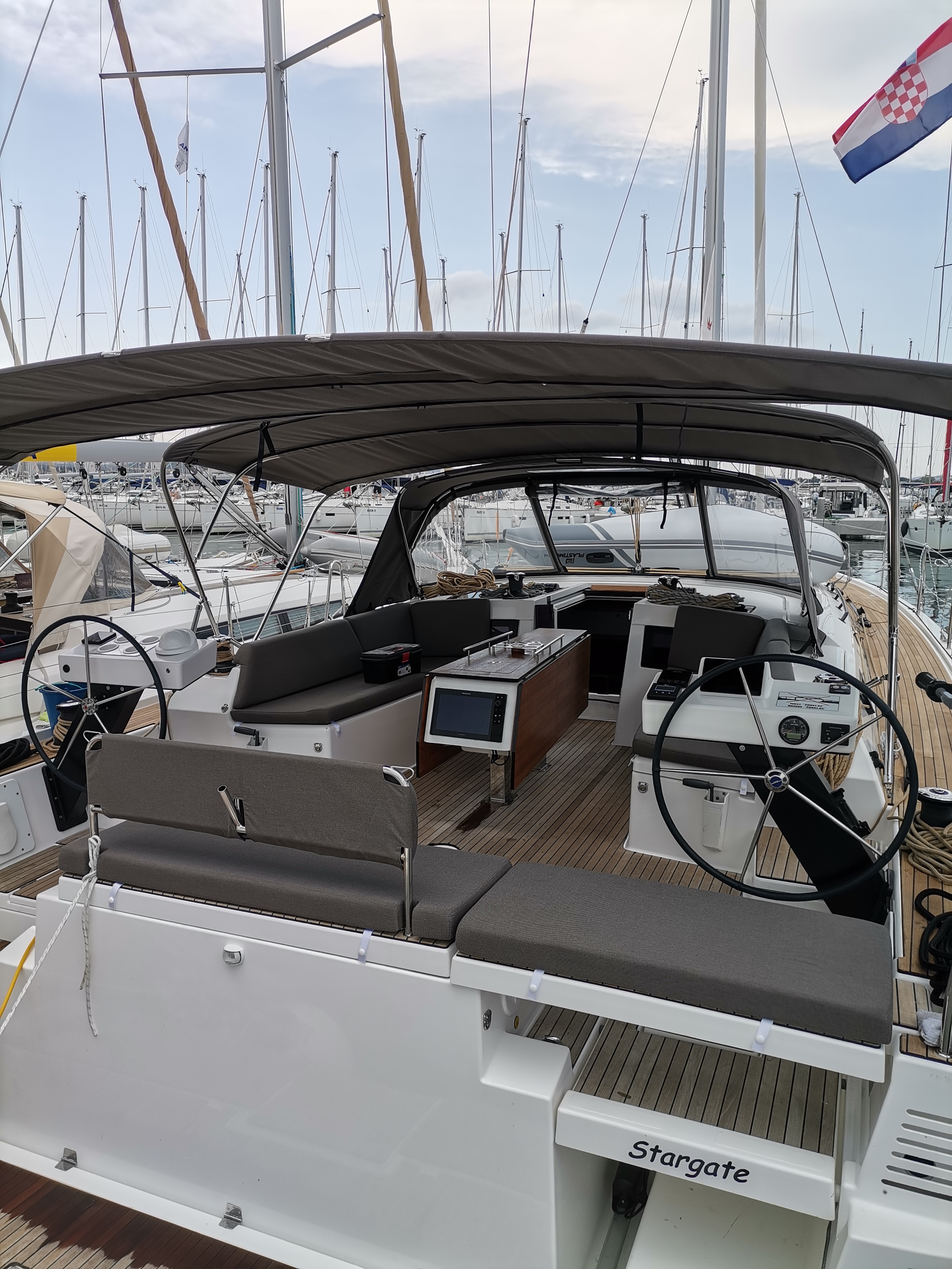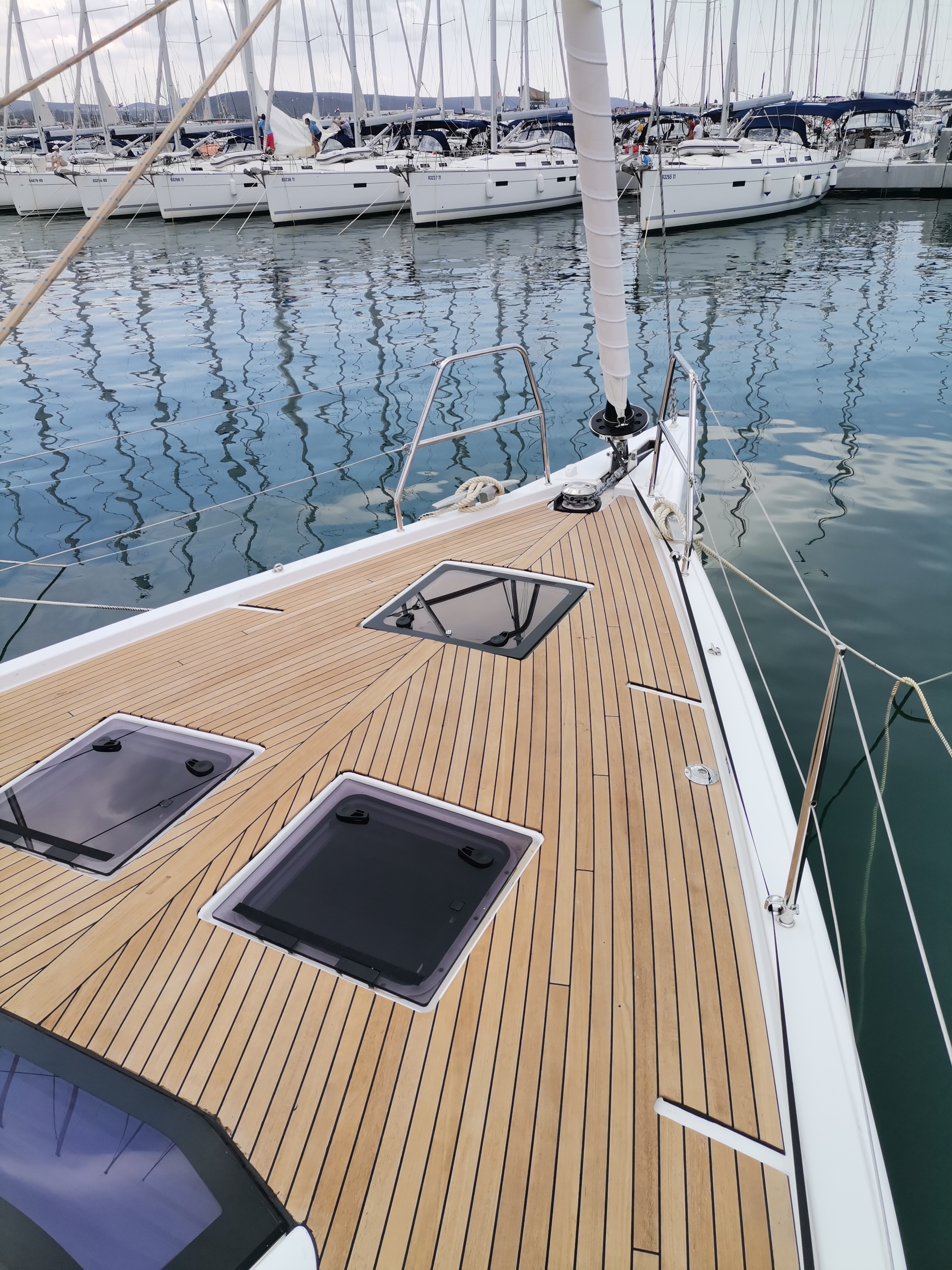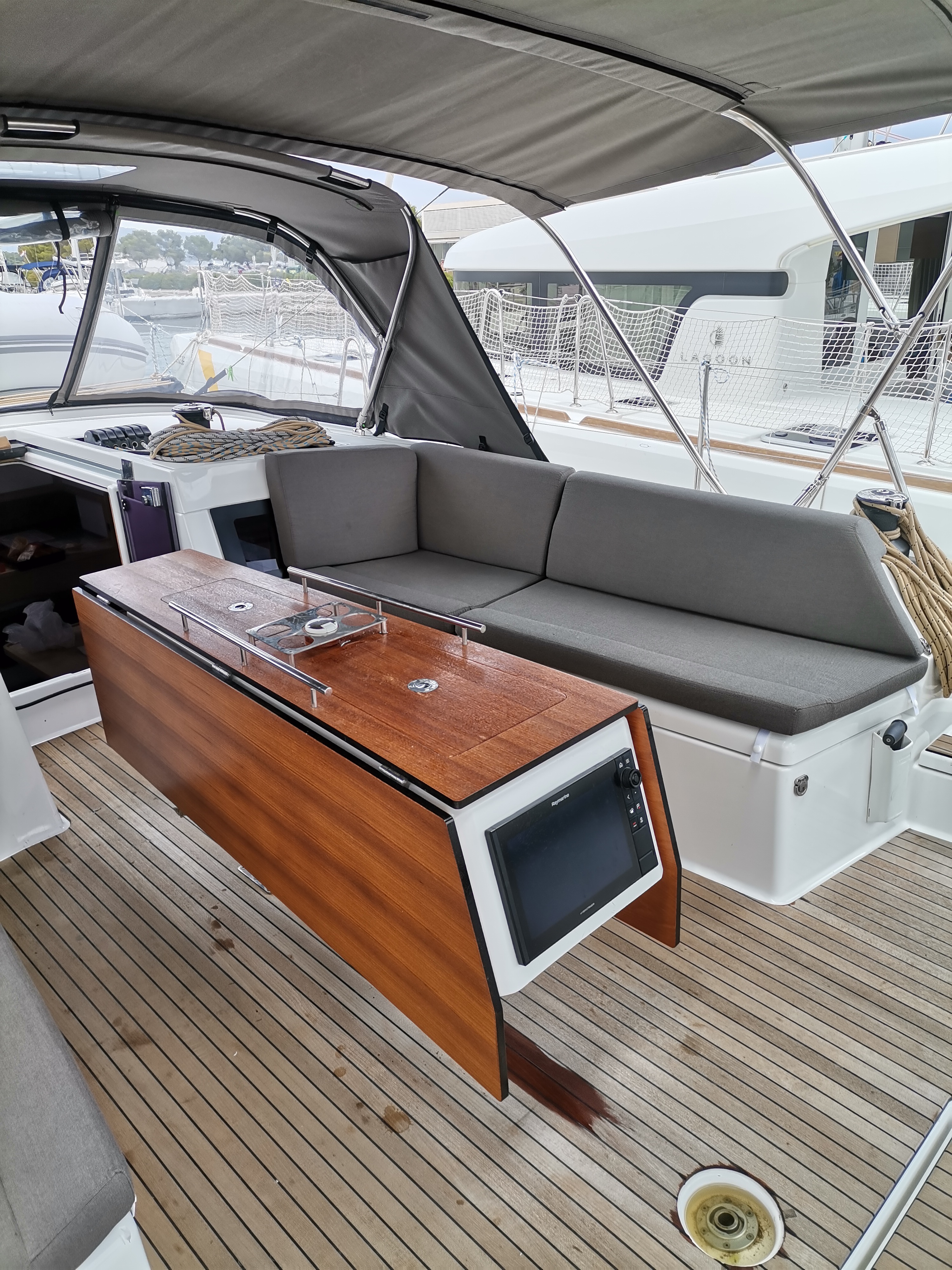 | Outside | 220 V-Landanschluss, Anker mit Kette, Ankerkettenzähler, Badeplattform, Biminitop, Bootshaken, Cockpitdusche warm/kalt, Cockpitkühlschrank, Cockpitlautsprecher, Cockpitpolster, Cockpittisch, elektr. Ankerwinsch, elektr. Winsch, Fender, Festmacherleinen, Gangway, Grill, Solaranlage, Sprayhood, Teak im Cockpit, Teakdeck, Wasserschlauch, Winschen |