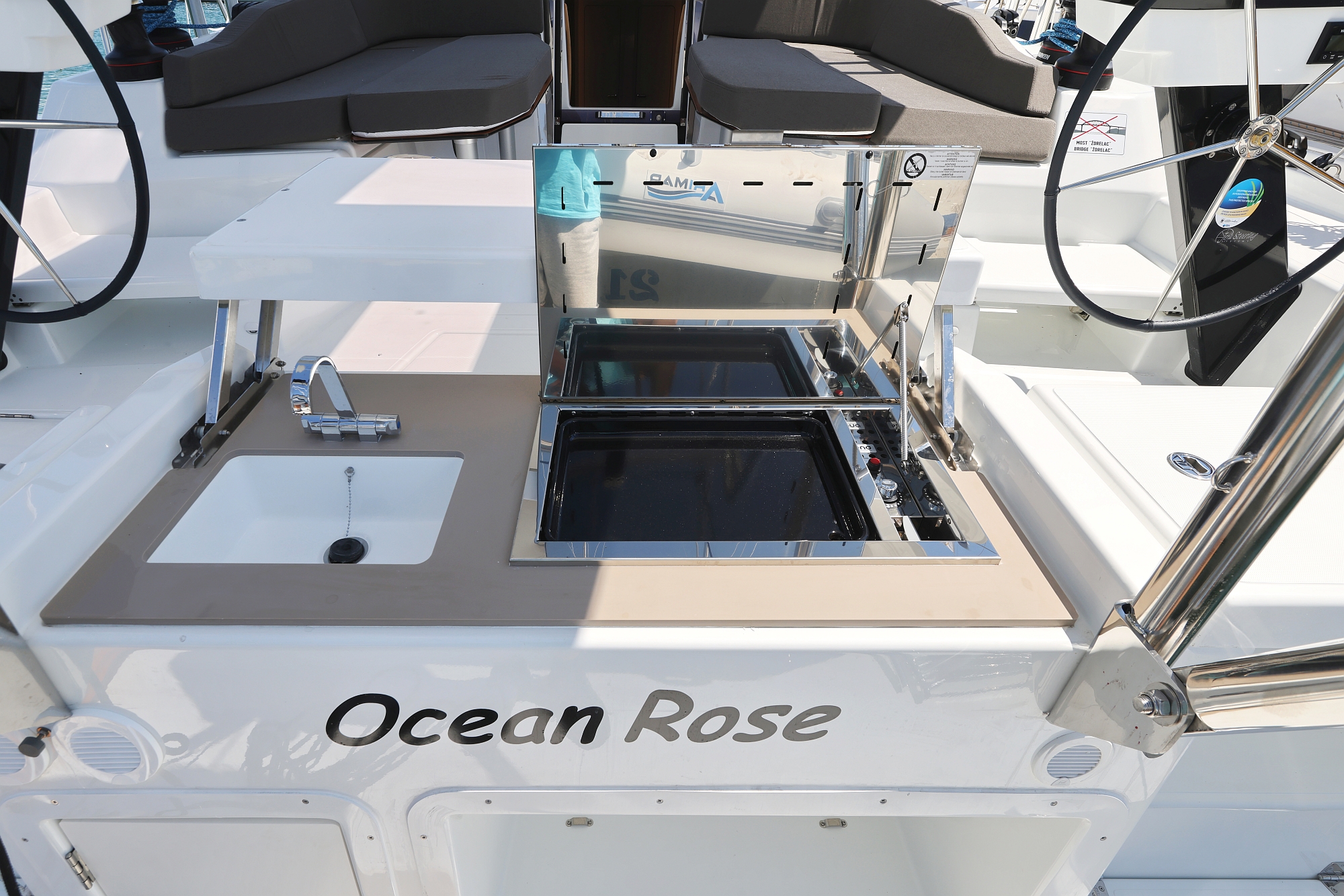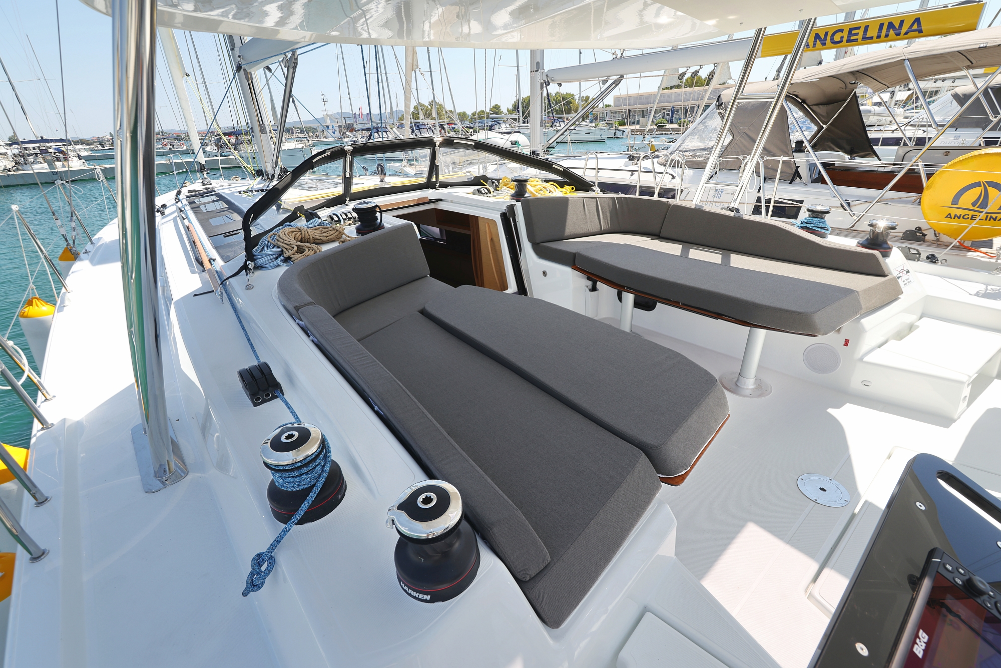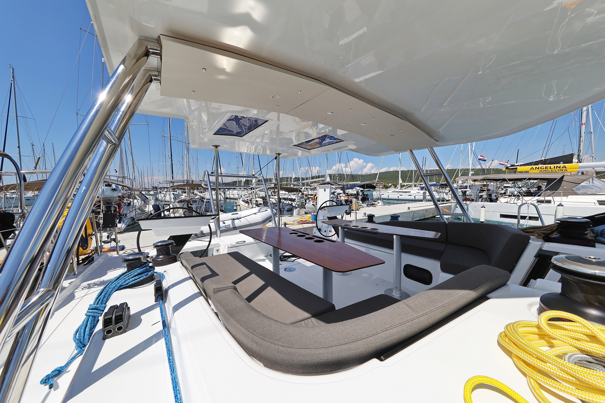 | Outside | 12 V-Anschluss, Badeplattform, Bootshaken, Cockpitdusche, Cockpitpolster, Cockpittisch, Delta-Anker, elektr. Ankerwinsch, Fender, Festmacherleinen, Gangway, Grill, Hardtop, Solaranlage, Sprayhood, Spülbecken im Cockpit, Wasserschlauch, Windex, Winschen |