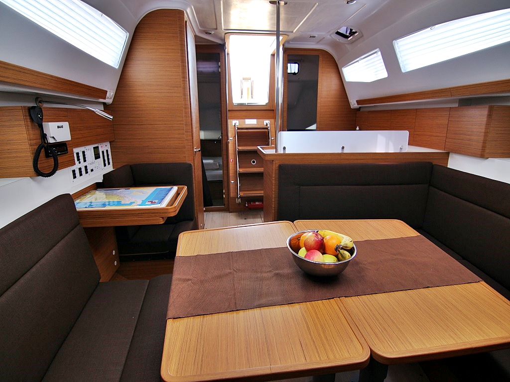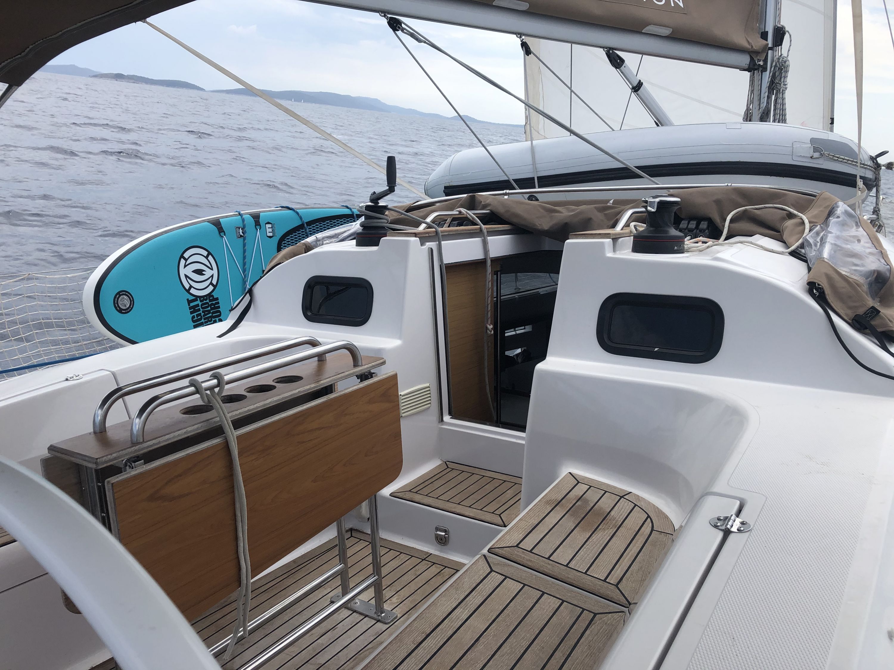 | Outside | Badeplattform, Biminitop, Bootshaken, Buganker, Cockpitdusche, Cockpittisch, Deckbürste, Dieselkanister , Eimer mit Seil, elektr. Ankerwinsch, Fender, Festmacherleinen, Gangway, Solaranlage, Sprayhood, Wasserschlauch, Winschen |