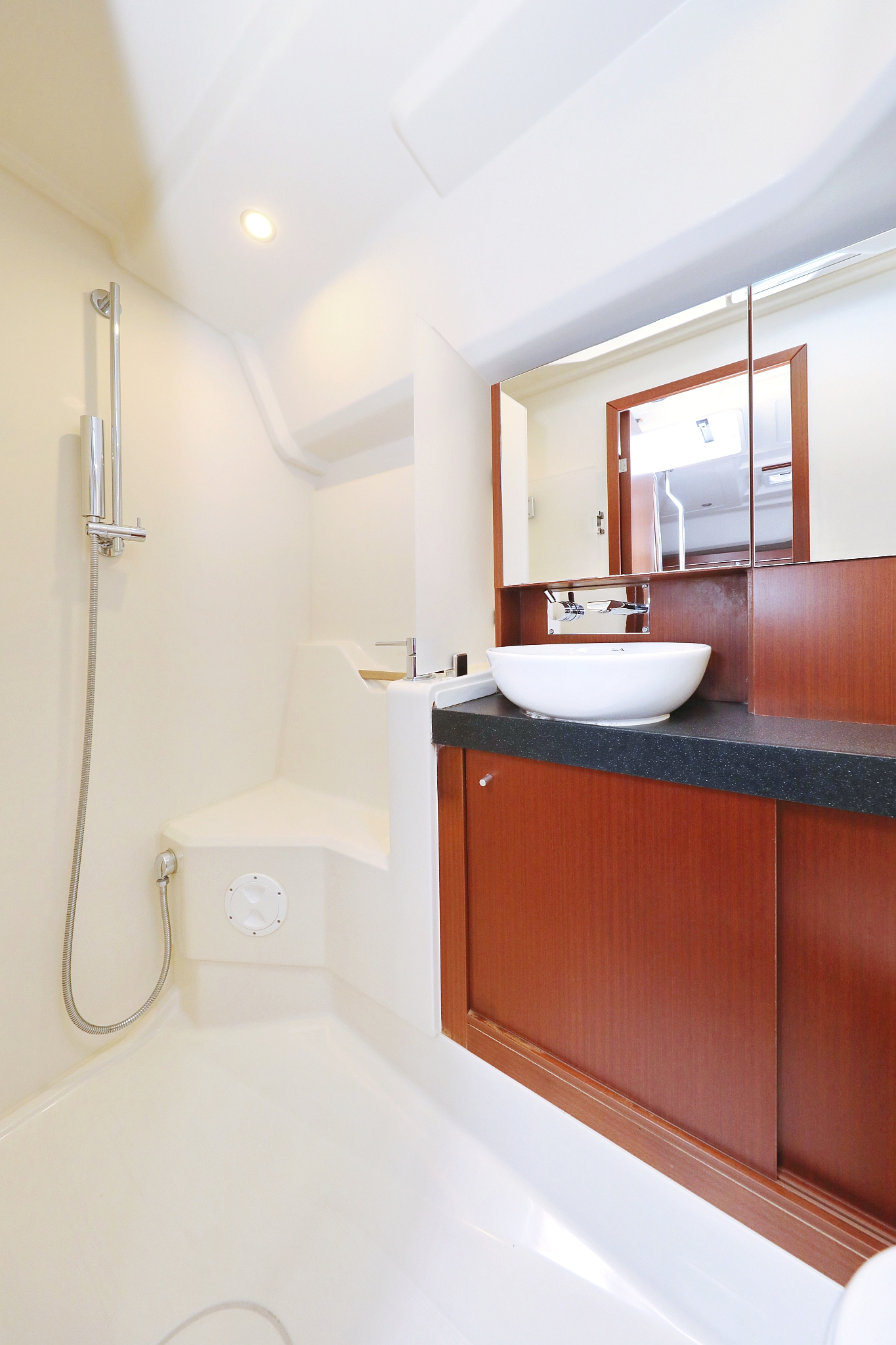 | Outside | 220 V-Landanschluss, Anker mit Kette, Badeplattform, Biminitop, Bootshaken, Cockpitdusche, Cockpitlautsprecher, Cockpitpolster, Cockpittisch, Delta-Anker, Fender, Festmacherleinen, Gangway, Sprayhood, Teak im Cockpit, Wasserschlauch, Winschen |