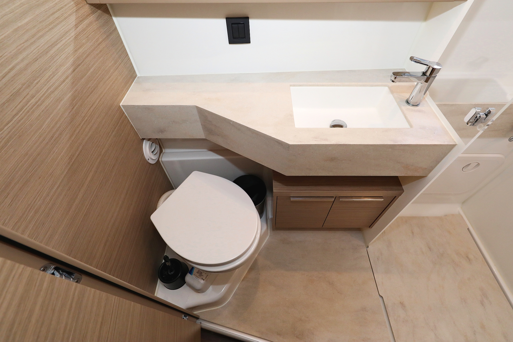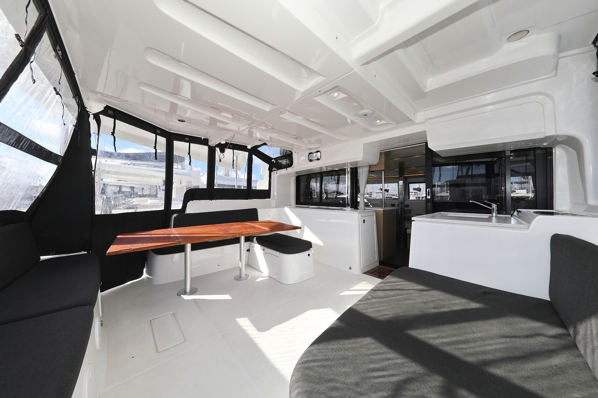 | Outside | Ankerwinsch, Badeplattform (hydr.), Biminitop, Cockpitkühlschrank, Cockpitpolster, Cockpittisch, elektr. Ankerwinsch, Spülbecken im Cockpit |