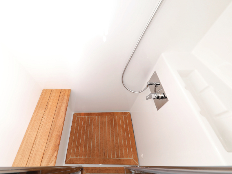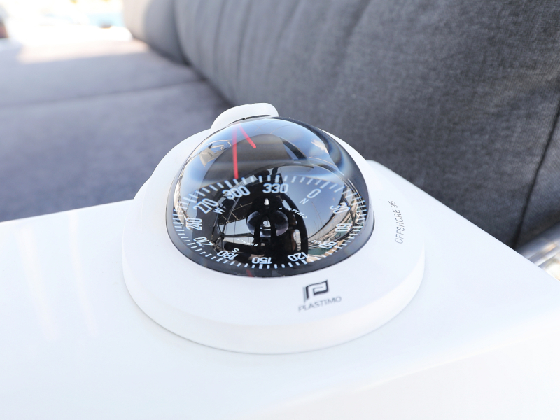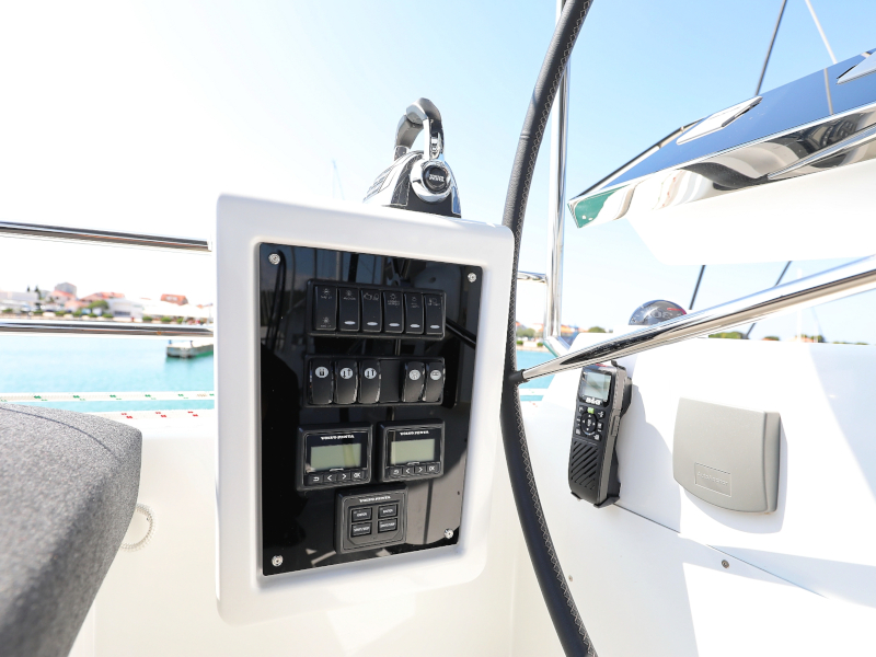 | Outside | Cockpitdusche, Cockpitkühlschrank, Cockpitlautsprecher, Cockpitpolster, Cockpittisch, elektr. Ankerwinsch, elektr. Winsch, Fender, Grill, Teak im Cockpit |