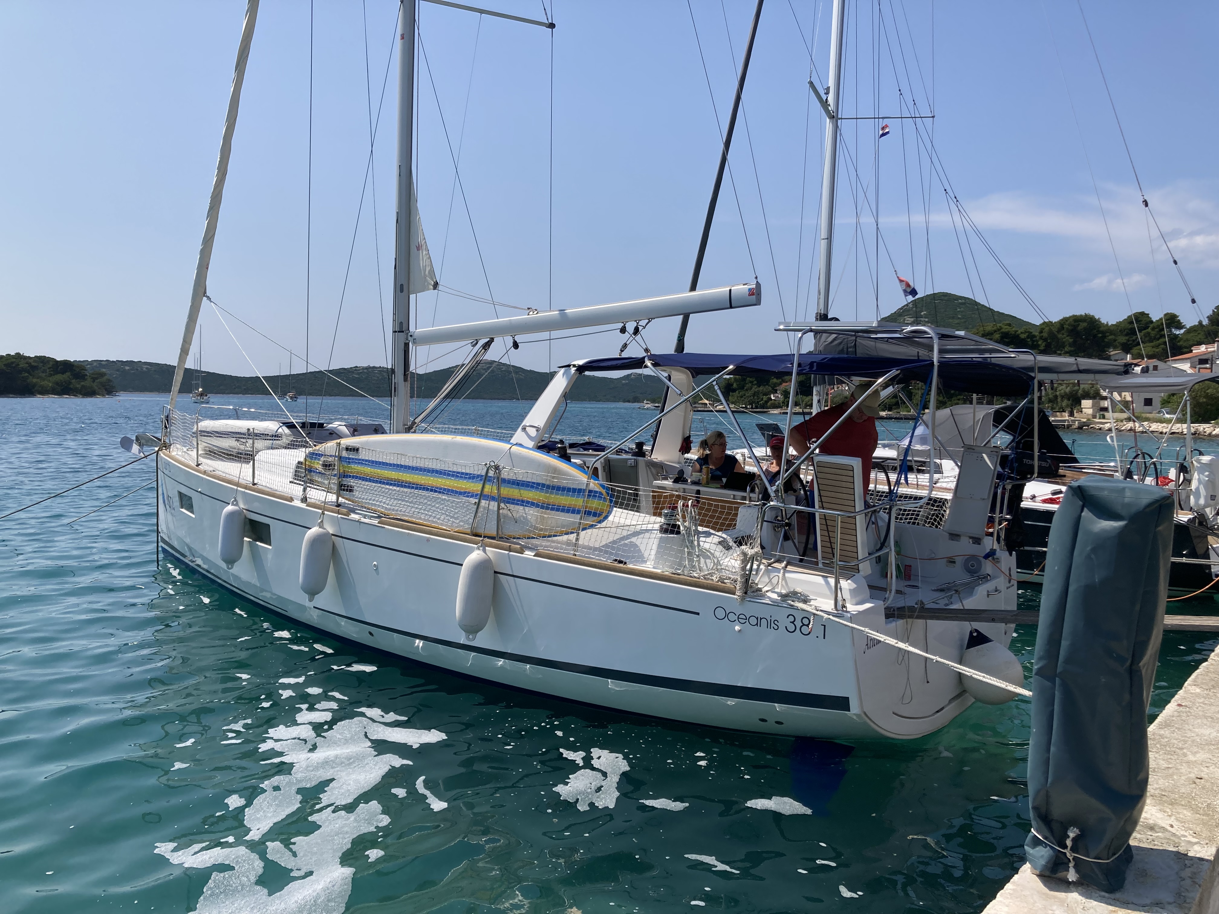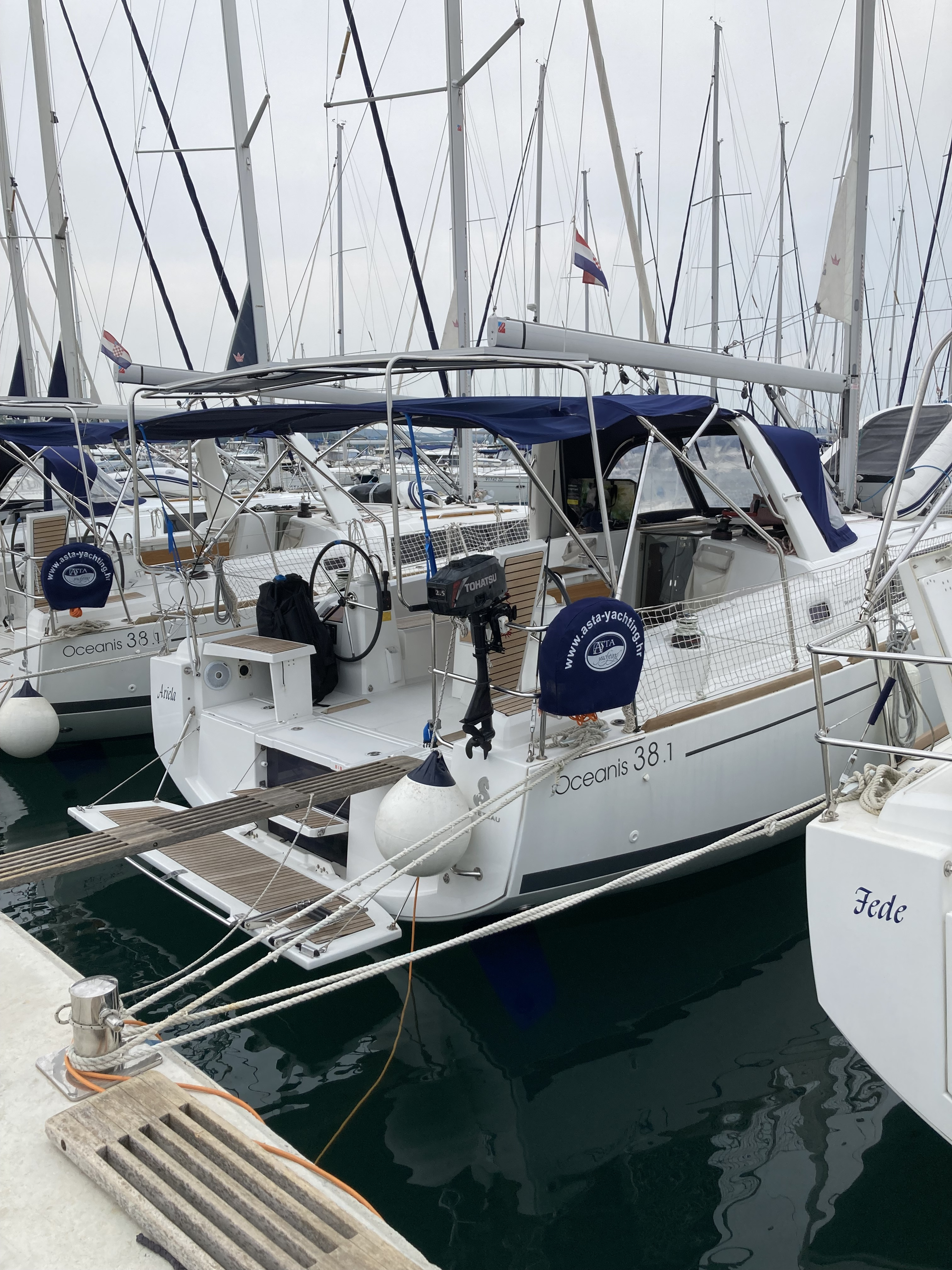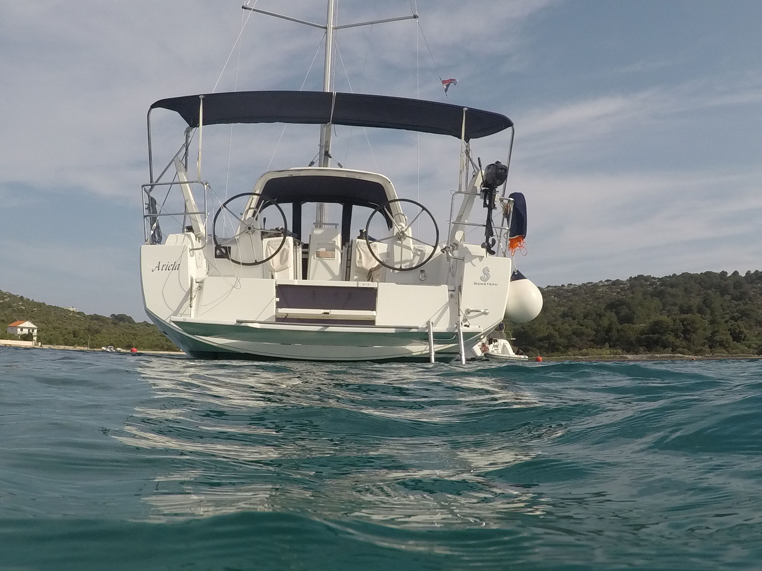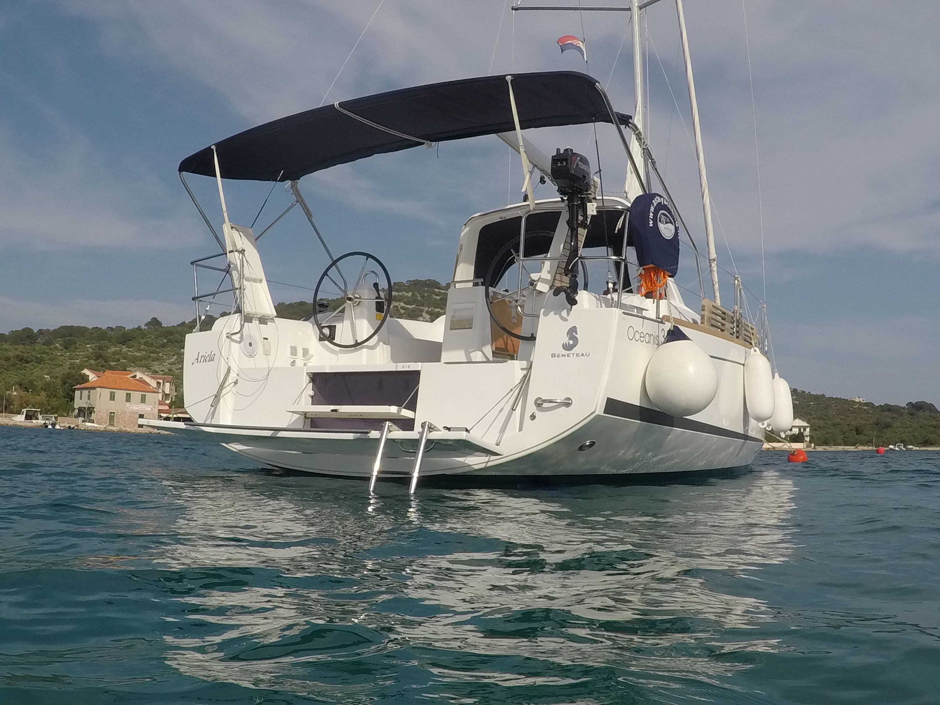 | Outside | Badeplattform, Biminitop, Bootshaken, Buganker, Cockpitdusche, Cockpittisch, Deckbürste, Dieselkanister , Eimer mit Seil, elektr. Ankerwinsch, Fender, Festmacherleinen, Gangway, Solaranlage, Sprayhood, Wasserschlauch, Winschen |