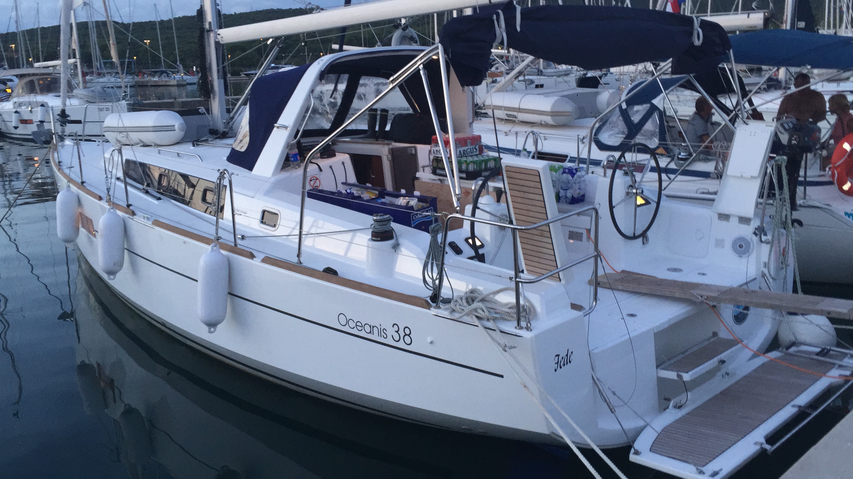 | Outside | Badeplattform, Biminitop, Bootshaken, Buganker, Cockpitdusche, Cockpittisch, Deckbürste, Dieselkanister , Eimer mit Seil, elektr. Ankerwinsch, Fender, Festmacherleinen, Gangway, Solaranlage, Sprayhood, Wasserschlauch, Winschen |