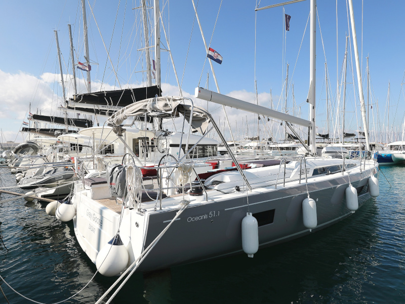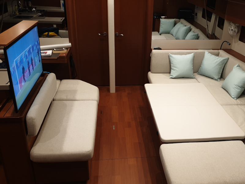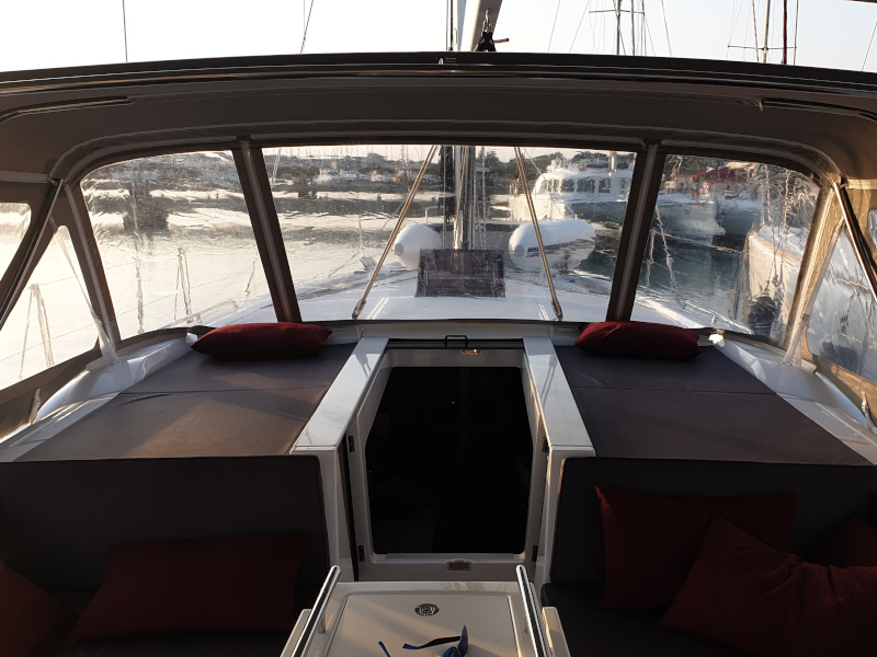 | Outside | Ankerkettenzähler, Badeplattform, Badeplattform (hydr.), Biminitop, Cockpitbeleuchtung, Cockpitlautsprecher, Cockpitpolster, Cockpittisch mit Eisbox, Fernsteuerung für elektr. Ankerwinsch, Sprayhood, Teak im Cockpit, Windex |