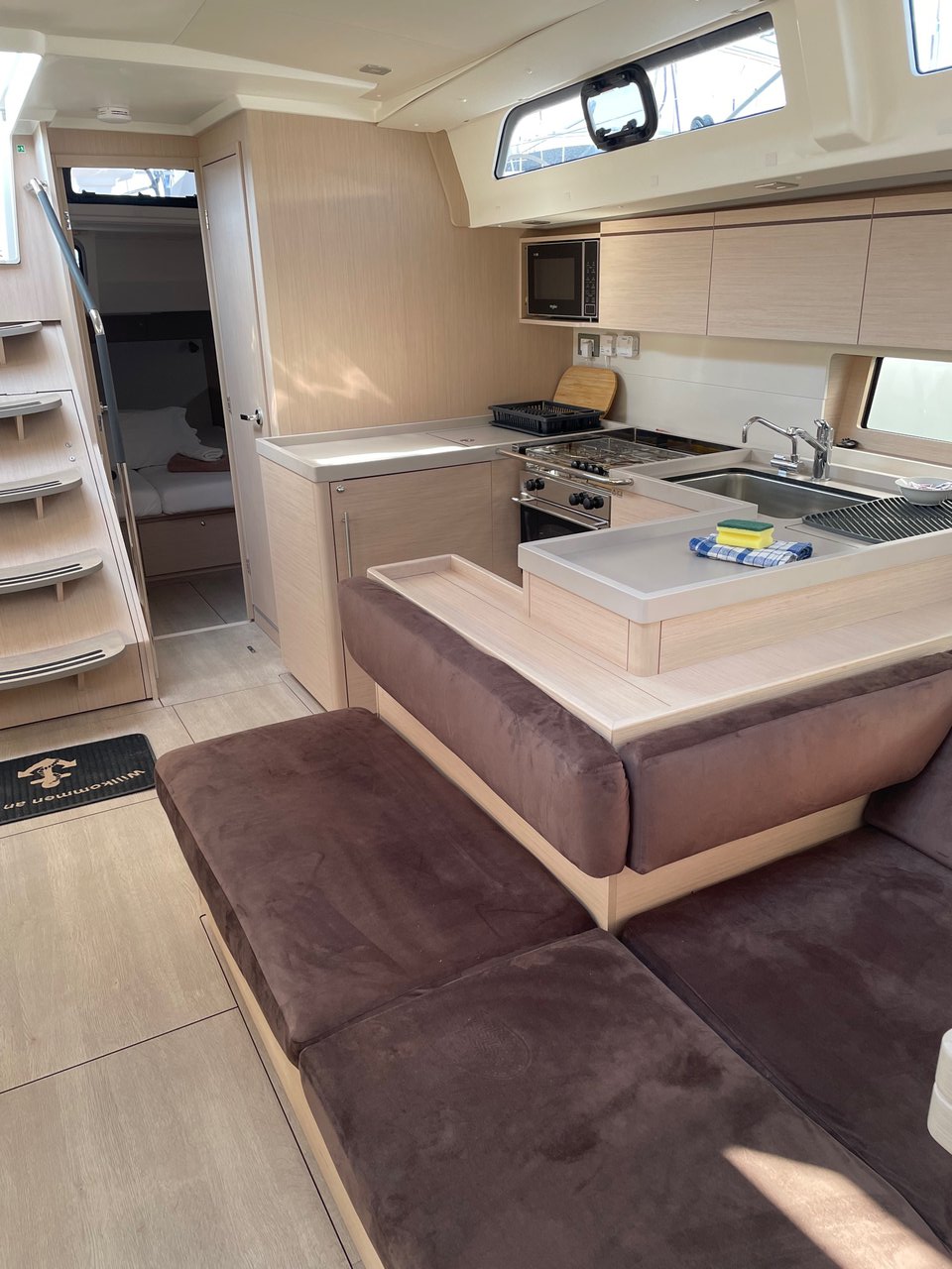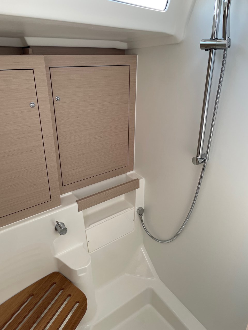 | Outside | Anker mit Kette, Biminitop, Bootshaken, Cockpitpolster, Cockpittisch, elektr. Ankerwinsch, Fender, Festmacherleinen, Sprayhood, Teak im Cockpit, Wasserschlauch, Winschen |