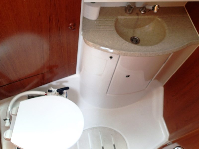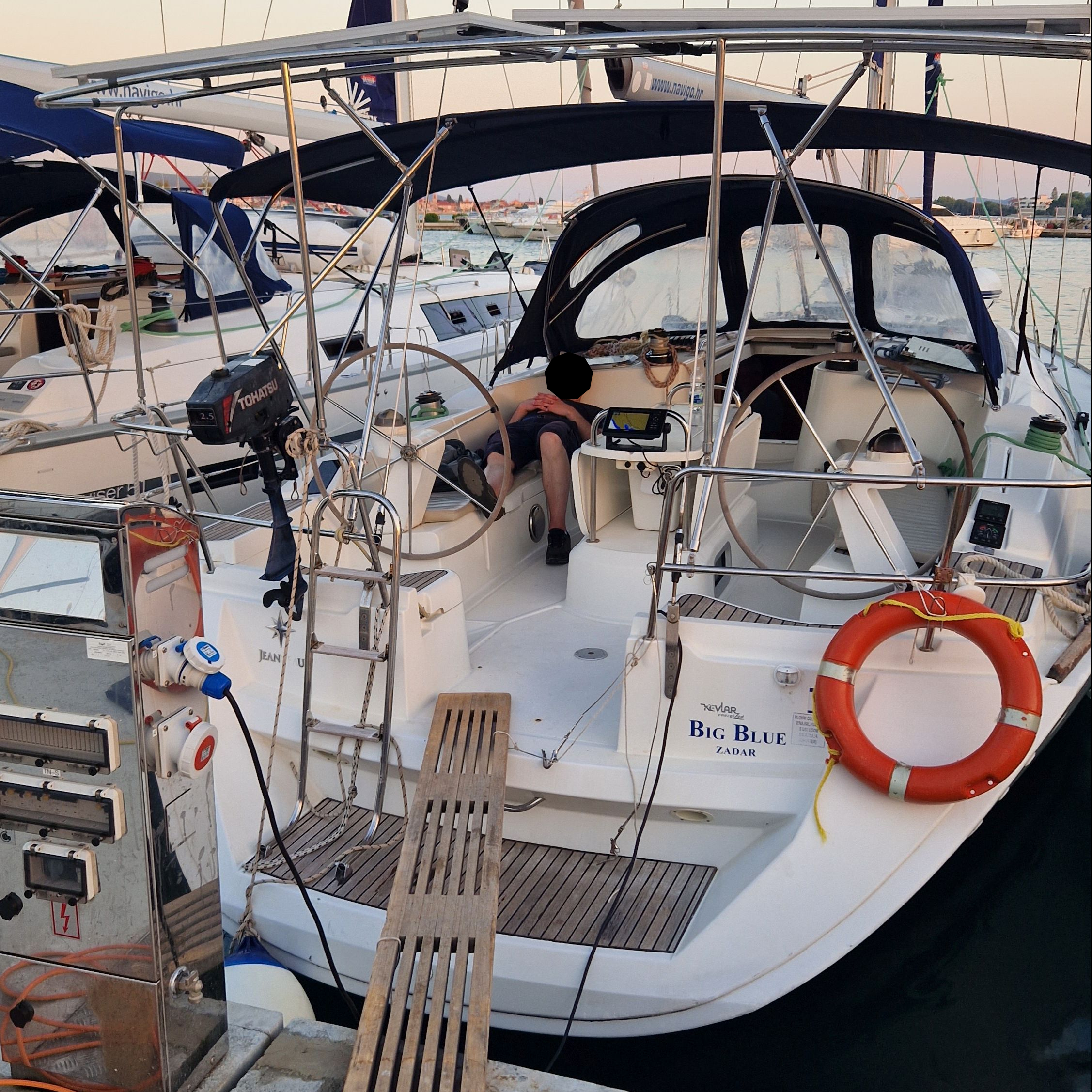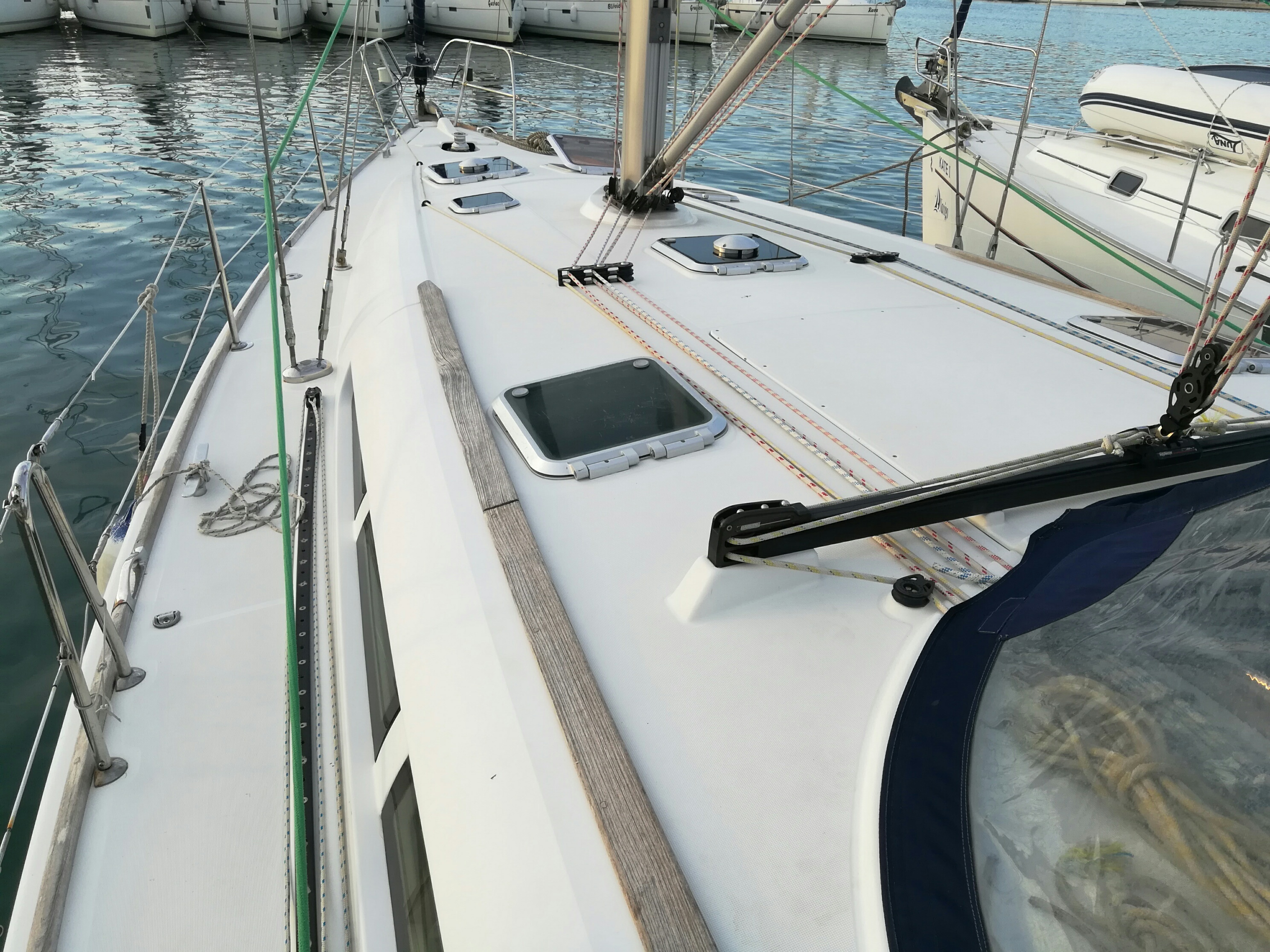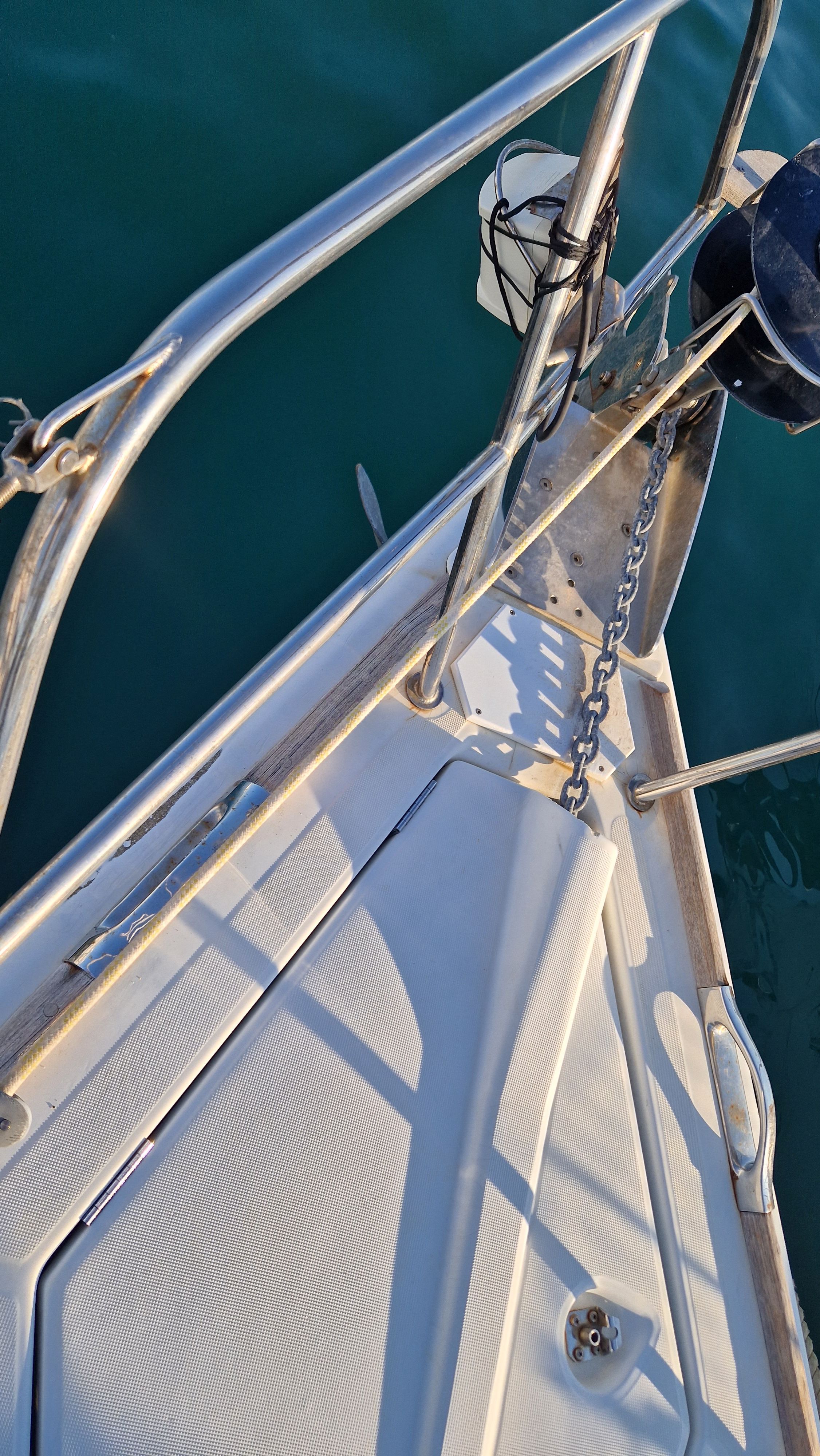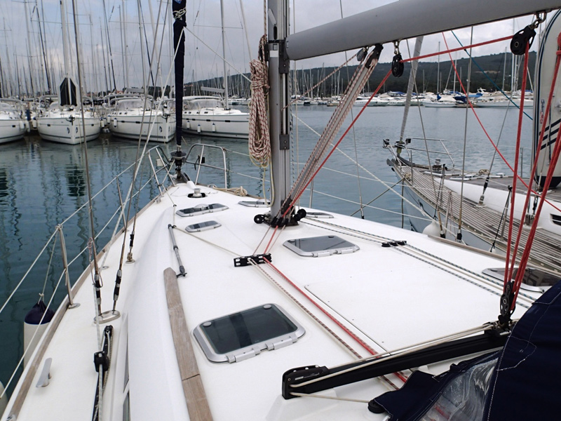 | Outside | 220 V-Landanschluss, Biminitop, Bootshaken, Cockpitdusche, Cockpitlautsprecher, Cockpitpolster, Cockpittisch, elektr. Ankerwinsch, Fender, Gangway, Solaranlage, Sprayhood, Wasserschlauch, Winschen |
