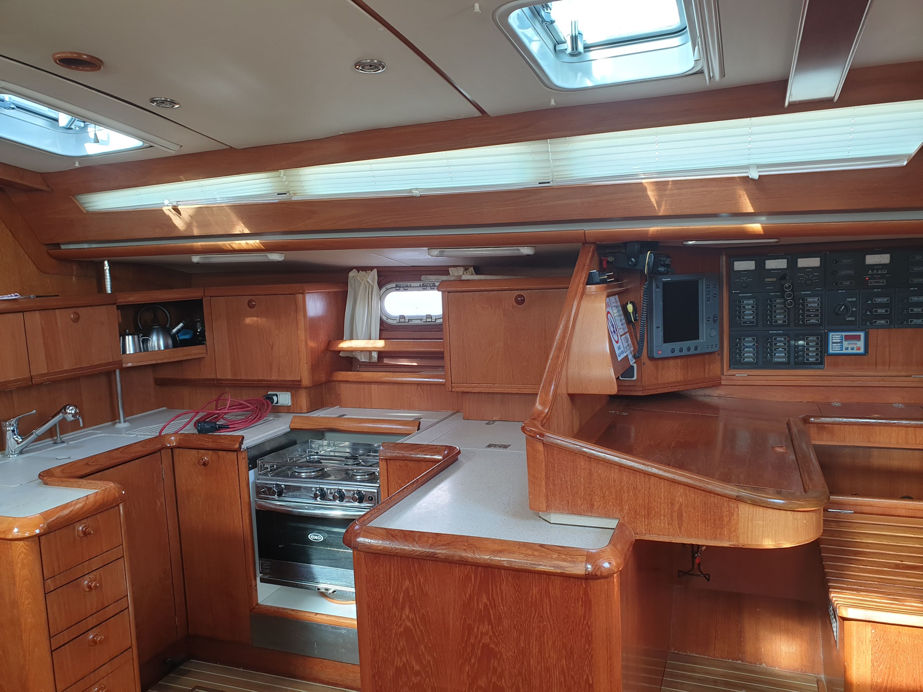 | Navigation | GPS mit Kartenplotter im Salon, Handpeilkompass, Kompass, Navigationsbesteck, Seekarten, Tridata (Log, Echolot, Windm.), Windmesser |