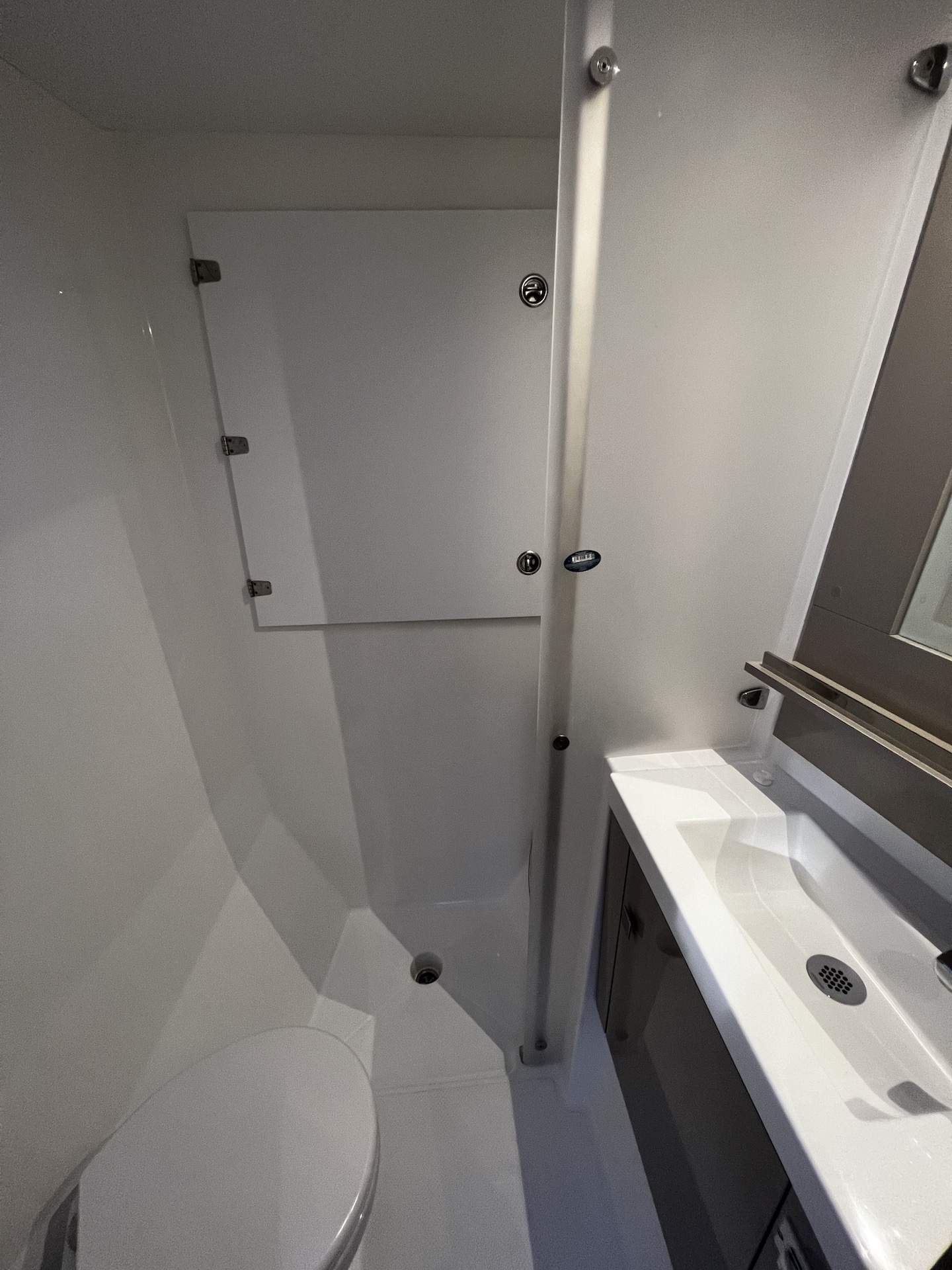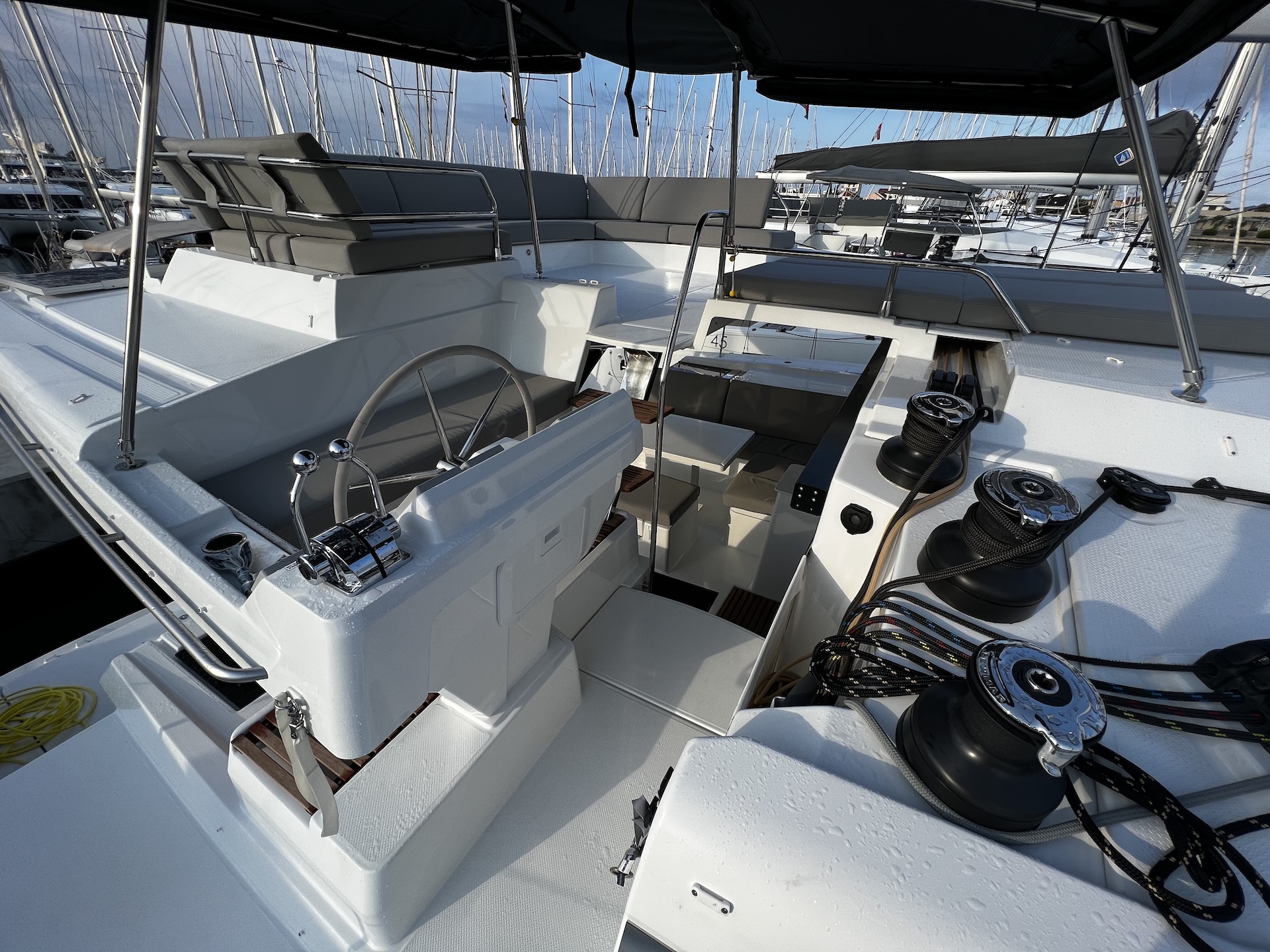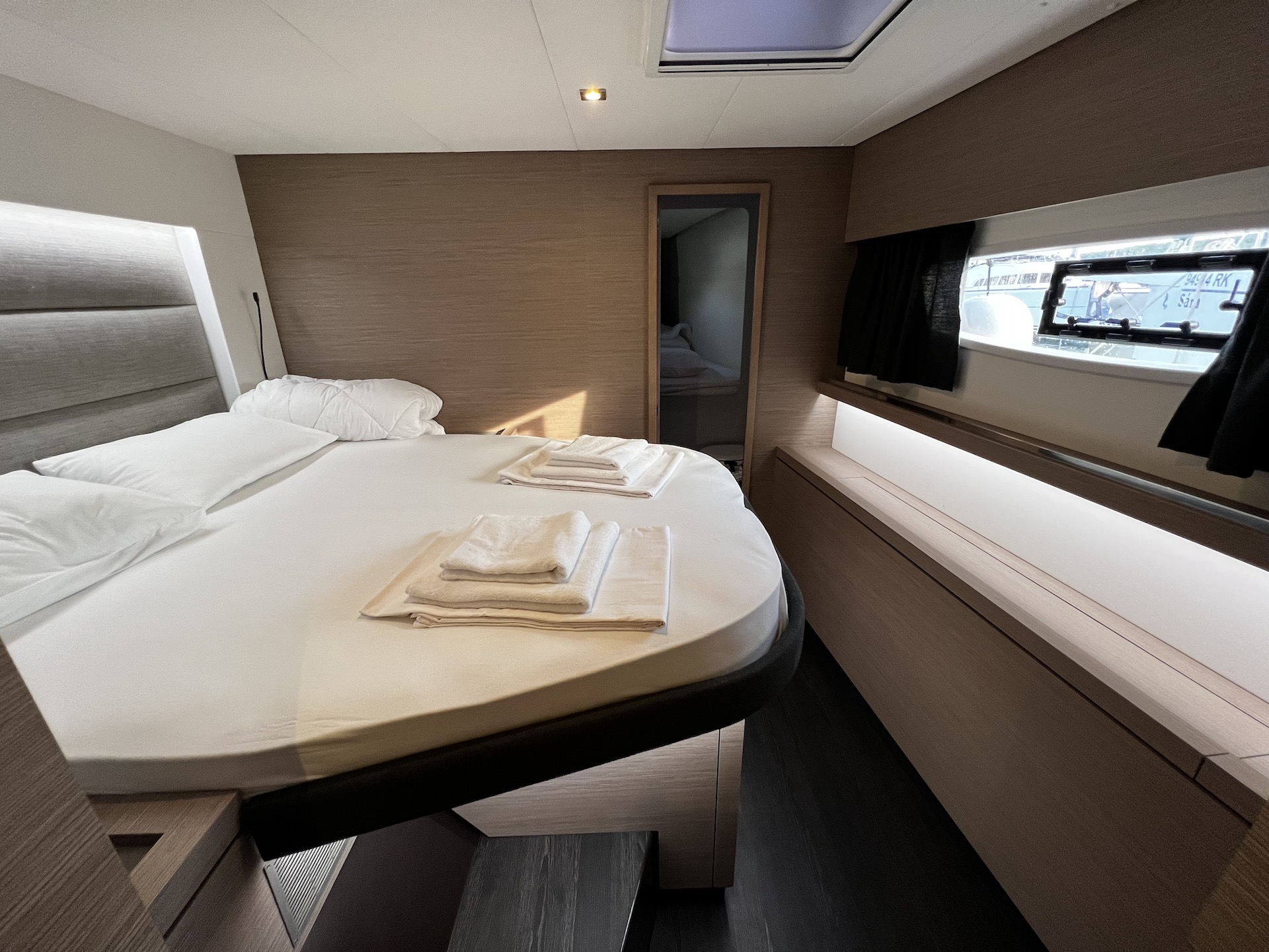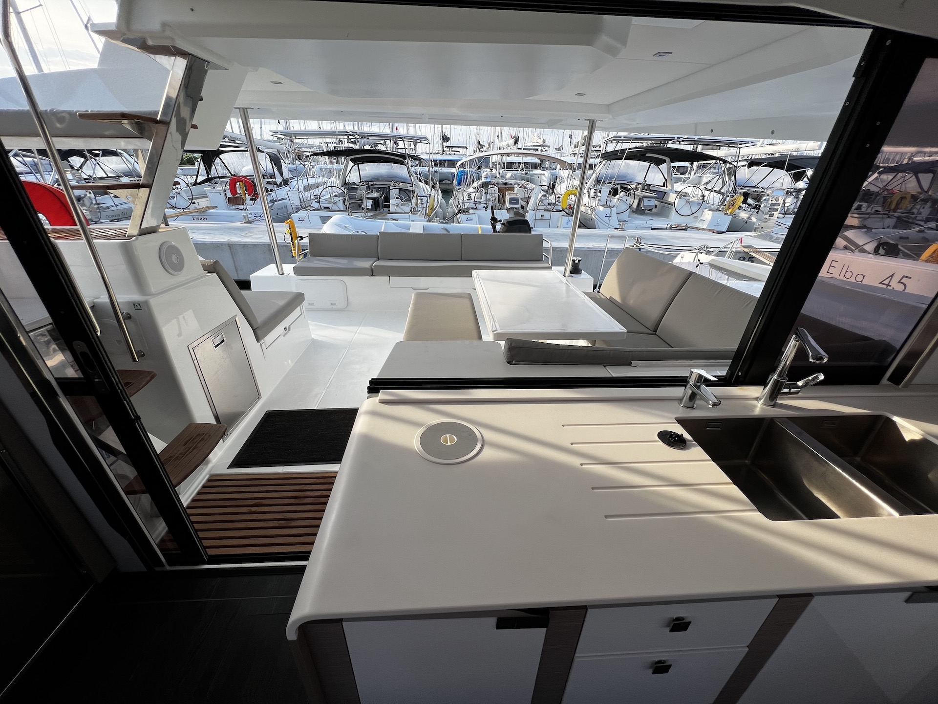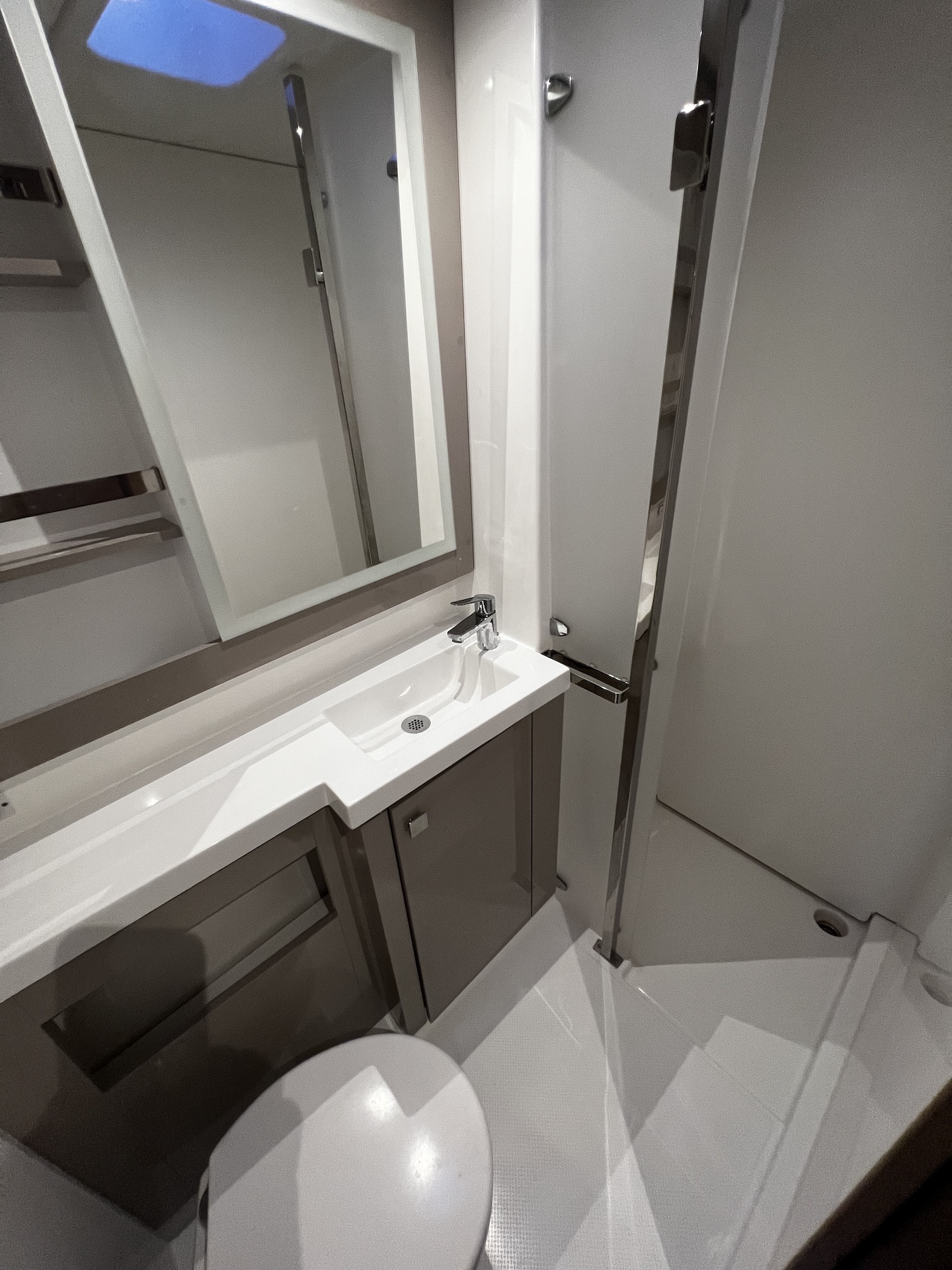 | Inside | Eiswürfelmaschine, Espresso Maschine, Gasherd mit Backofen, Generator, Inverter 12V/220V, Kaffeemaschine, Klimaanlage (Landstrom), Kühlschrank, Radio mit USB und Bluetooth, Salontisch absenkbar, Warmwasser, Watermaker, WC (elektr.) |