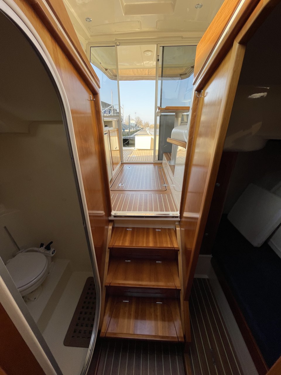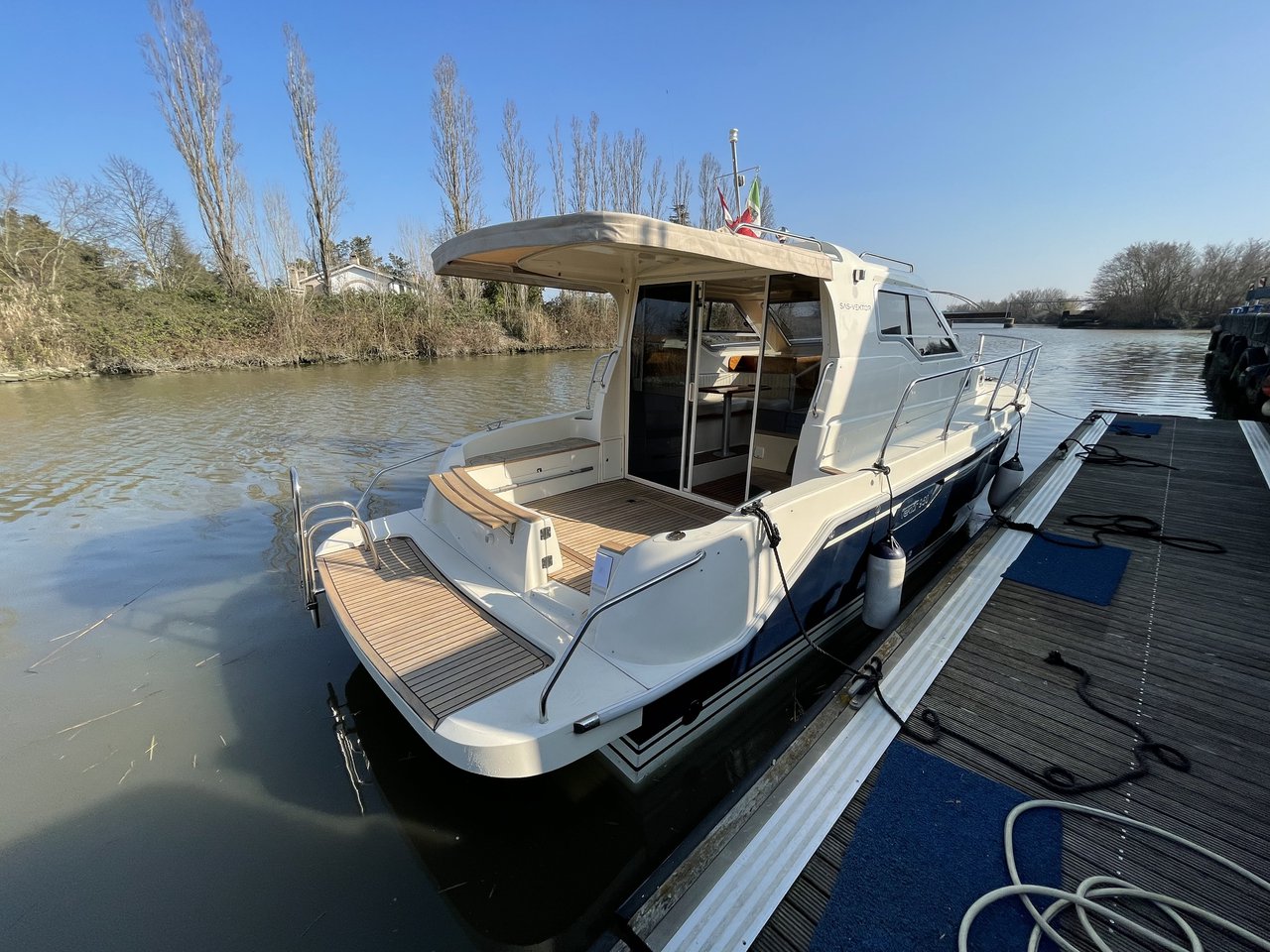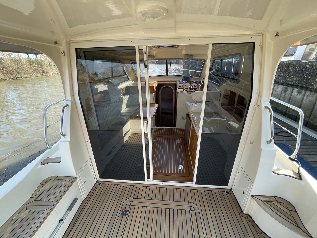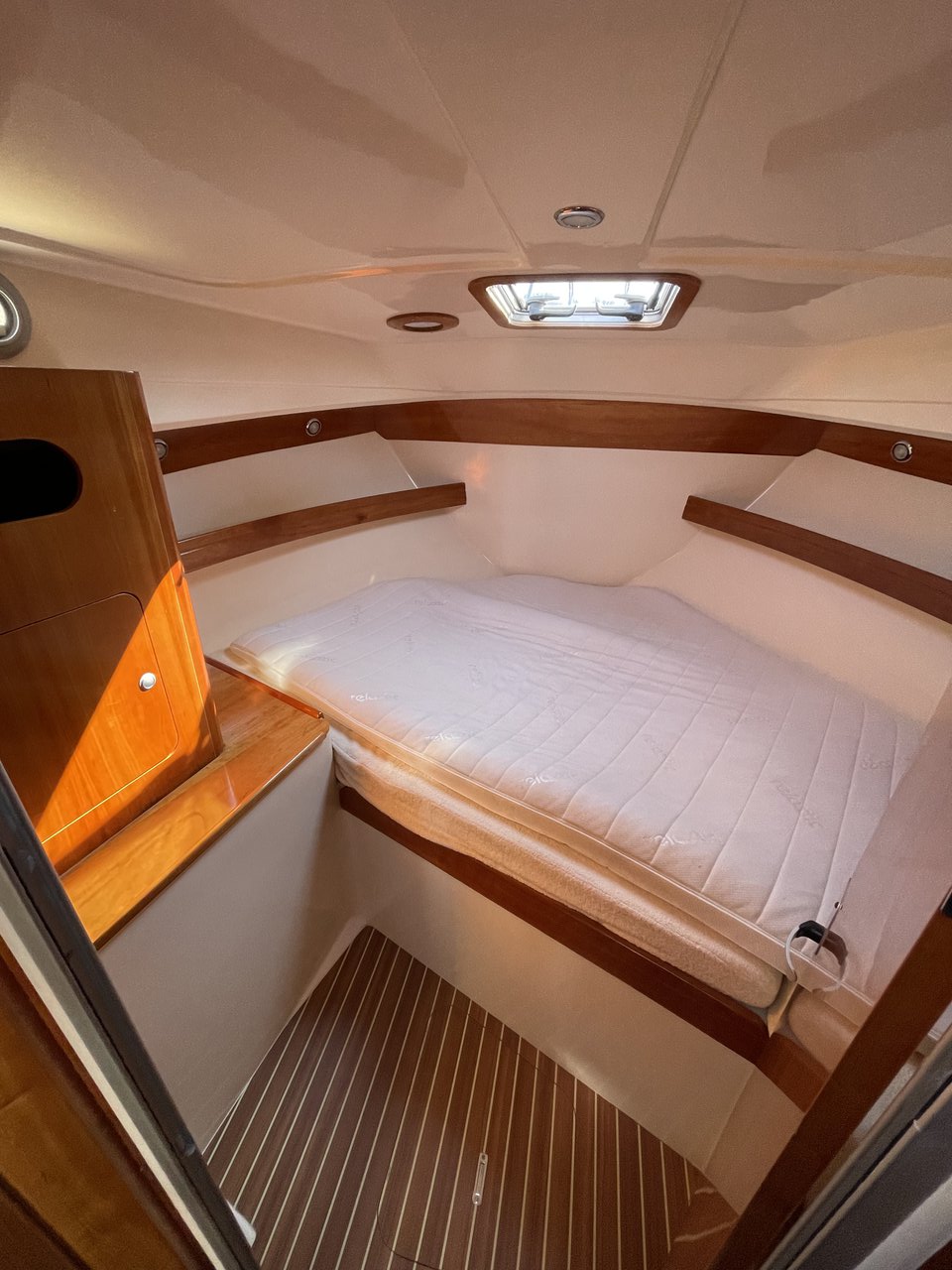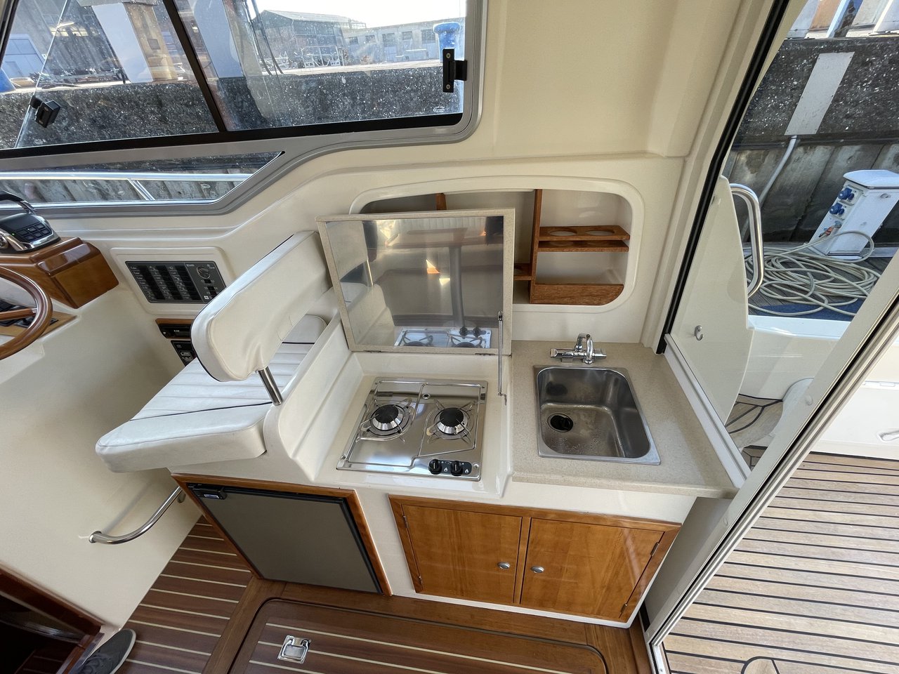 | Outside | 220 V-Landanschluss, Abnehmbarer Cockpittisch, Anker mit Kette, Badeplattform, Cockpitdusche, Cockpitlautsprecher, Cockpitpolster, Fender, Gangway, Hardtop, Kugelfender, Solaranlage, Teak im Cockpit |