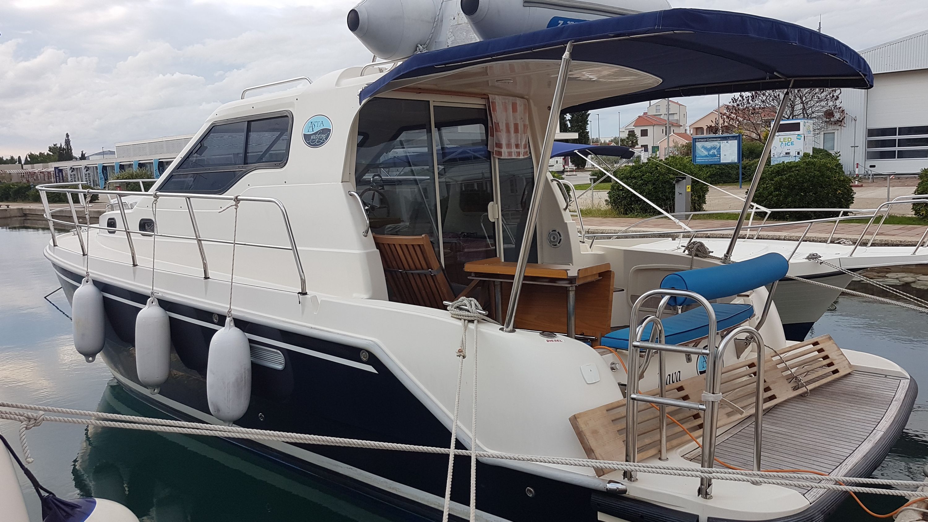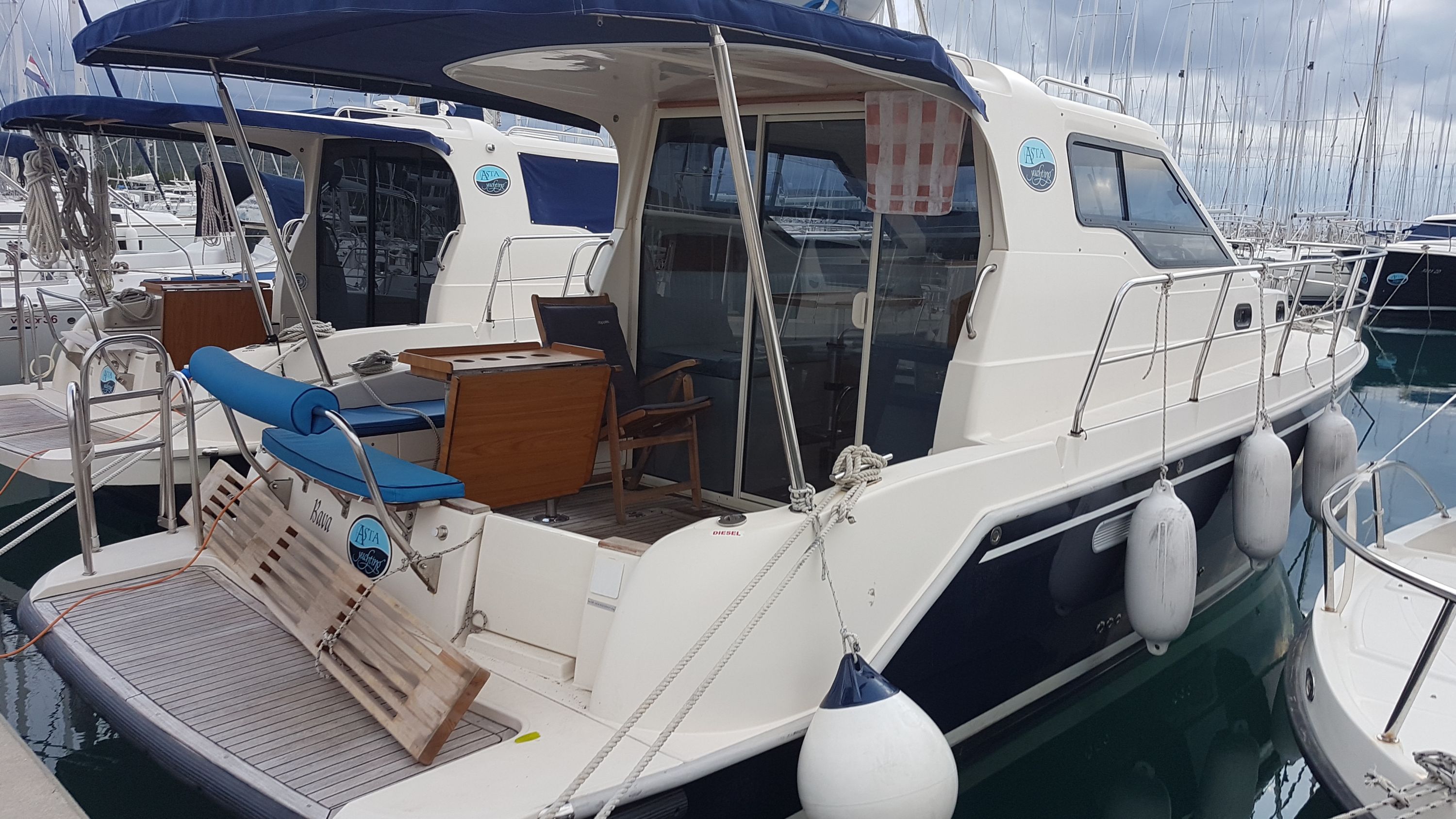 | Outside | Badeplattform, Bootshaken, Buganker, Cockpitdusche, Cockpitpolster, Cockpittisch, Deckbürste, Dieselkanister , Eimer mit Seil, elektr. Ankerwinsch, Fender, Festmacherleinen, Gangway, Solaranlage, Wasserschlauch |