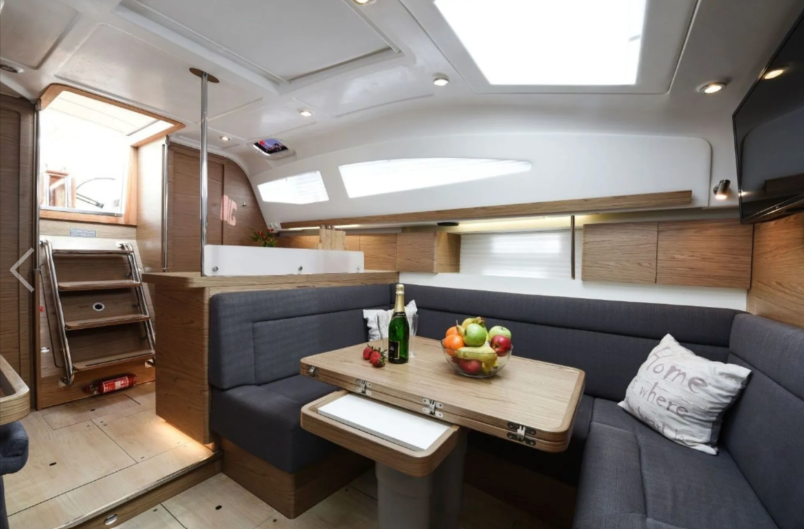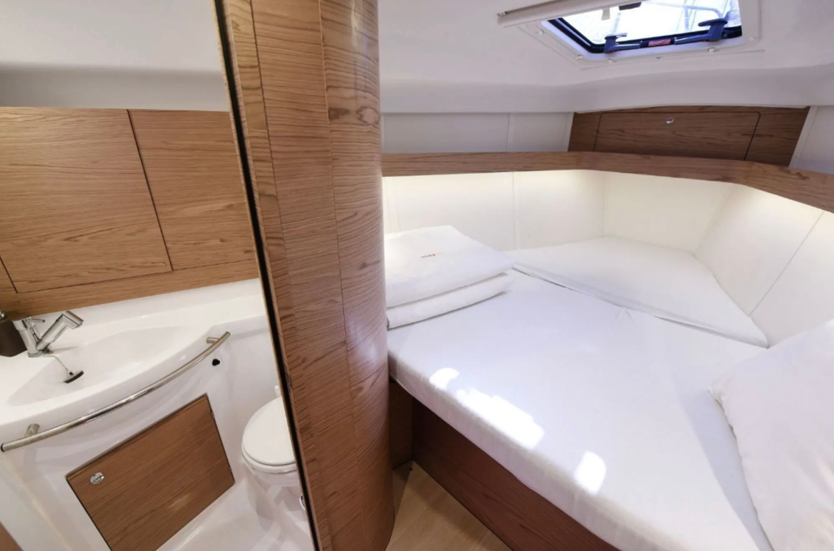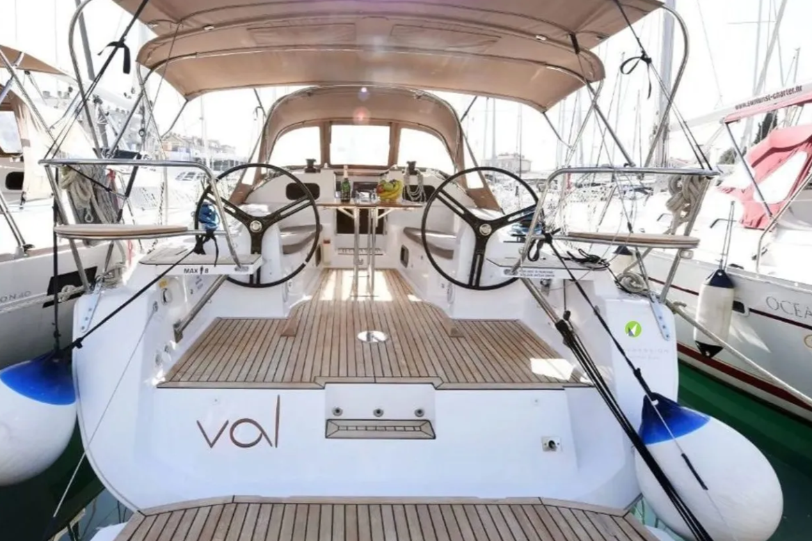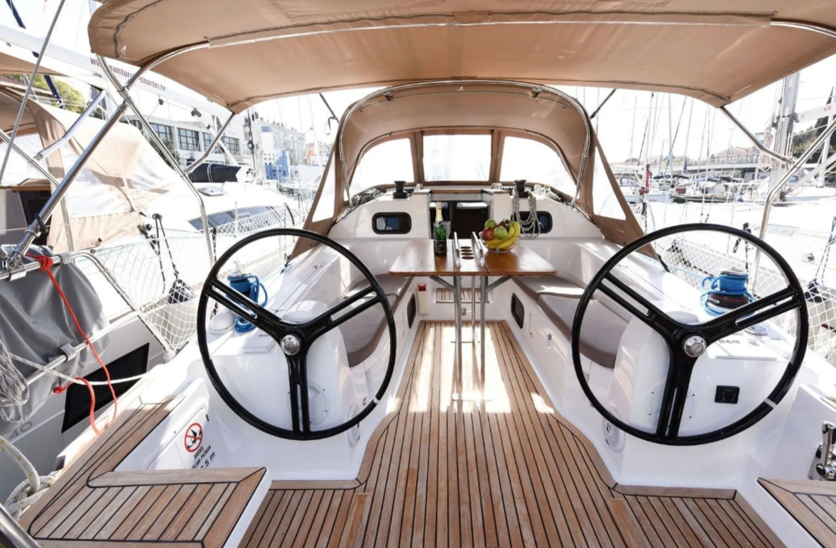 12 V-Anschluss, Anker mit Kette, Badeleiter, Badeplattform, Biminitop, Cockpitdusche, Cockpitlautsprecher, Cockpittisch, Deckbeleuchtung, Deckpolster, elektr. Ankerwinsch, Gangway, Solaranlage, Sonnendeck, Sprayhood, Teak im Cockpit, Windex |