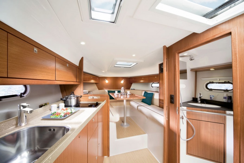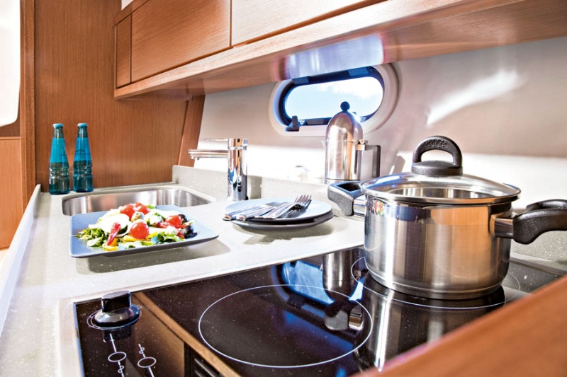 Outside 220 V-Landanschluss, Anker mit Kette, Badeleiter, Badeplattform, Biminitop, Cockpitdusche, Cockpitdusche warm/kalt, Cockpittisch, elektr. Ankerwinsch, Fender, Sprayhood, Teakdeck