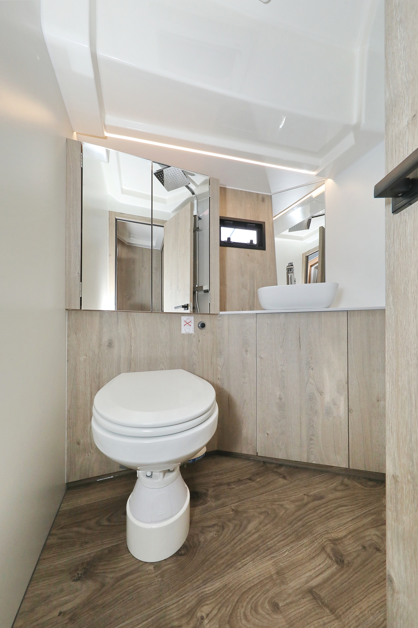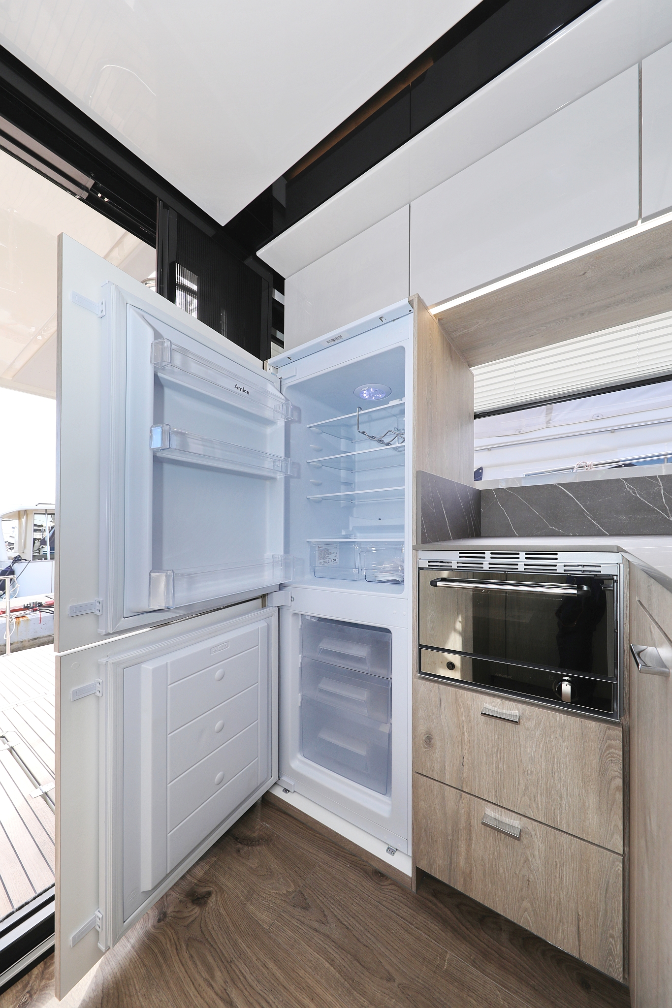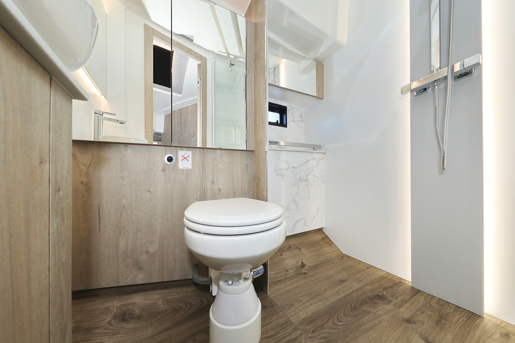 | Inside | 220V Steckdosen, 3-flammiger Gasherd, Backofen, Fäkalientank, Geschirrspüler, Heizung, Inverter 12V/220V, Kaffeemaschine, Klimaanlage, Kühlschrank, Ladegerät, Mokkakanne, Pantryausstattung, Radio, Salontisch absenkbar, Spülbecken, TV, USB Steckdosen in Salon und Kabinen, Wasserkocher, WC (elektr.) |