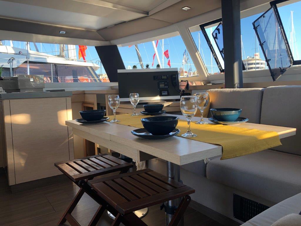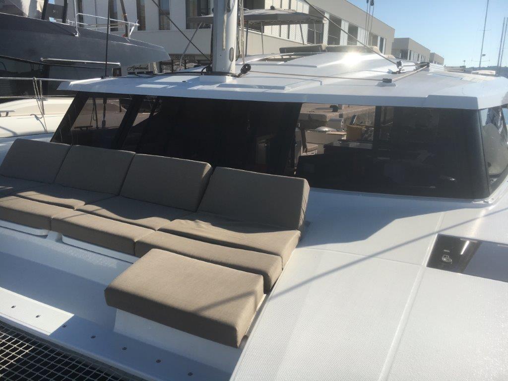 | Outside | 220 V-Landanschluss, Anker mit Kette, Biminitop, Bootshaken, Cockpitdusche warm/kalt, Cockpitkühlschrank, Cockpitlautsprecher, Cockpitpolster, Cockpittisch, elektr. Ankerwinsch, elektr. Davits, elektr. Großwinsch, Fender, Gangway, Grill, Kuchenbude, Kugelfender, Solaranlage |