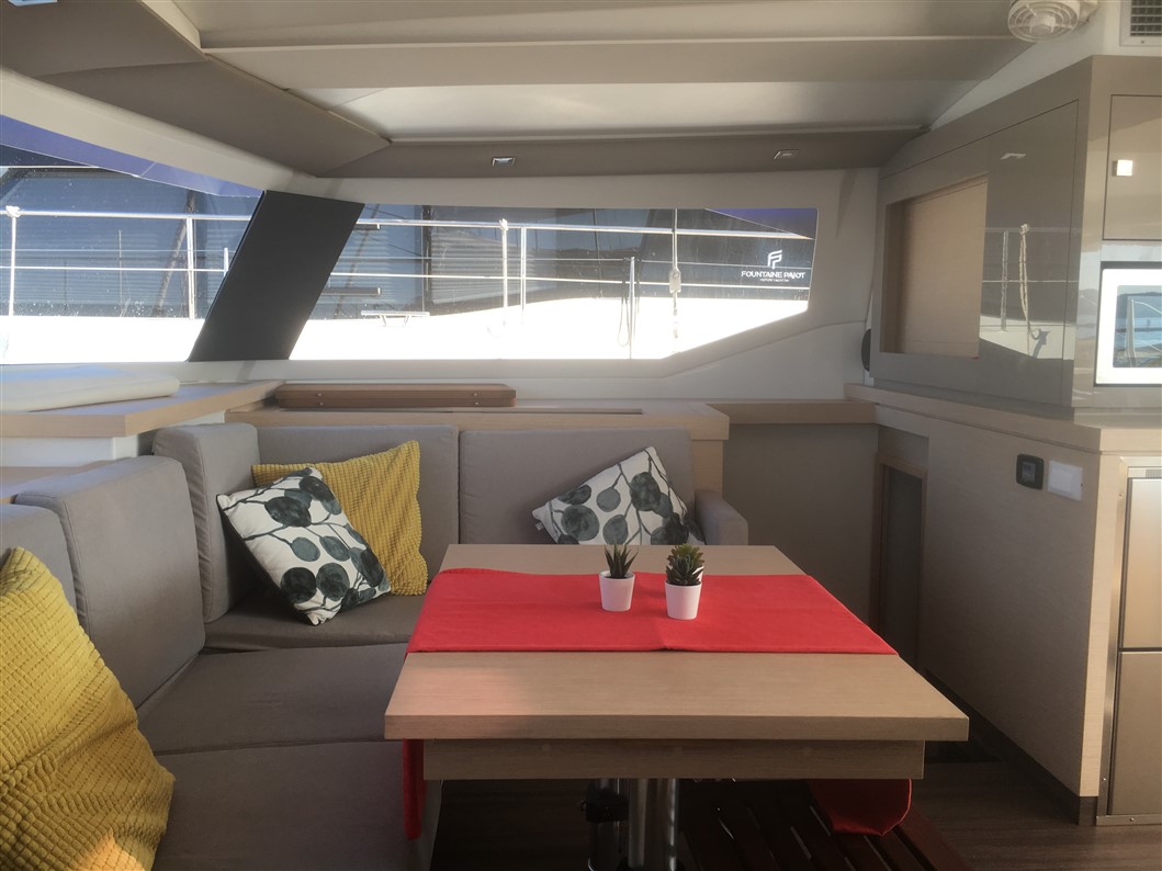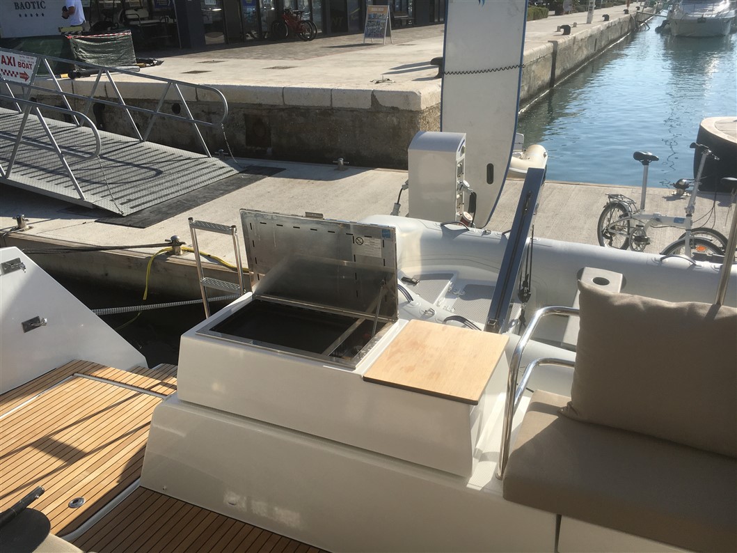 | Outside | 220 V-Landanschluss, Anker mit Kette, Biminitop, Bootshaken, Cockpitdusche warm/kalt, Cockpitkühlschrank, Cockpitlautsprecher, Cockpitpolster, Cockpittisch, elektr. Ankerwinsch, elektr. Davits, elektr. Großwinsch, Fender, Gangway, Grill, Kuchenbude, Kugelfender, Solaranlage, Unterwasserbeleuchtung |