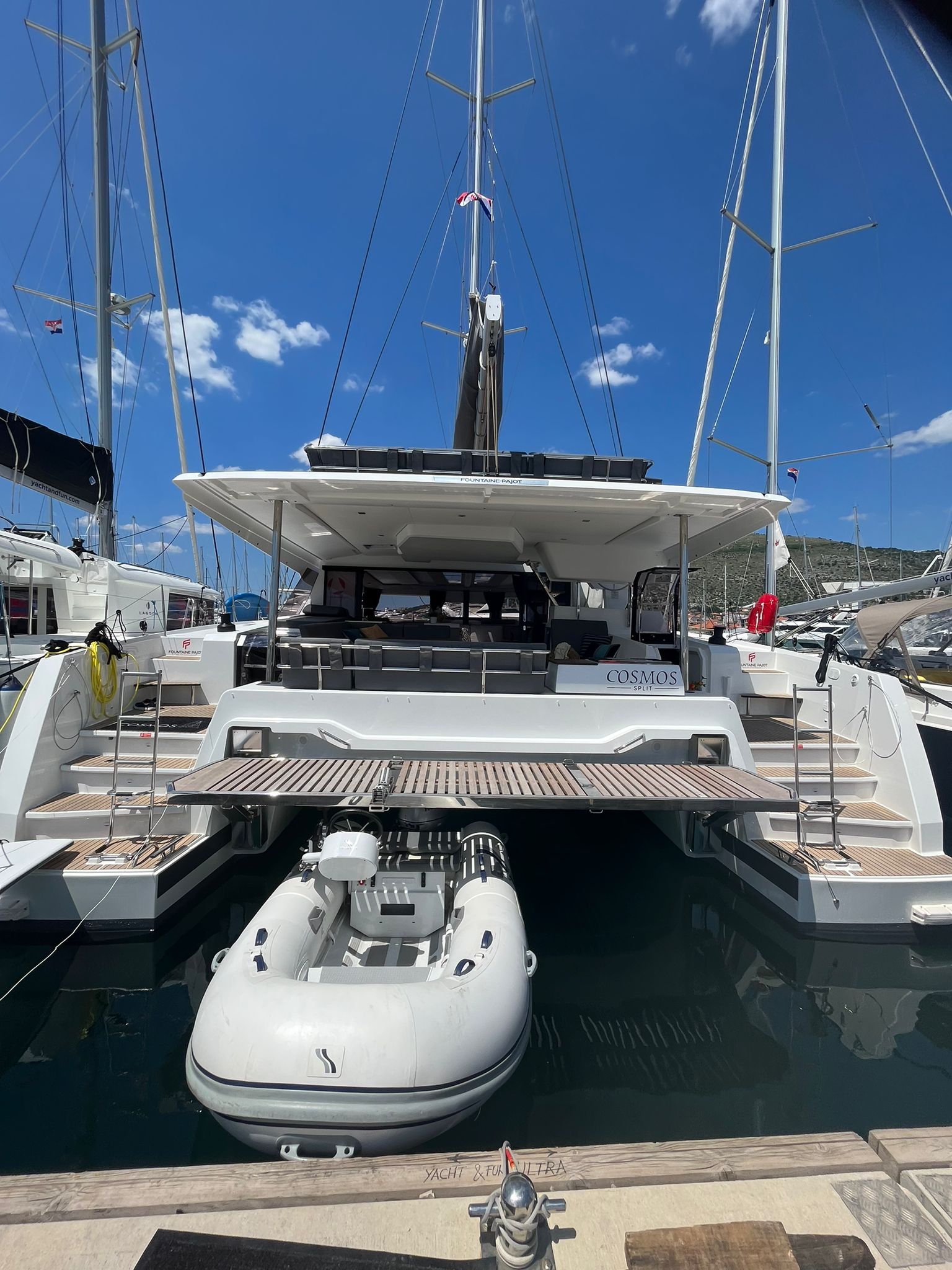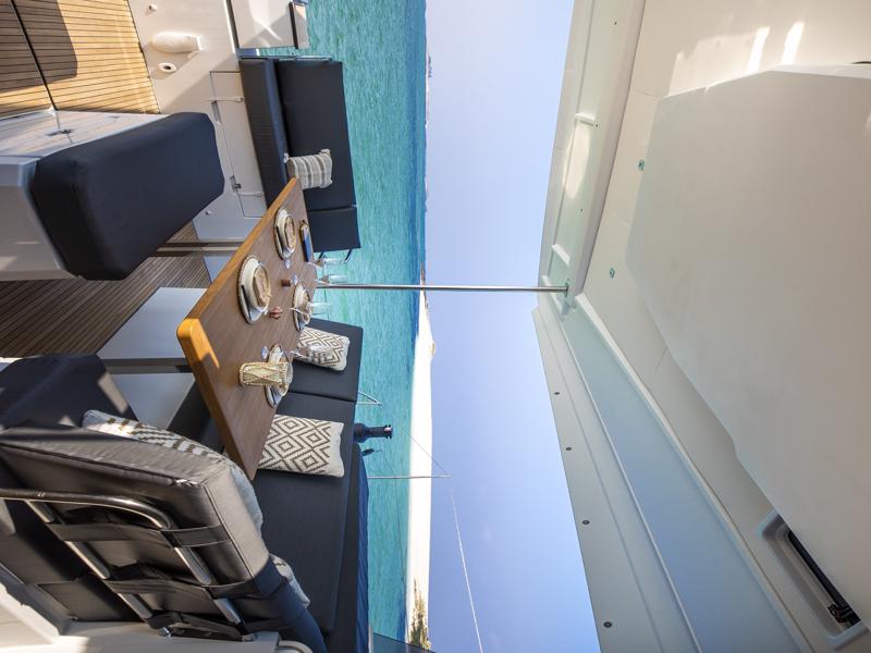 | Outside | 220 V-Landanschluss, Anker mit Kette, Badeplattform, Biminitop, Bootshaken, Cockpitdusche warm/kalt, Cockpitkühlschrank, Cockpitlautsprecher, Cockpitleuchte, Cockpitpolster, Cockpittisch, elektr. Ankerwinsch, elektr. Davits, elektr. Genuawinsch, elektr. Großwinsch, Fender, Gangway, Grill, Kuchenbude, Kugelfender, Solaranlage, Unterwasserbeleuchtung |