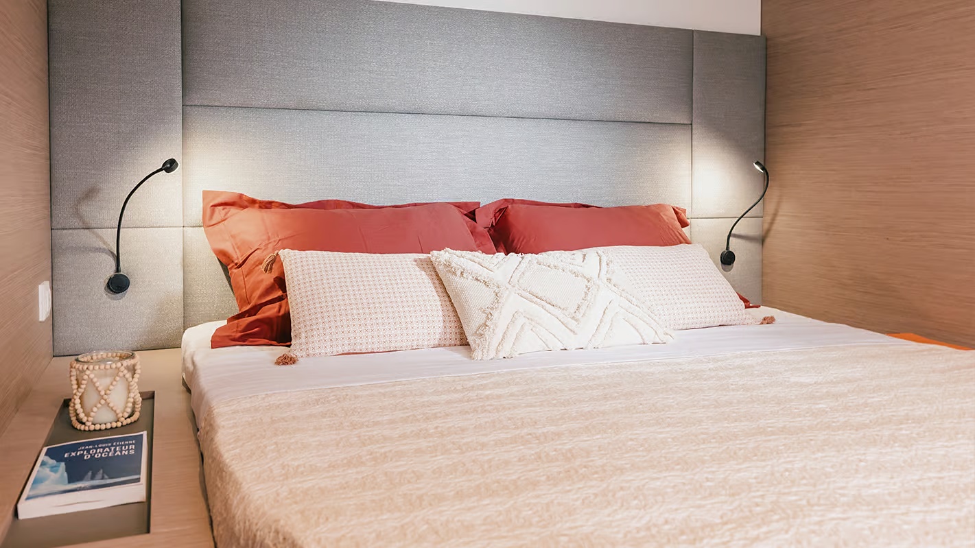 | Inside | 12V/220V-Steckdosen, Fäkalientank, Generator, Geschirrspüler, Heizung, Kaffeemaschine, Klimaanlage, Kühlschrank, Ladegerät, Mikrowelle, Pantryausstattung, Radio, Salontisch absenkbar, Ventilatoren in Kabinen, Warmwasser, Watermaker, WC (elektr.) |