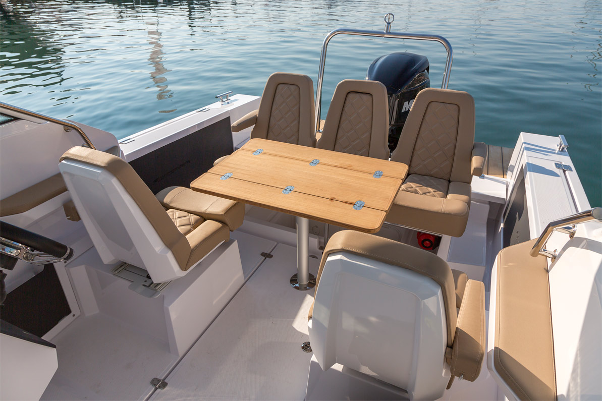 Outside Anker mit Kette, Biminitop, Cockpitdusche, Cockpitkühlschrank, Cockpitlautsprecher, Cockpittisch, Deckpolster, elektr. Ankerwinsch, Teak im Cockpit