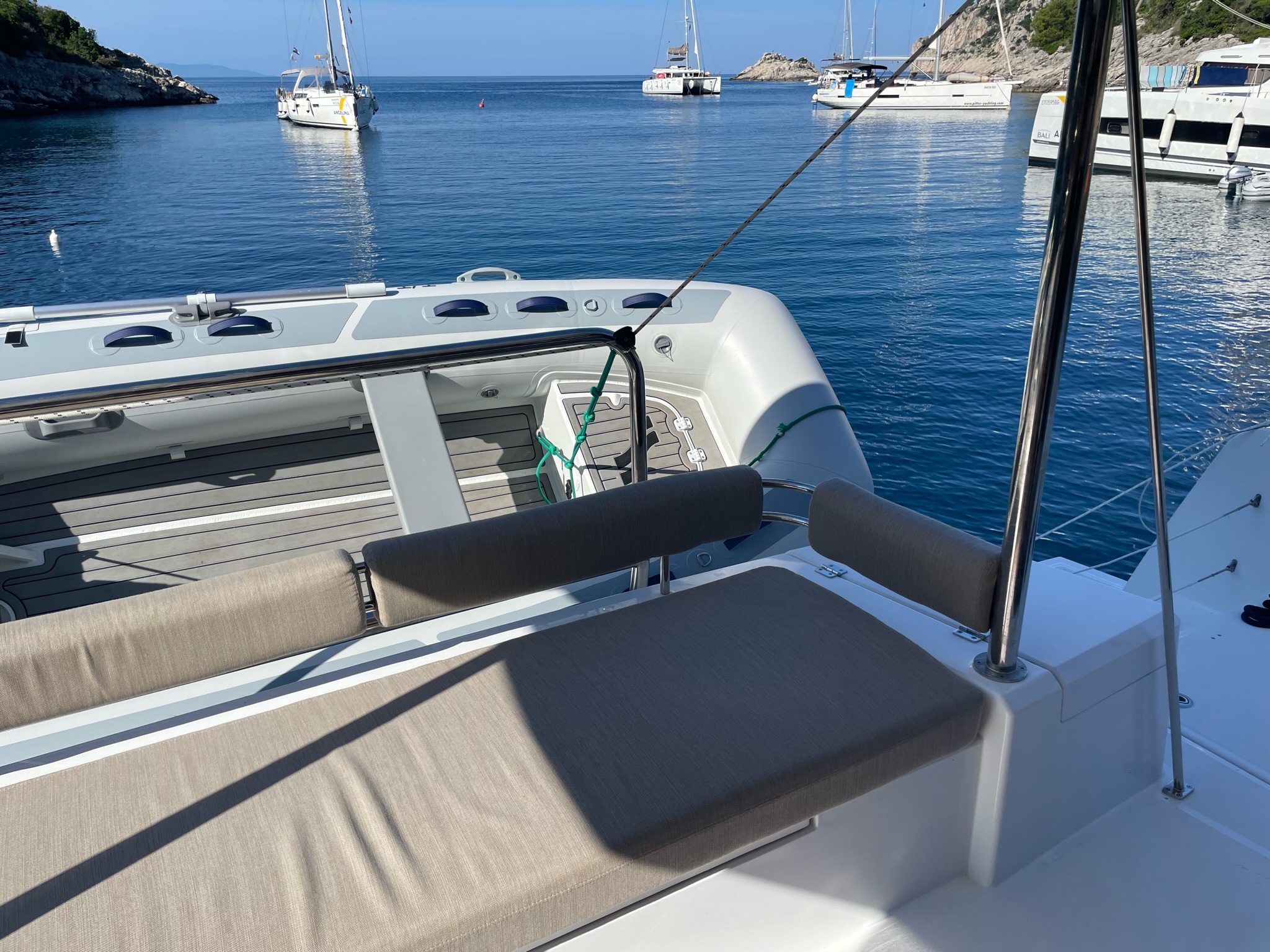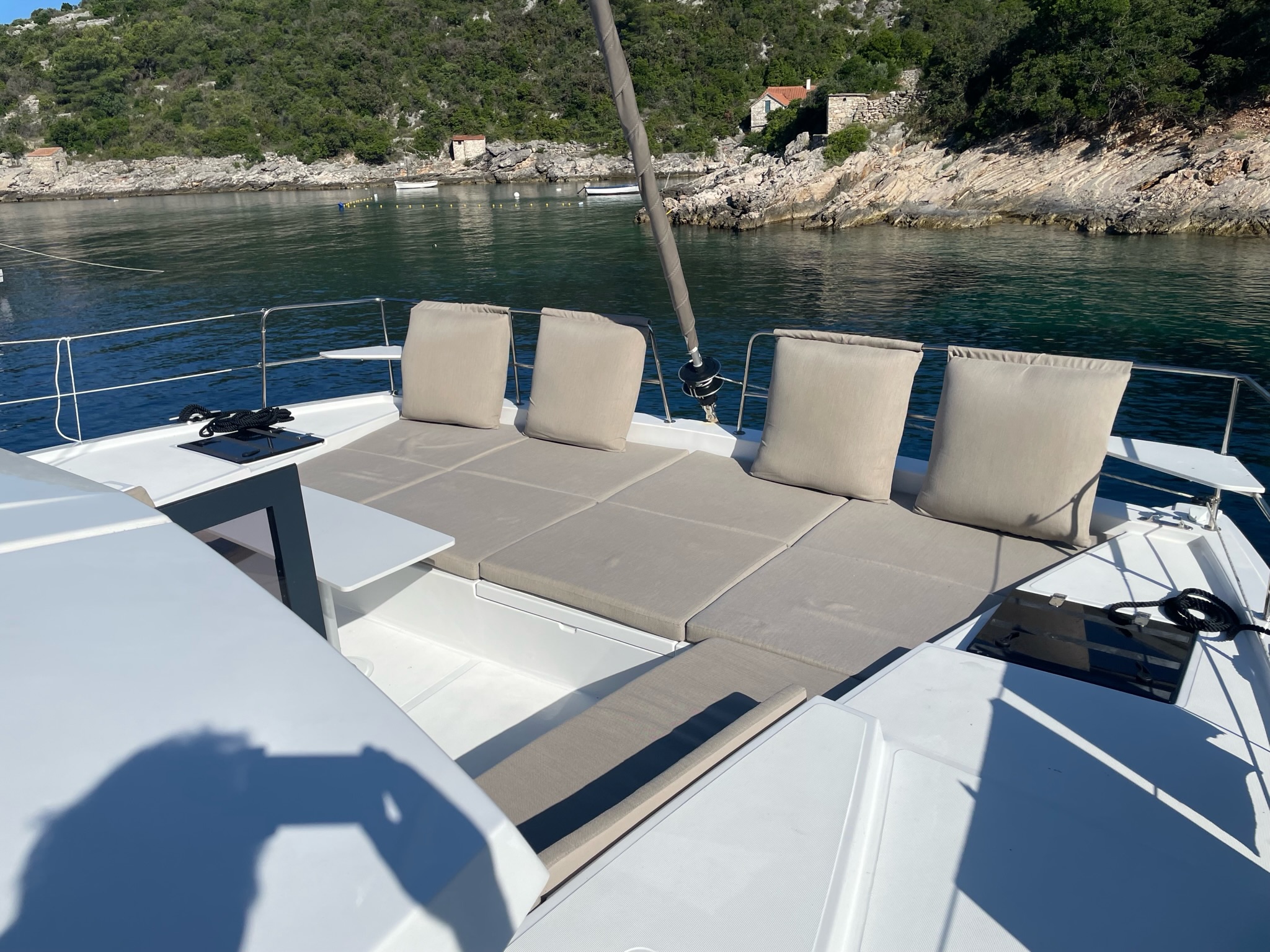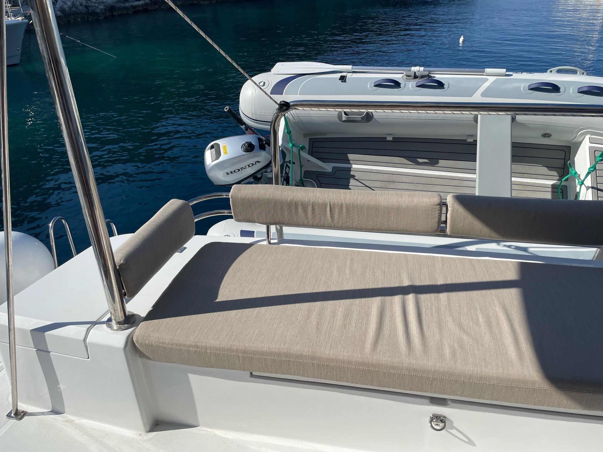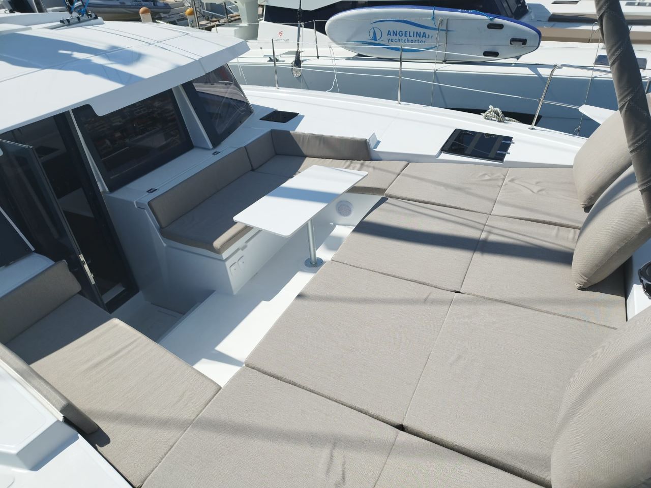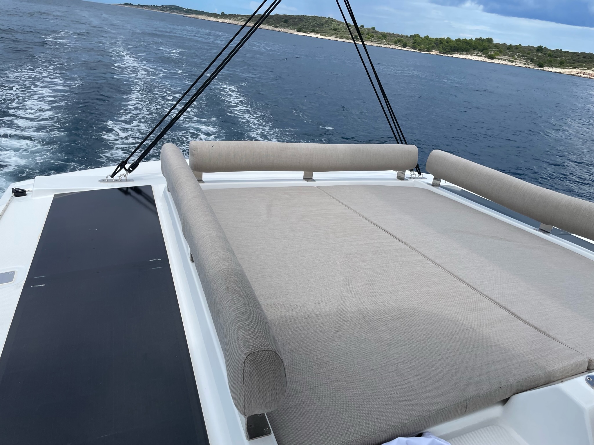 | Outside | 12 V-Anschluss, 220 V-Landanschluss, Anker mit Kette, Bootshaken, Cockpitdusche, Cockpitlautsprecher, Cockpitpolster, Cockpittisch, Deckpolster, elektr. Ankerwinsch, elektr. Winsch, Fender, Festmacherleinen, Gangway, Grill, Hardtop, Solaranlage, Sonnendeck, Wasserschlauch, Winschen |