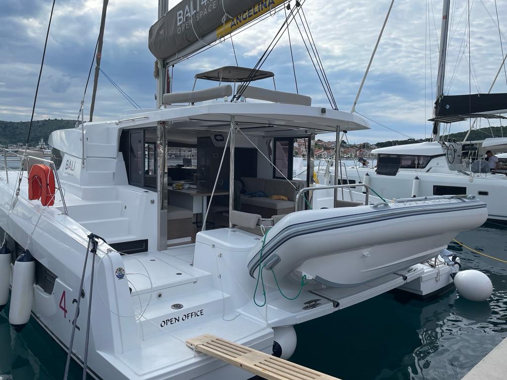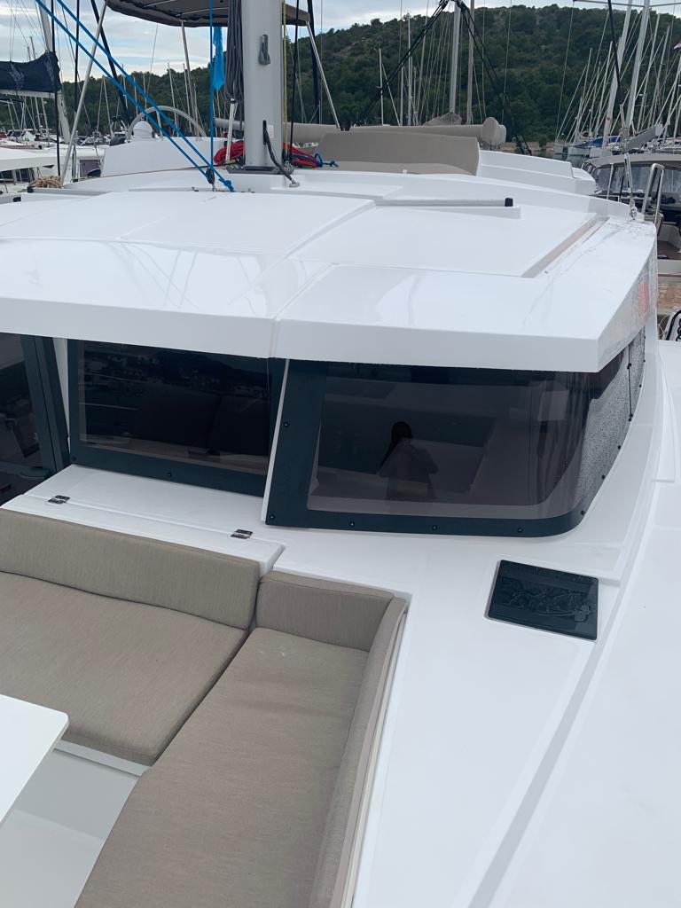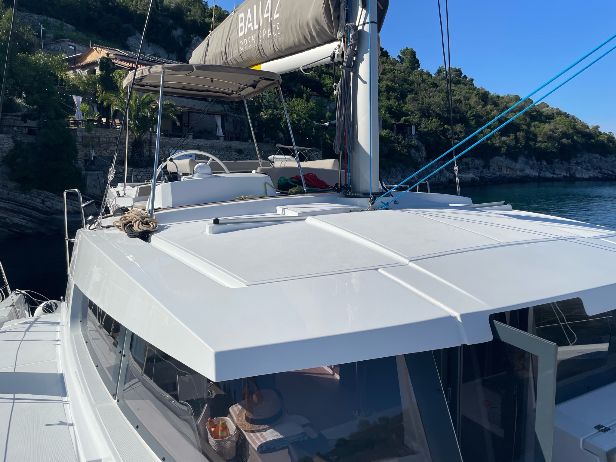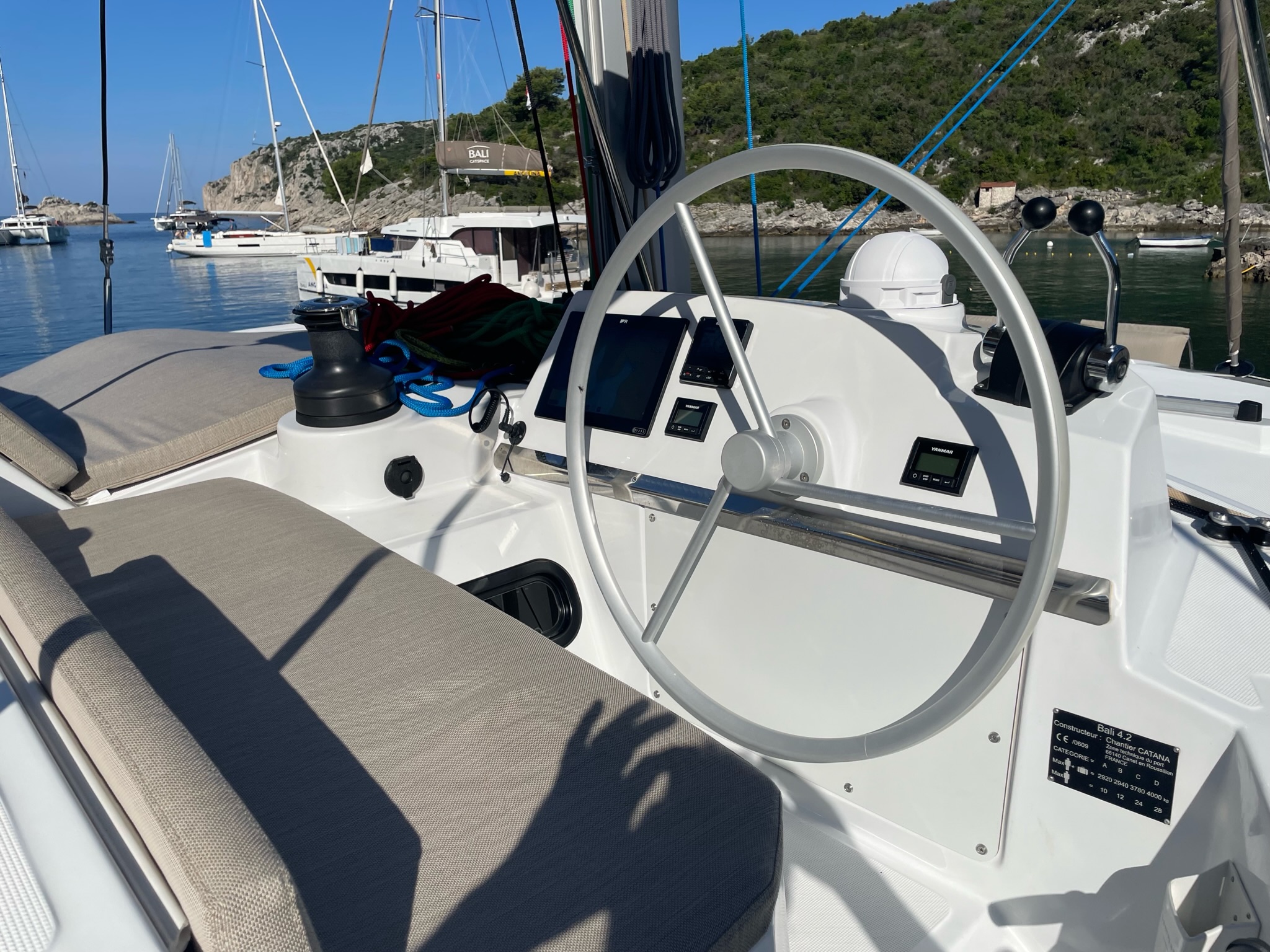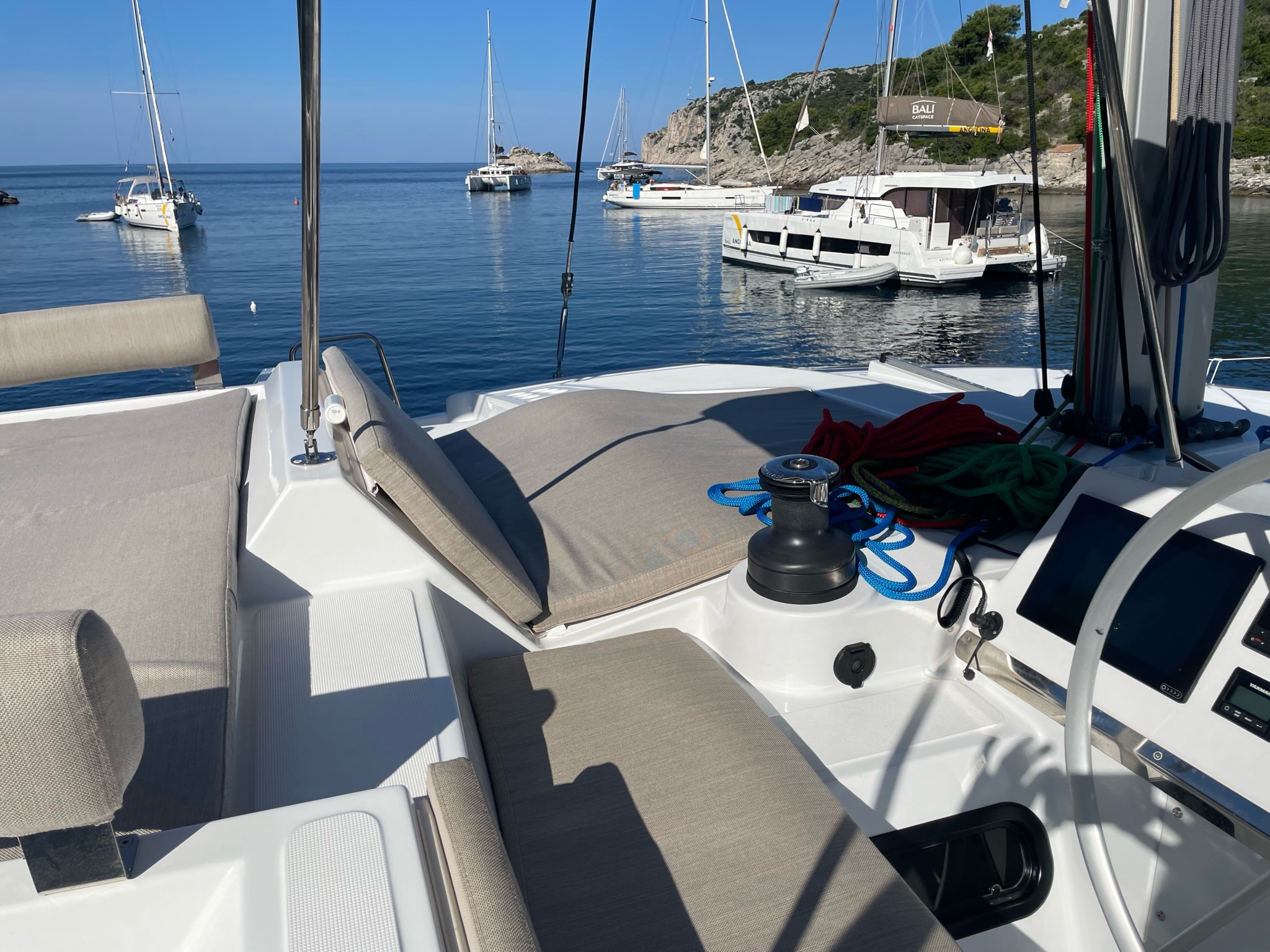 | Outside | 12 V-Anschluss, 220 V-Landanschluss, Anker mit Kette, Bootshaken, Cockpitdusche, Cockpitlautsprecher, Cockpitpolster, Cockpittisch, Deckpolster, elektr. Ankerwinsch, elektr. Winsch, Fender, Festmacherleinen, Gangway, Grill, Hardtop, Solaranlage, Sonnendeck, Wasserschlauch, Winschen |