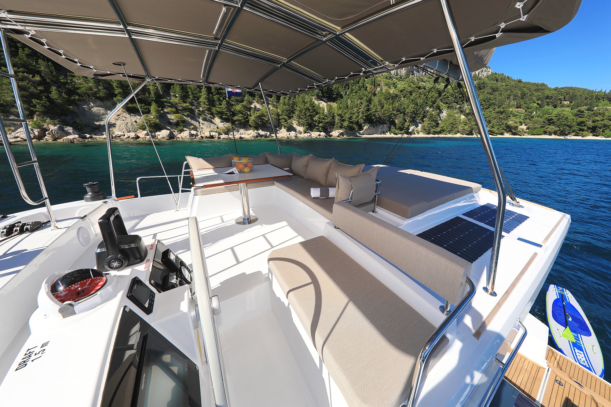 | Outside | Badeplattform, Biminitop, Cockpitdusche, Cockpitlautsprecher, Cockpitpolster, Cockpittisch, Deckpolster, Flybridge, Polster auf Flybridge, Solaranlage, Teak im Cockpit |