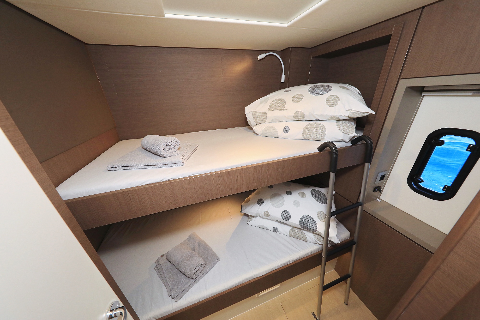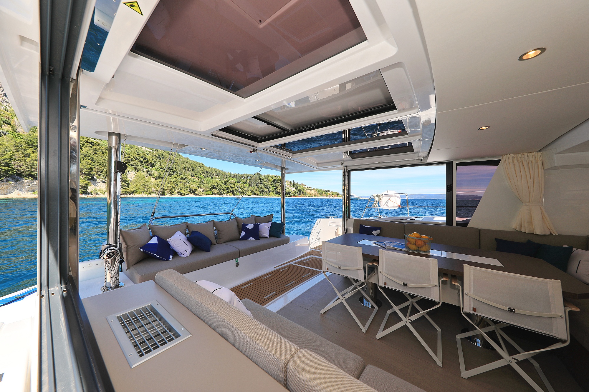 | Inside | FUSION Sound System, Gasherd mit Backofen, Gefrierschrank, Generator, Geschirrspüler, Heizung, Inverter 12V/220V, Kaffeemaschine, Klimaanlage (ohne Landstrombedarf), Kühlschrank, Ladegerät, LCD Fernseher, Mikrowelle, Pantryausstattung, Radio mit CD, Warmwasser, Waschmaschine mit Trockner, Watermaker, WC (elektr.) |