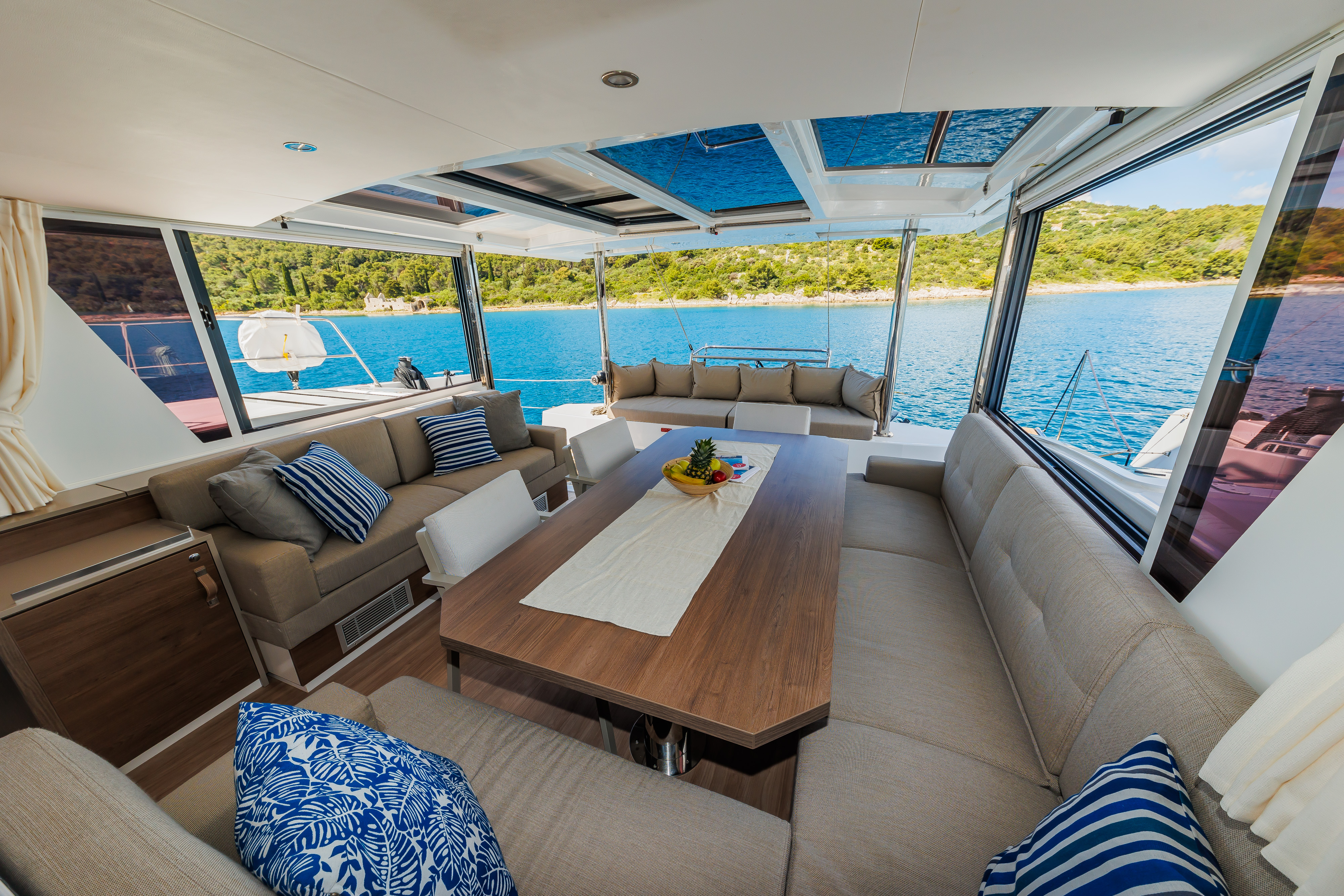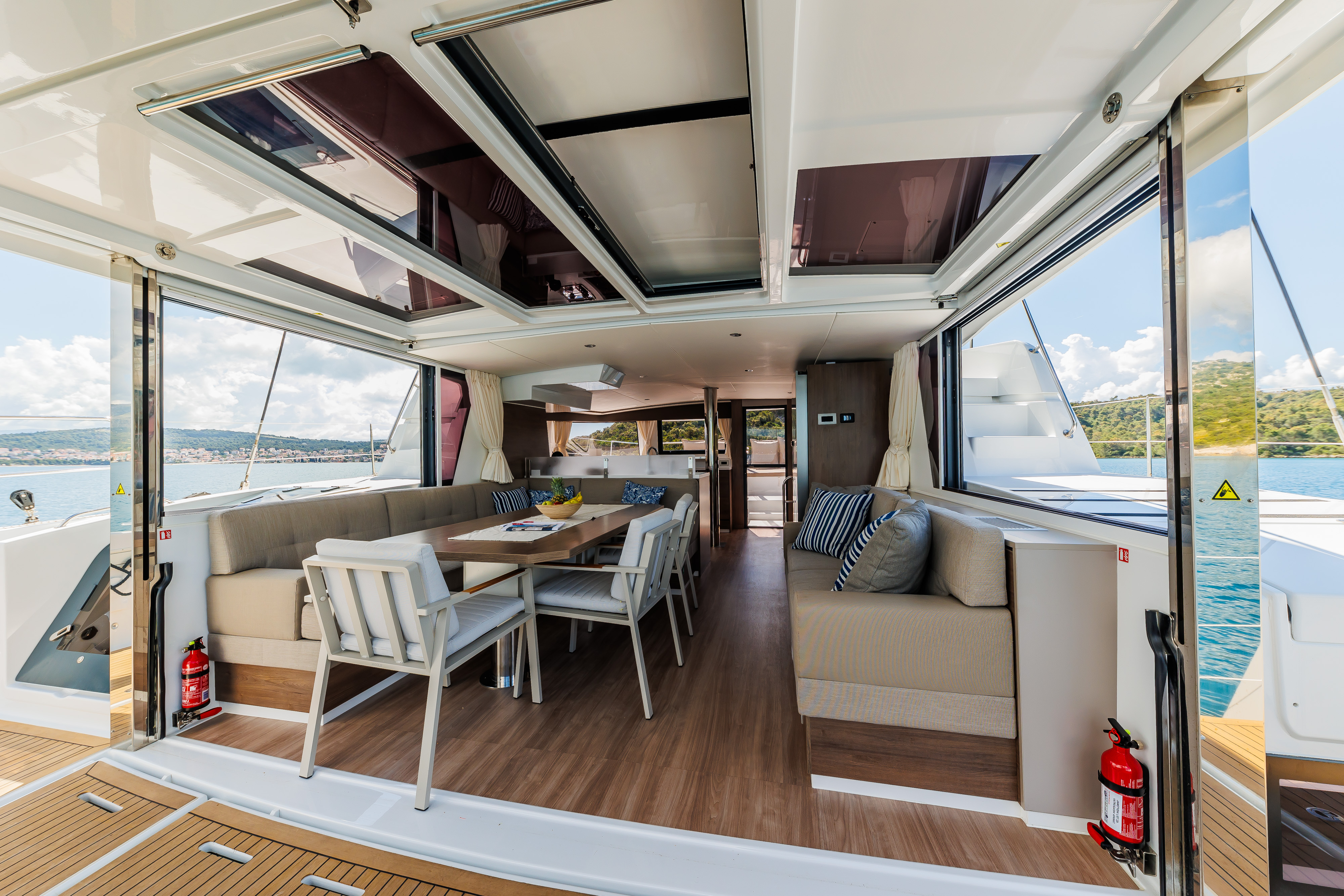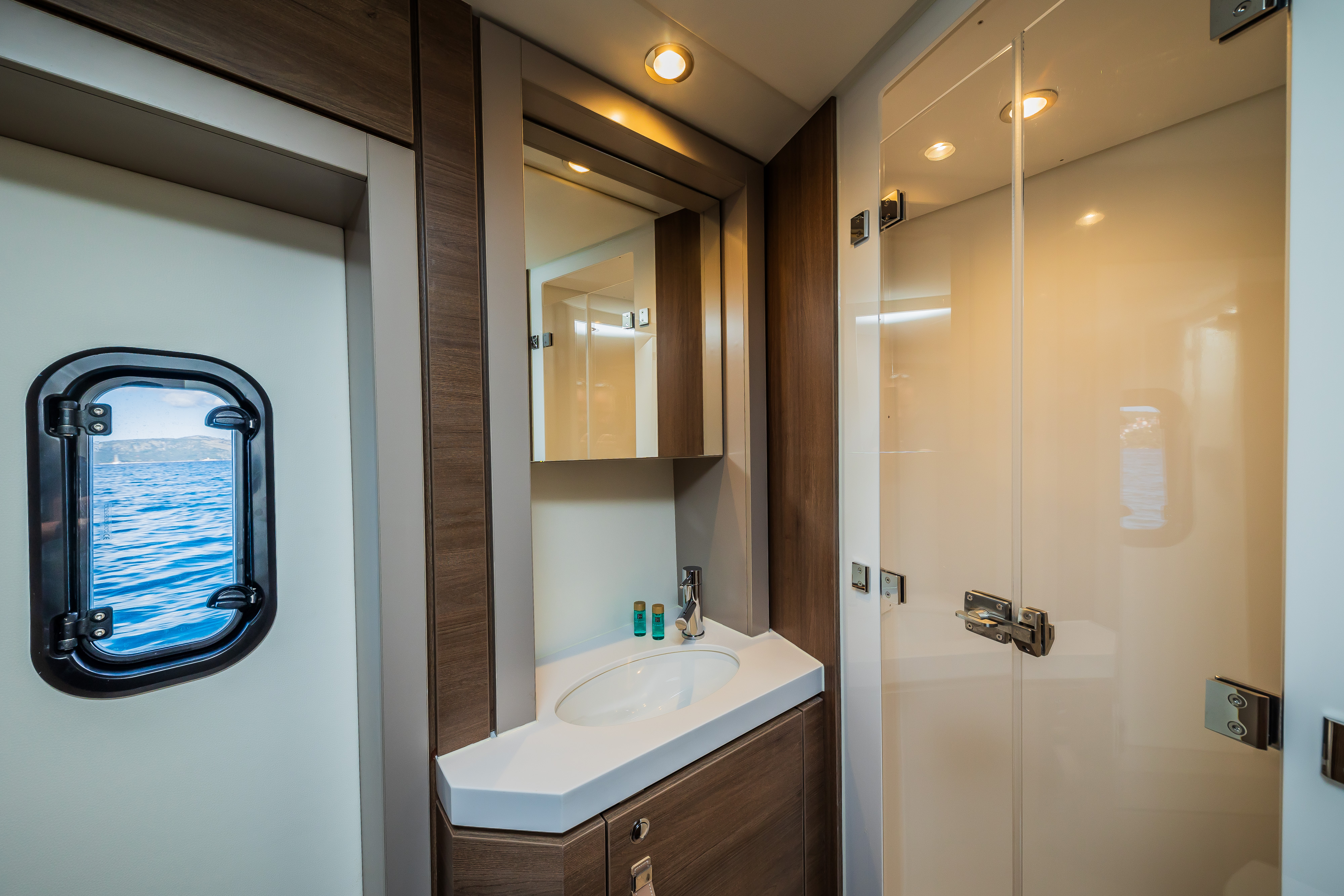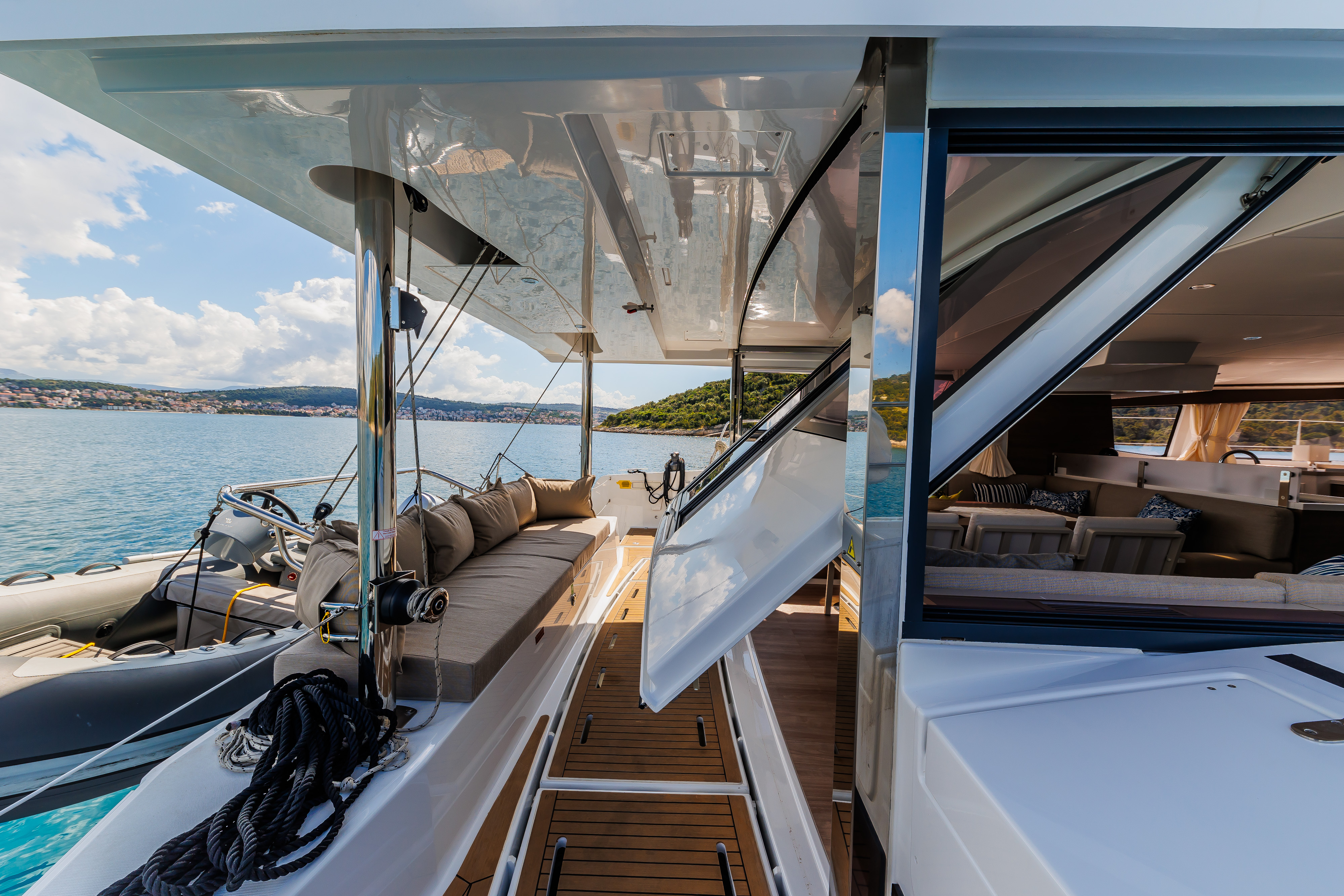 | Outside | Badeplattform, Biminitop, Cockpitdusche, Cockpitlautsprecher, Cockpitpolster, Cockpittisch, Deckpolster, elektr. Ankerwinsch, elektr. Großwinsch, elektr. Winsch, Grill, hydraul. Gangway, Polster auf Flybridge, Solaranlage, Teak im Cockpit |