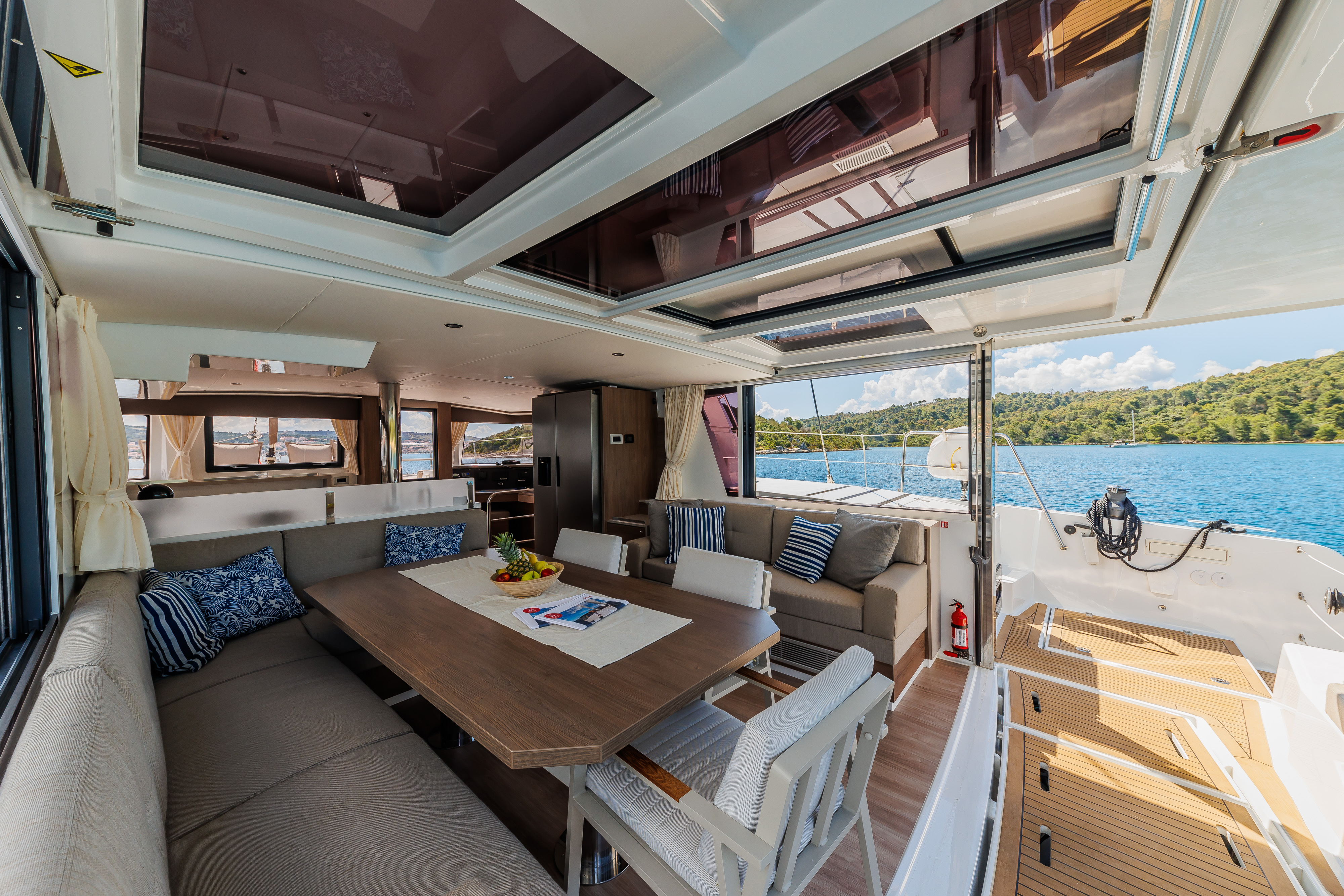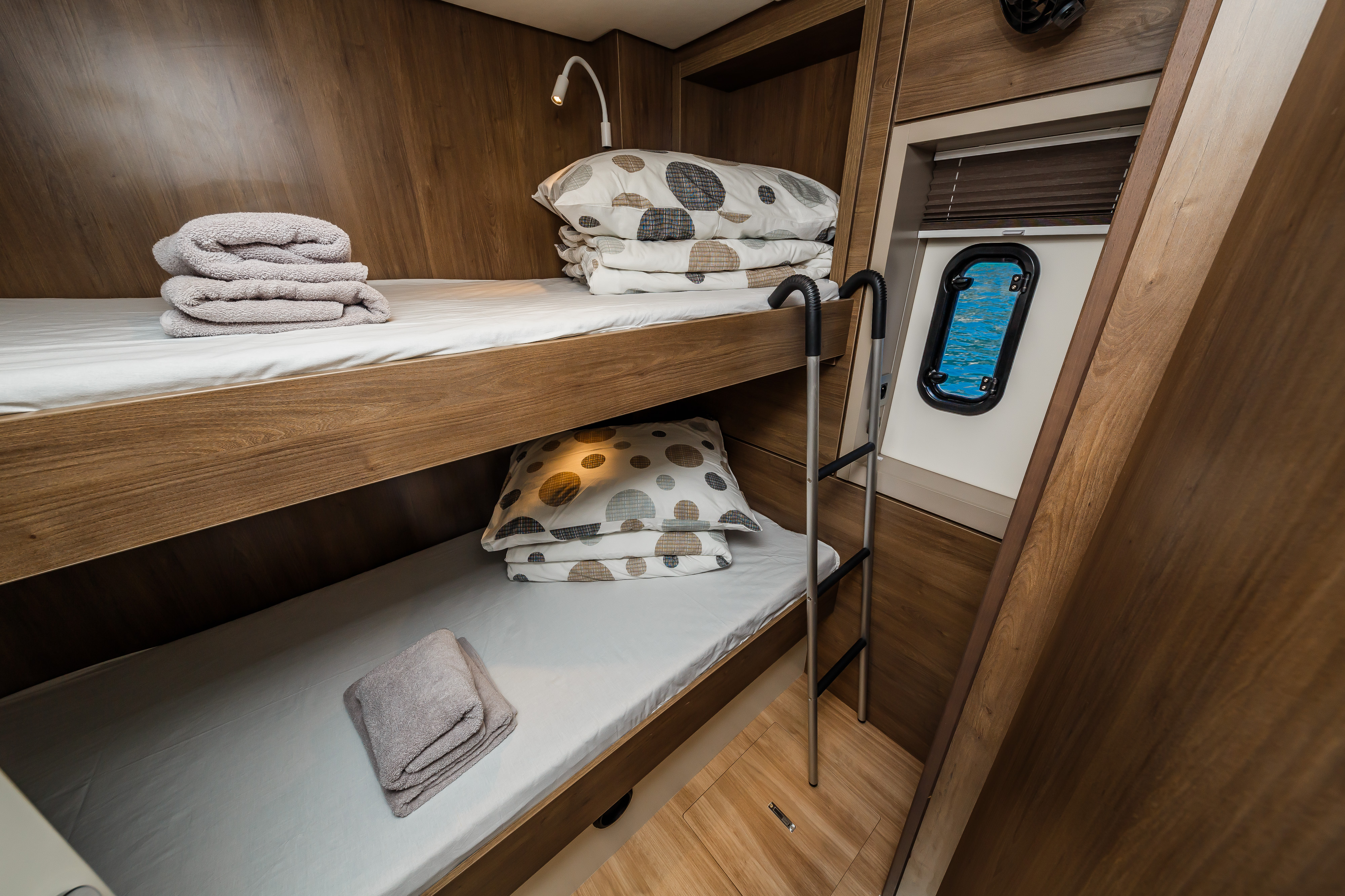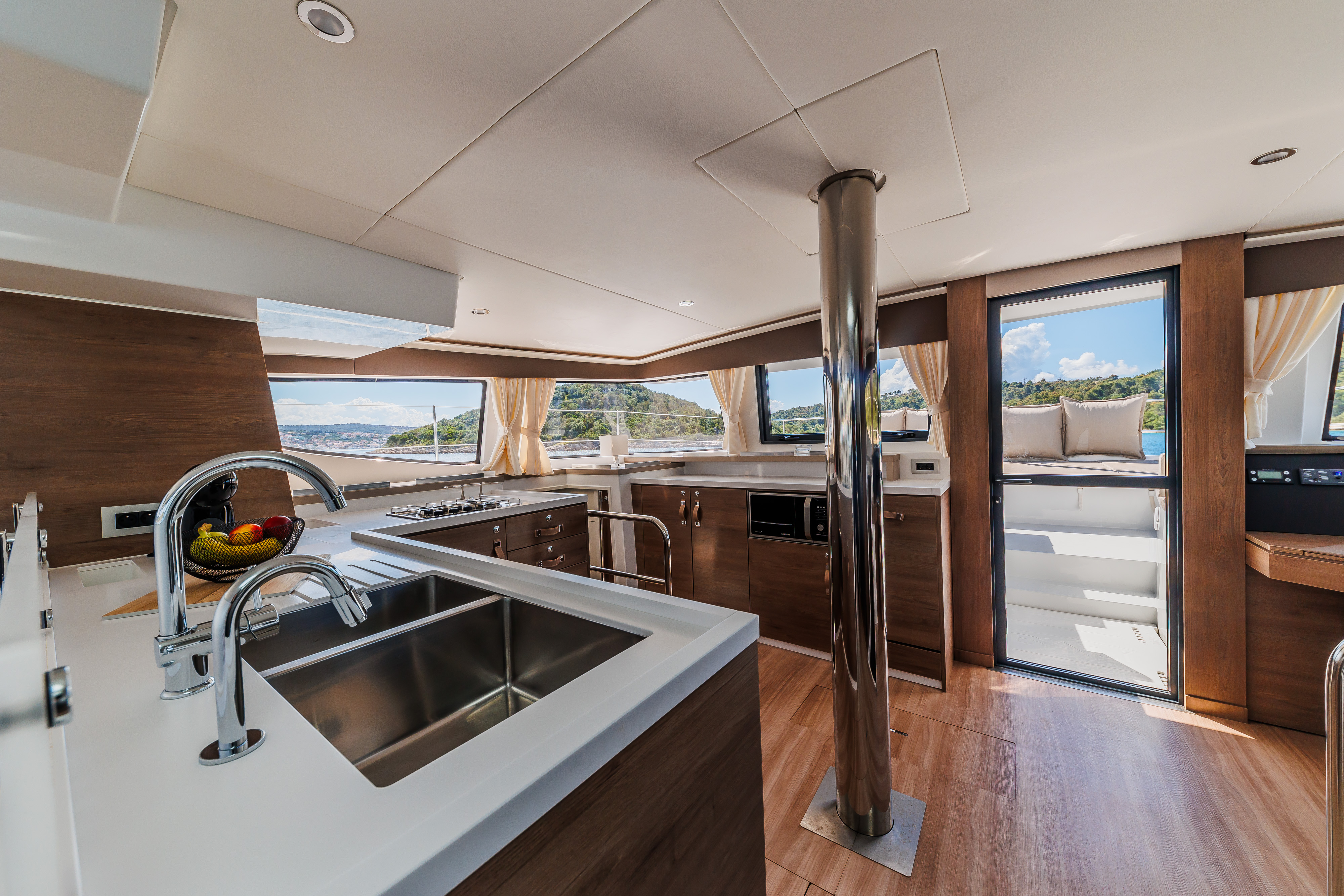 | Inside | Gasherd mit Backofen, Gefrierschrank, Generator, Geschirrspüler, Heizung, Inverter 12V/220V, Kaffeemaschine, Klimaanlage (ohne Landstrombedarf), Kühlschrank, Ladegerät, Lautsprecher im Salon, Pantryausstattung, TV, Warmwasser, Waschmaschine |