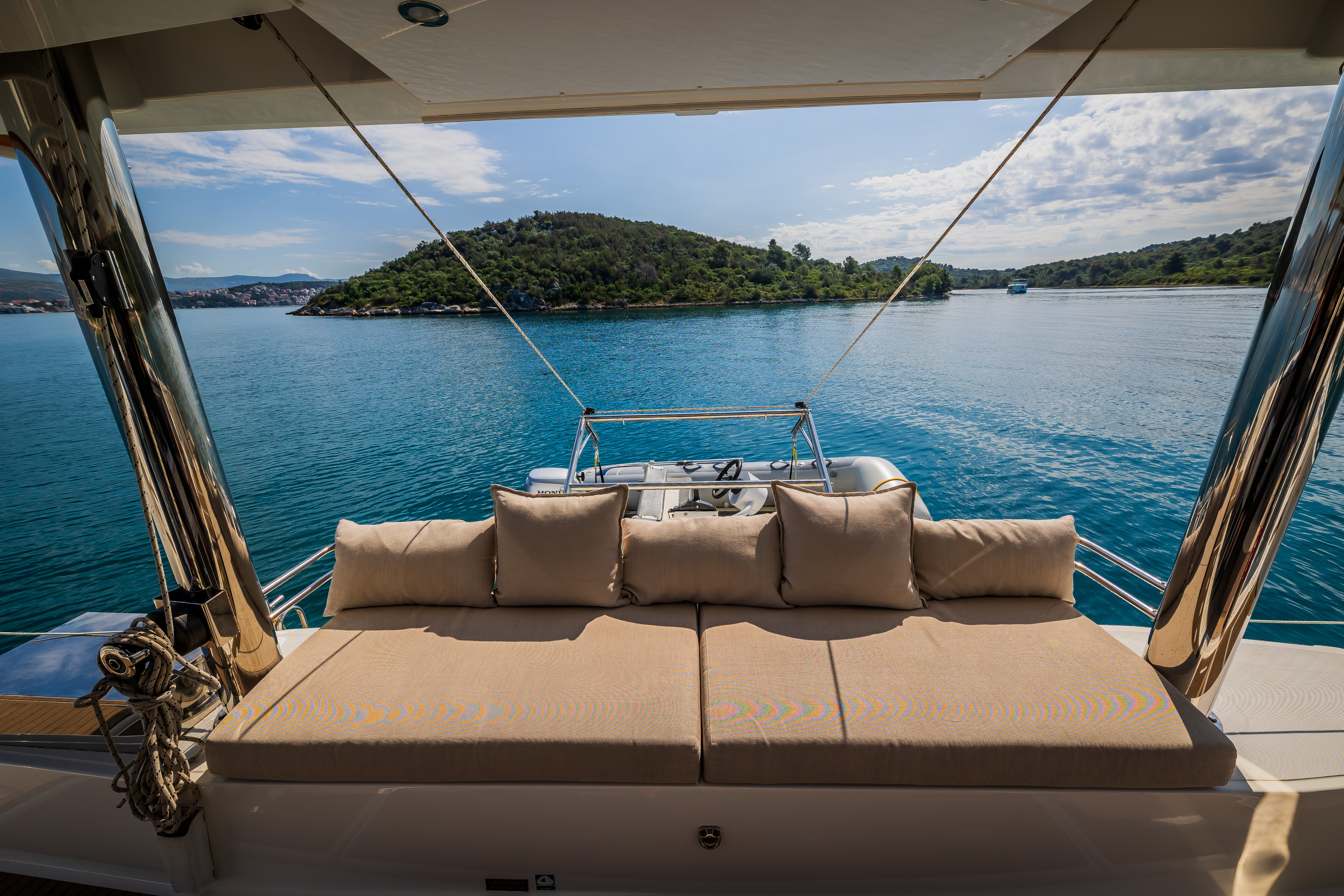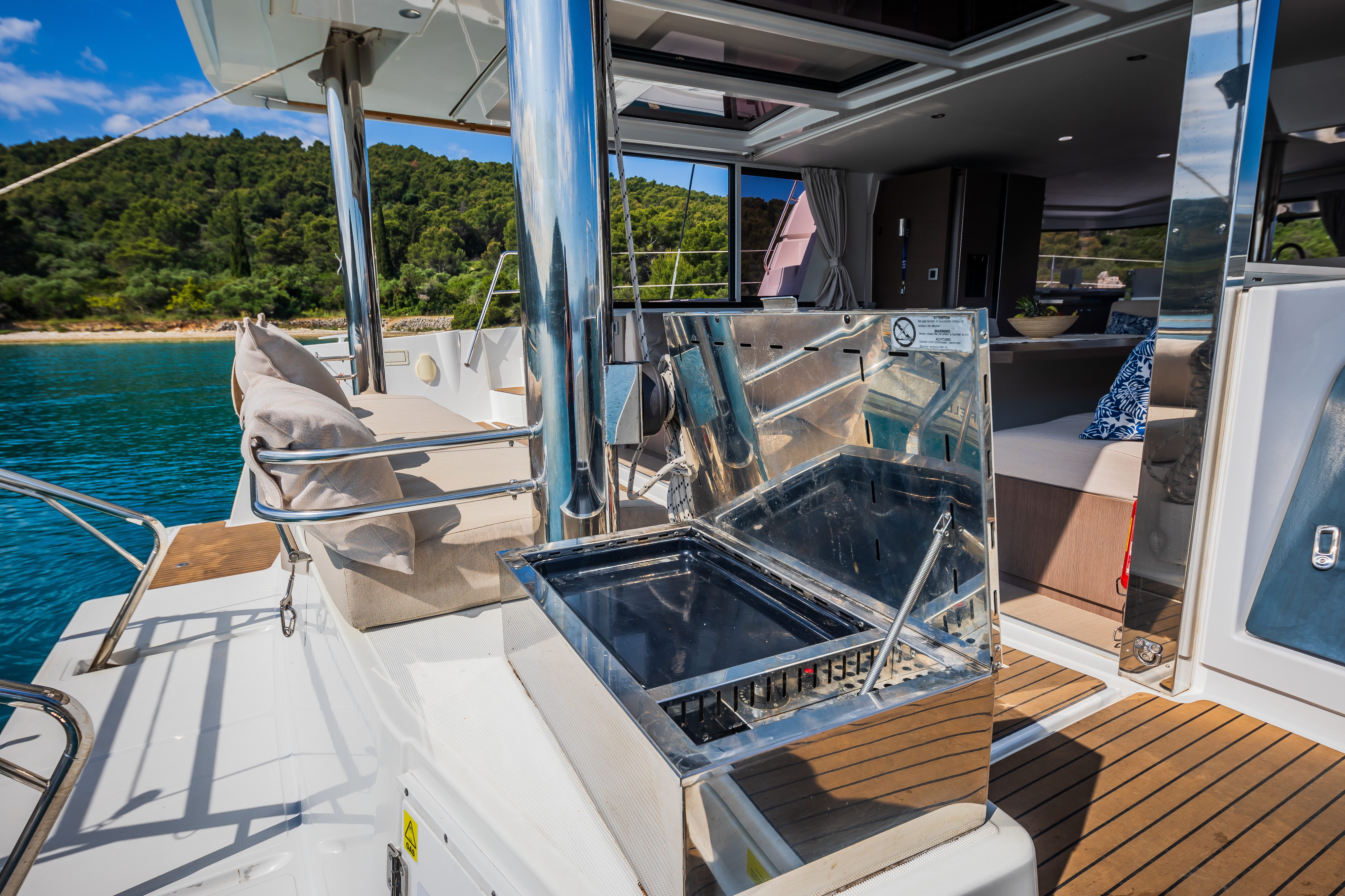 Outside Biminitop, Cockpitdusche, Cockpitlautsprecher, Cockpittisch, Deckpolster, Flybridge, Grill, Solaranlage