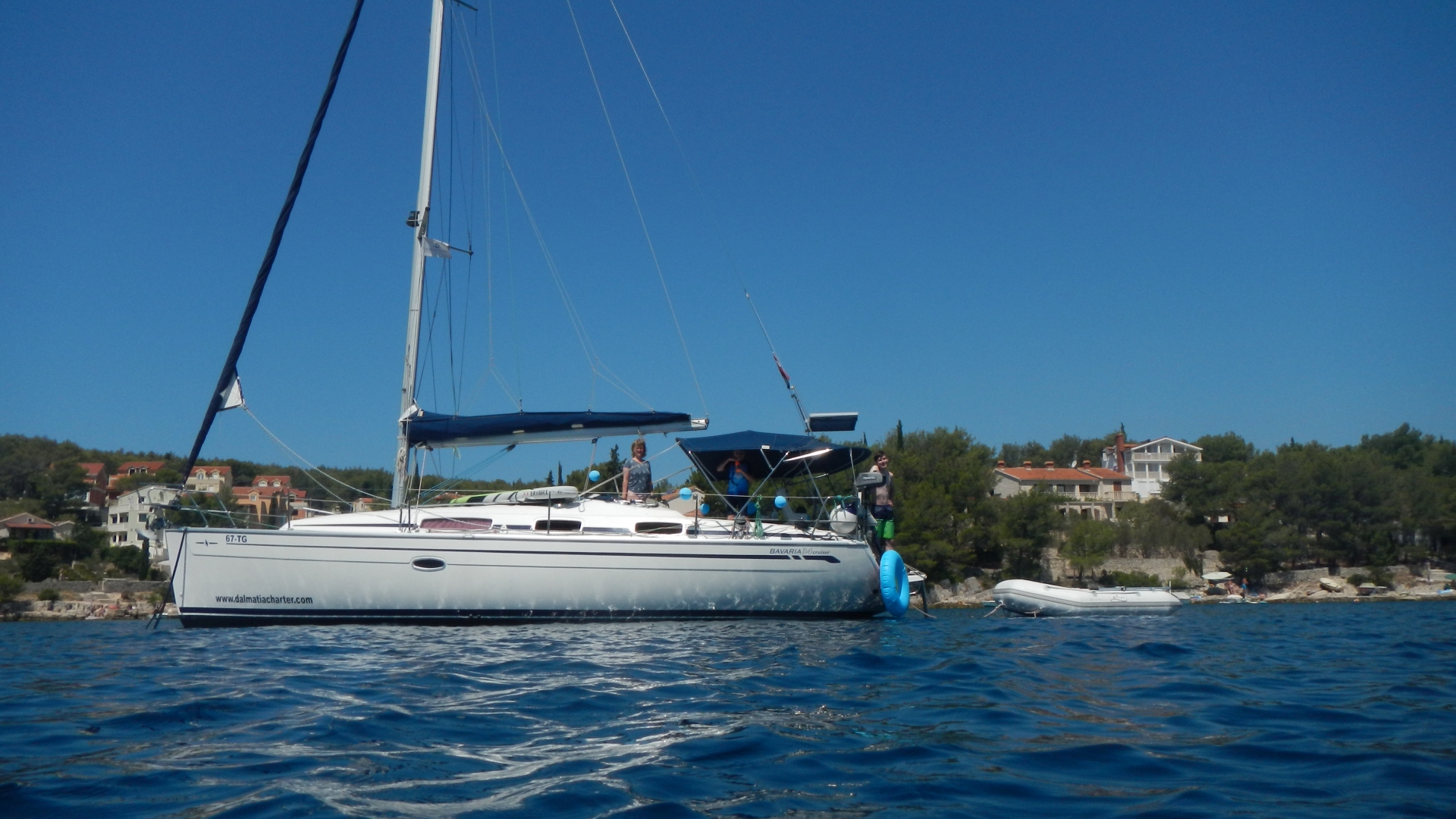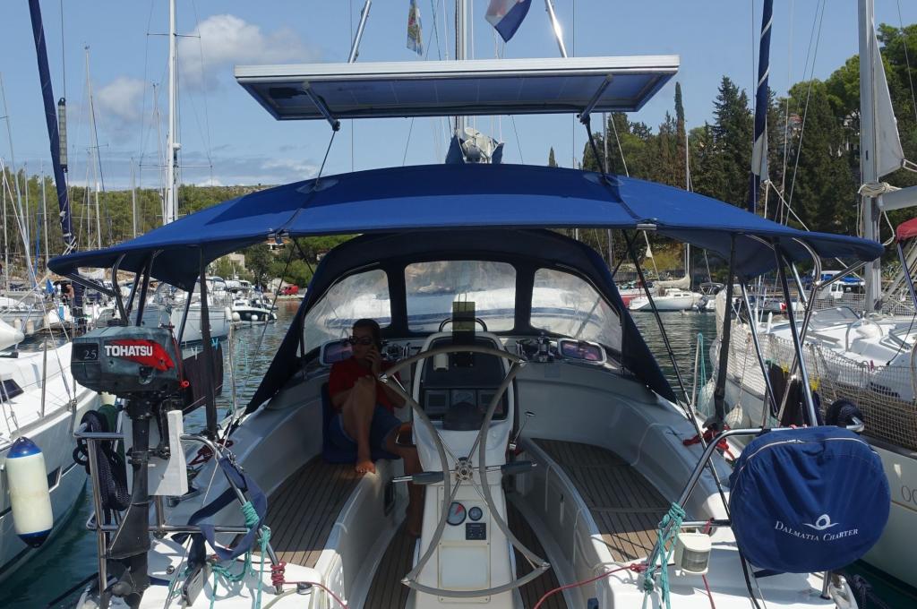 Symaptischer Kontakt mit Dalmatia Charter, Boot insgesamt sehr gut erhalten, etwas Probleme mit Service-Batterie und Ladung und mit dem Reffsystem (lässt sich nicht ganz ausziehen, Segel zu gedreht bei Amwindkurs).
