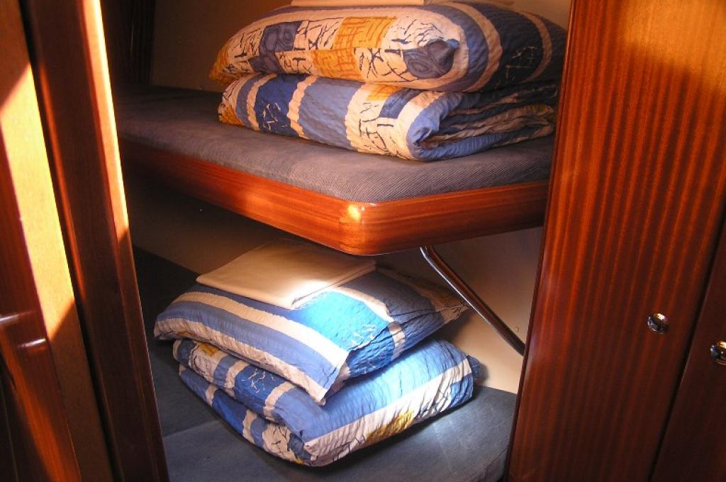 | Safety | Automatikwesten, Autopilot, Blitzboje, Bordapotheke, Bordwerkzeug, Bugstrahlruder, elektr. Bilgepumpe, Feuerlöscher, Handbilgepumpe, Lifebelts, Nebelhorn, Notsignale, Rettungsinsel, Taschenlampe, UKW-Funk, Zweitanker |