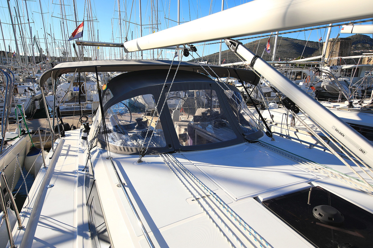 Outside 220 V-Landanschluss, Anker mit Kette, Ankerwinsch, Biminitop, Bootshaken, Cockpitdusche, Cockpitlautsprecher, Cockpitpolster, Cockpittisch, Dieselkanister , elektr. Ankerwinsch, Fender, Festmacherleinen, Gangway, Kugelfender, Kunststoff-Eimer (Pütz), Solaranlage, Sprayhood, Teak im Cockpit, Wantenschneider, Wasserkanister , Wasserschlauch