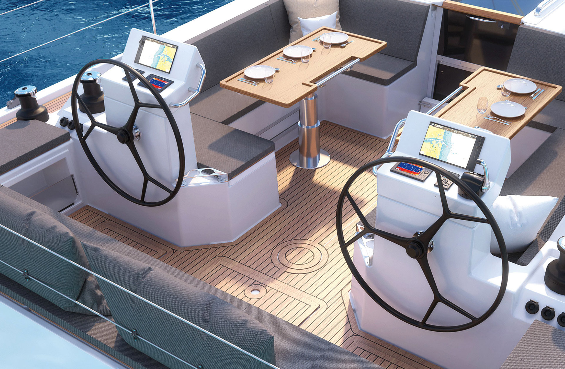 Barometer, Fernglas mit Peilkompass, GPS mit Kartenplotter im Cockpit, Hafenhandbücher, Navigationsbesteck, Seekarten, Tridata (Log, Echolot, Windm.) |