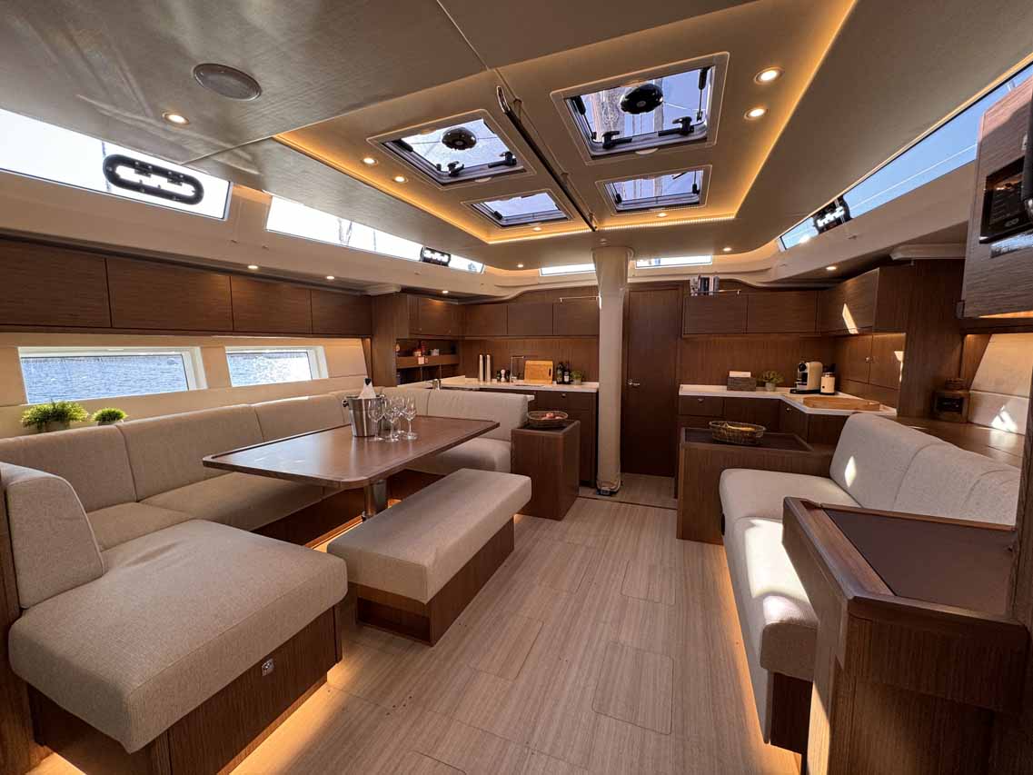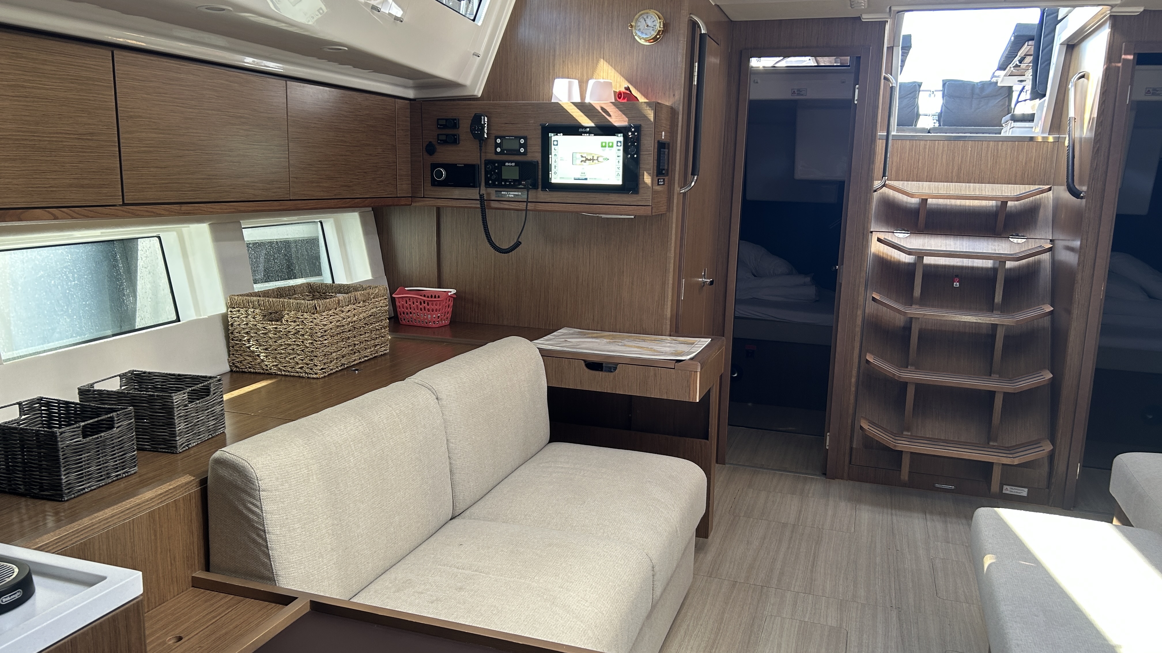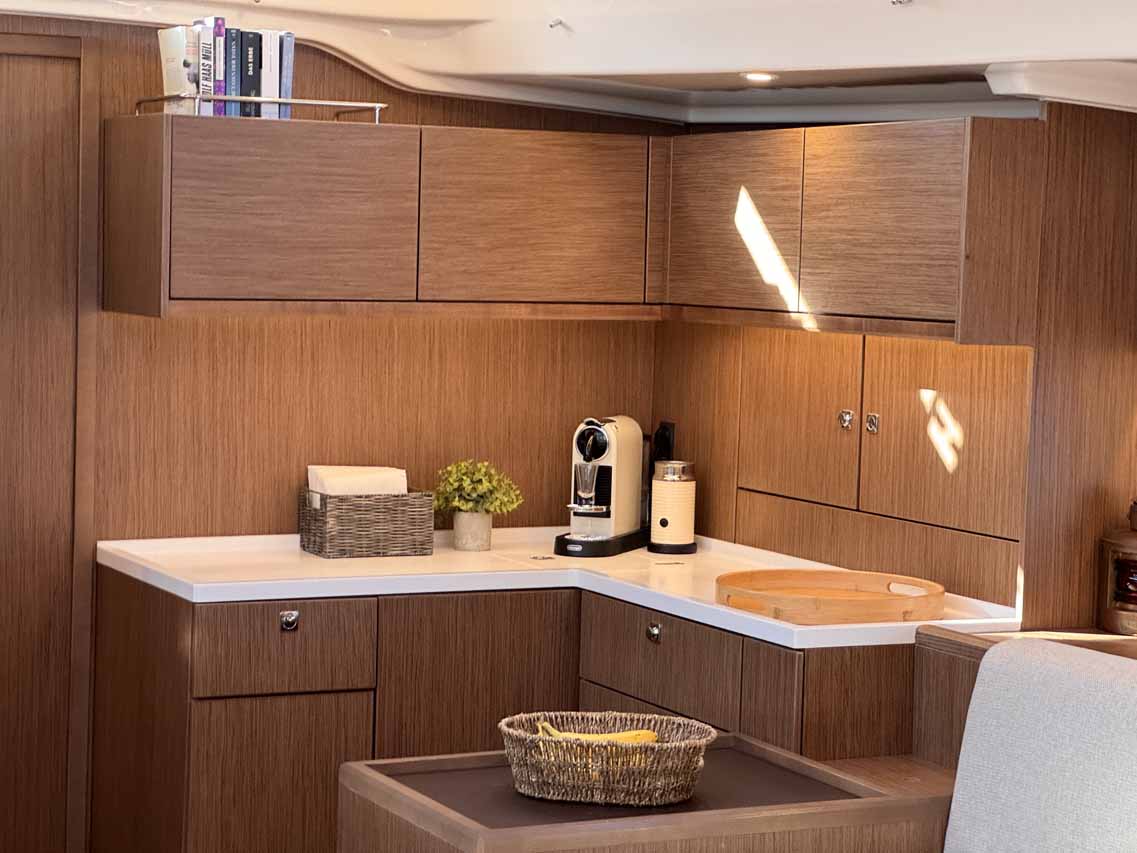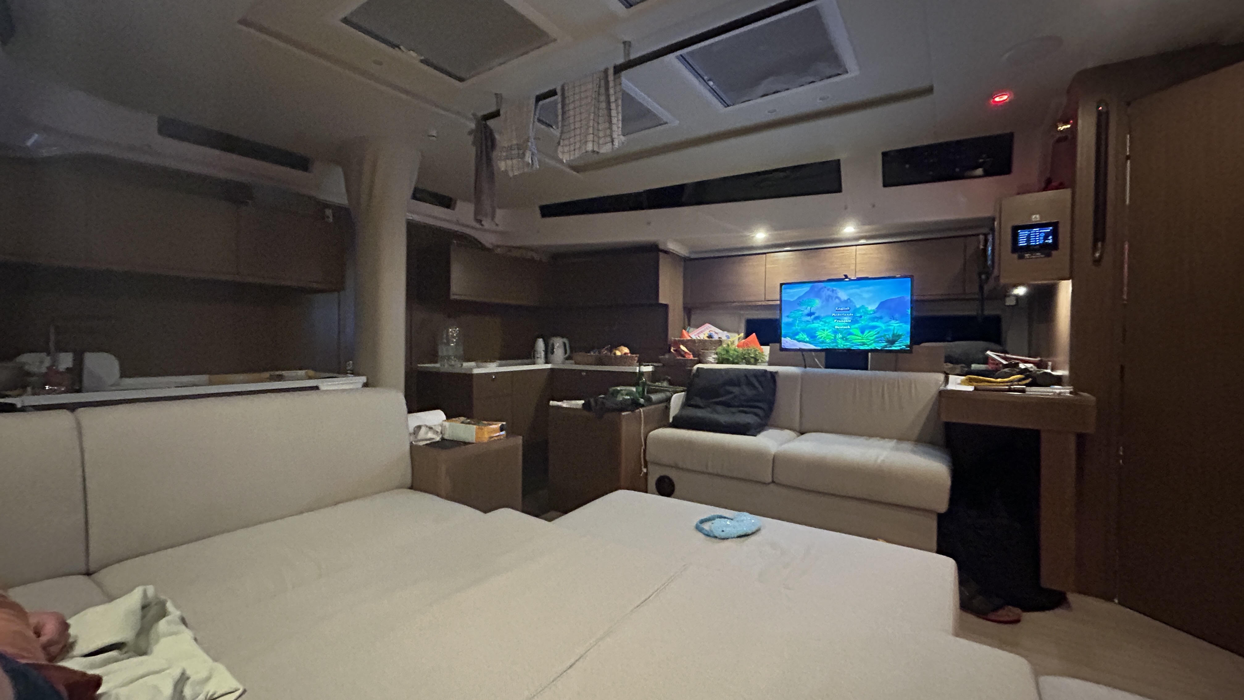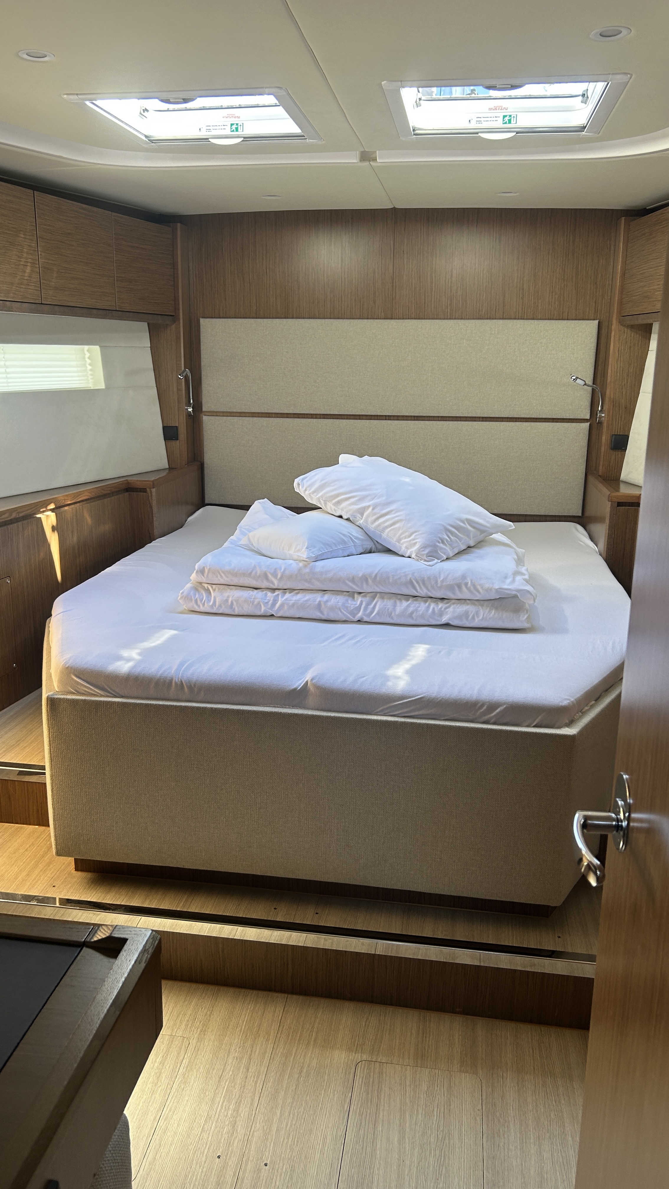 | Inside | 2. Kühlschrank, Borduhr, FUSION Sound System, Generator, Geschirrspüler, Heizung, Inverter 12V/220V, Kaffeemaschine, Klimaanlage (ohne Landstrombedarf), Kühlschrank, Ladegerät, Luftpumpe für Beiboot, Pantryausstattung, Radio mit USB, Bluetooth und AUX-In, Salontisch absenkbar, USB Steckdosen in Salon und Kabinen, Warmwasser, WC (elektr.) |