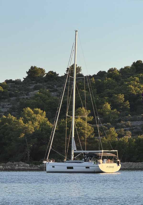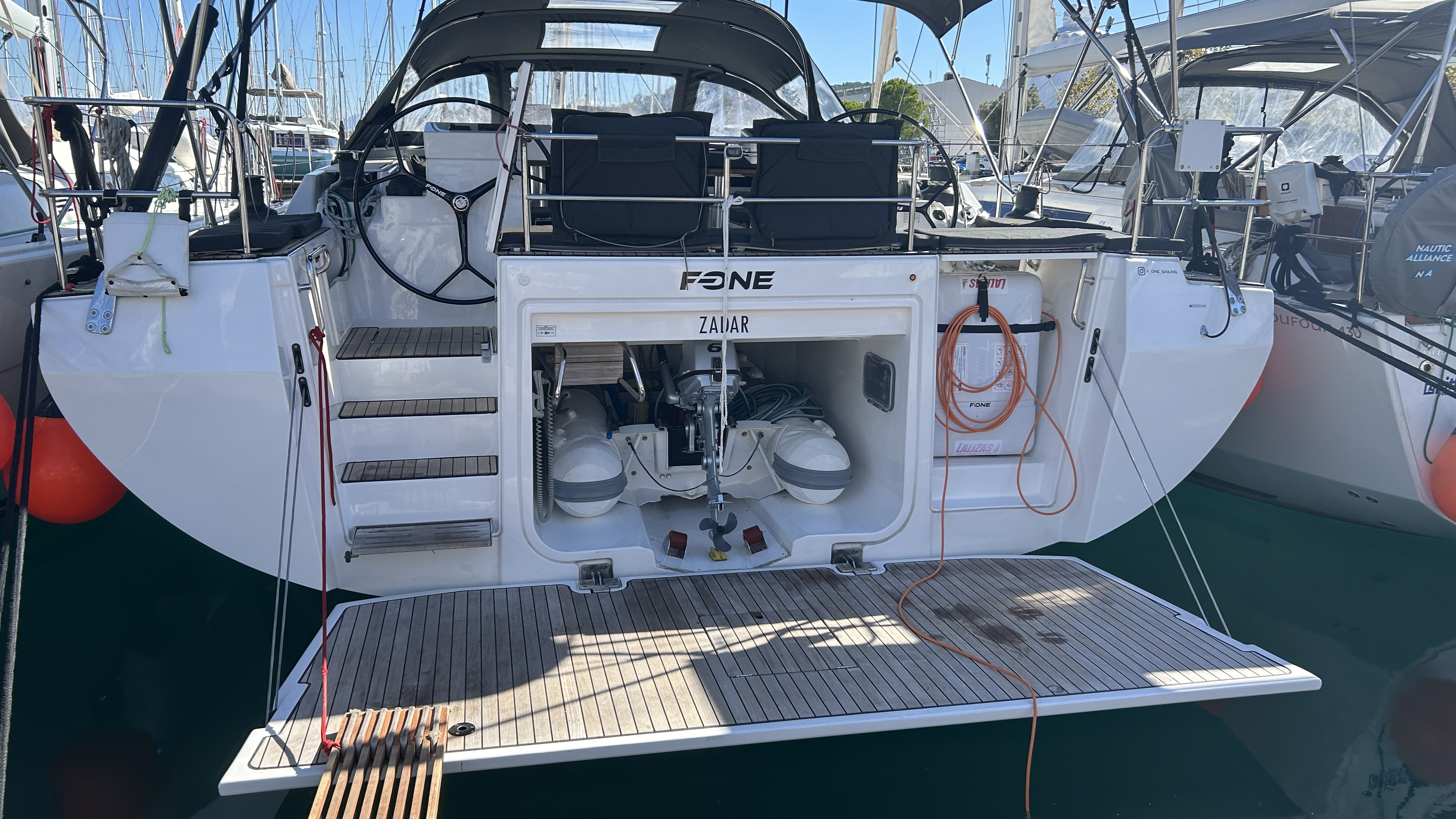 | Outside | 220 V-Landanschluss, Anker mit Kette, Ankerwinsch, Biminitop, Bootshaken, Cockpitdusche, Cockpitkühlschrank, Cockpitlautsprecher, Cockpitpolster, Cockpittisch, Cockpittisch absenkbar, Deckpolster, Dieselkanister , elektr. Ankerwinsch, elektr. Genuawinsch, Fender, Festmacherleinen, Gangway, Kugelfender, Kunststoff-Eimer (Pütz), Solaranlage, Sprayhood, Teak im Cockpit, Teakdeck, Wantenschneider, Wasserkanister , Wasserschlauch, Windex |