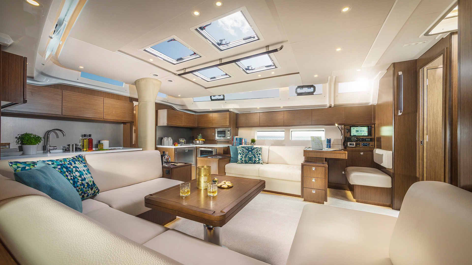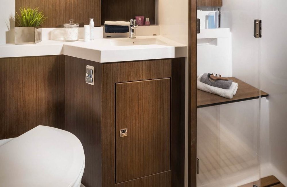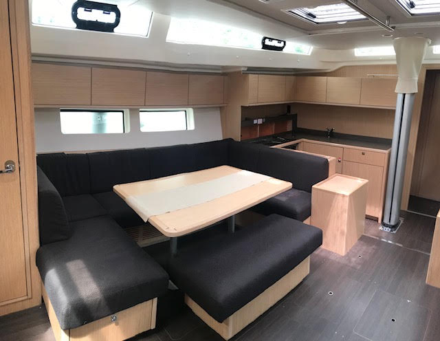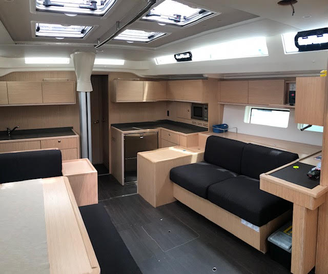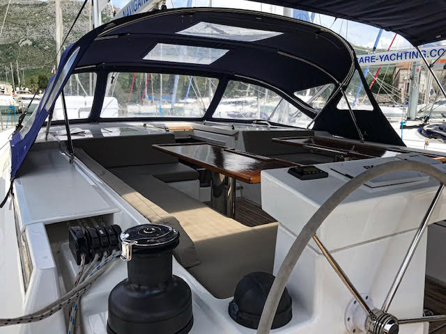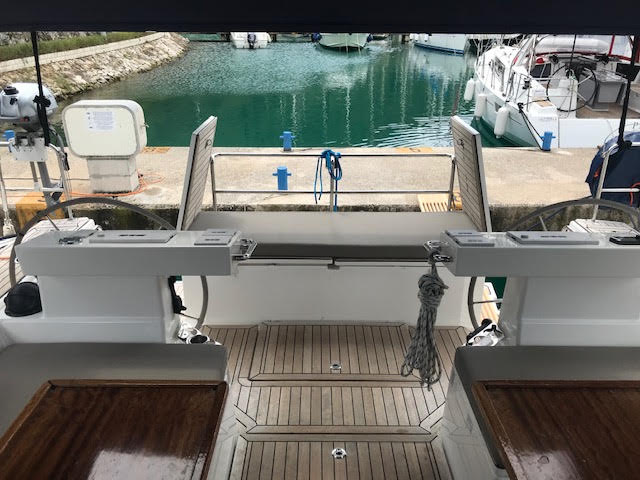 | Outside | Anker mit Kette, Badeleiter, Badeplattform, Biminitop, Cockpitdusche, Cockpitlautsprecher, Cockpitpolster, elektr. Ankerwinsch, elektr. Winsch, Sprayhood, Teak im Cockpit, Windex, Winschen |