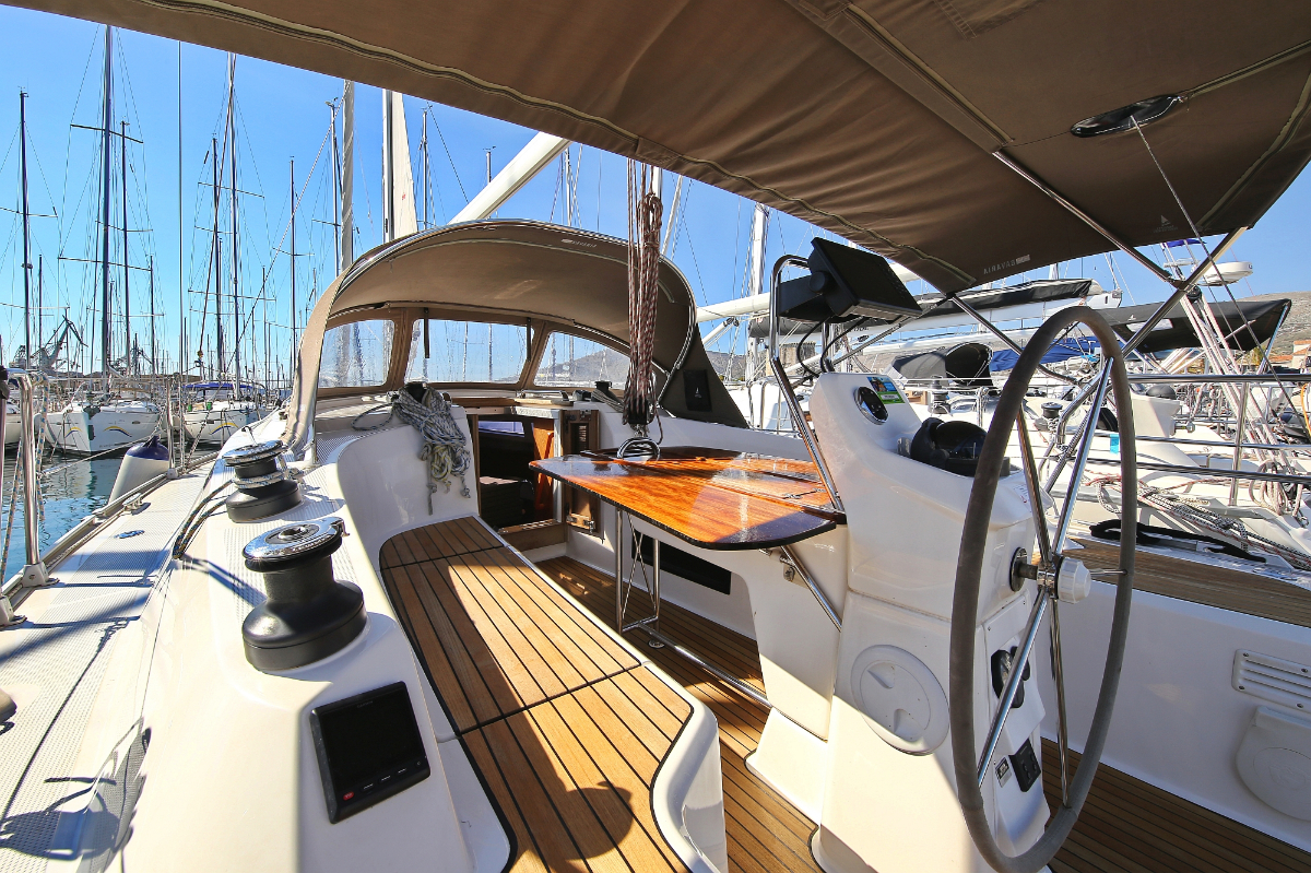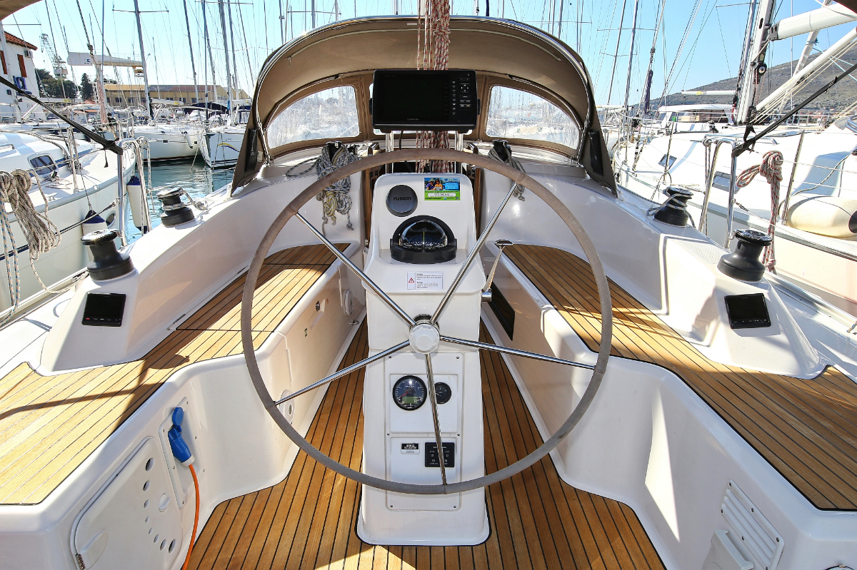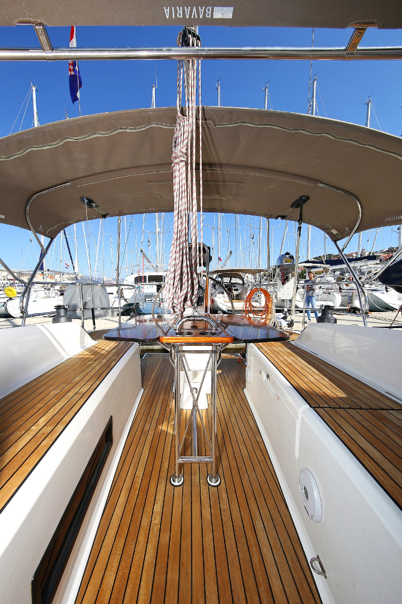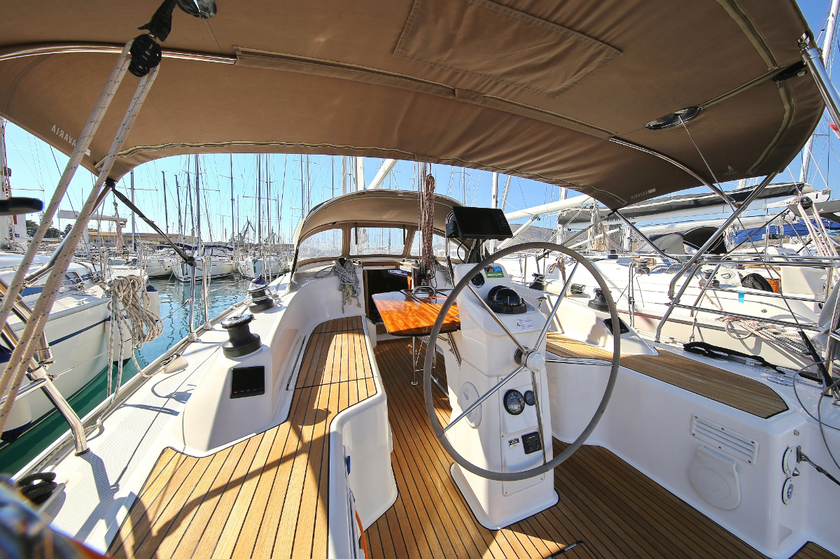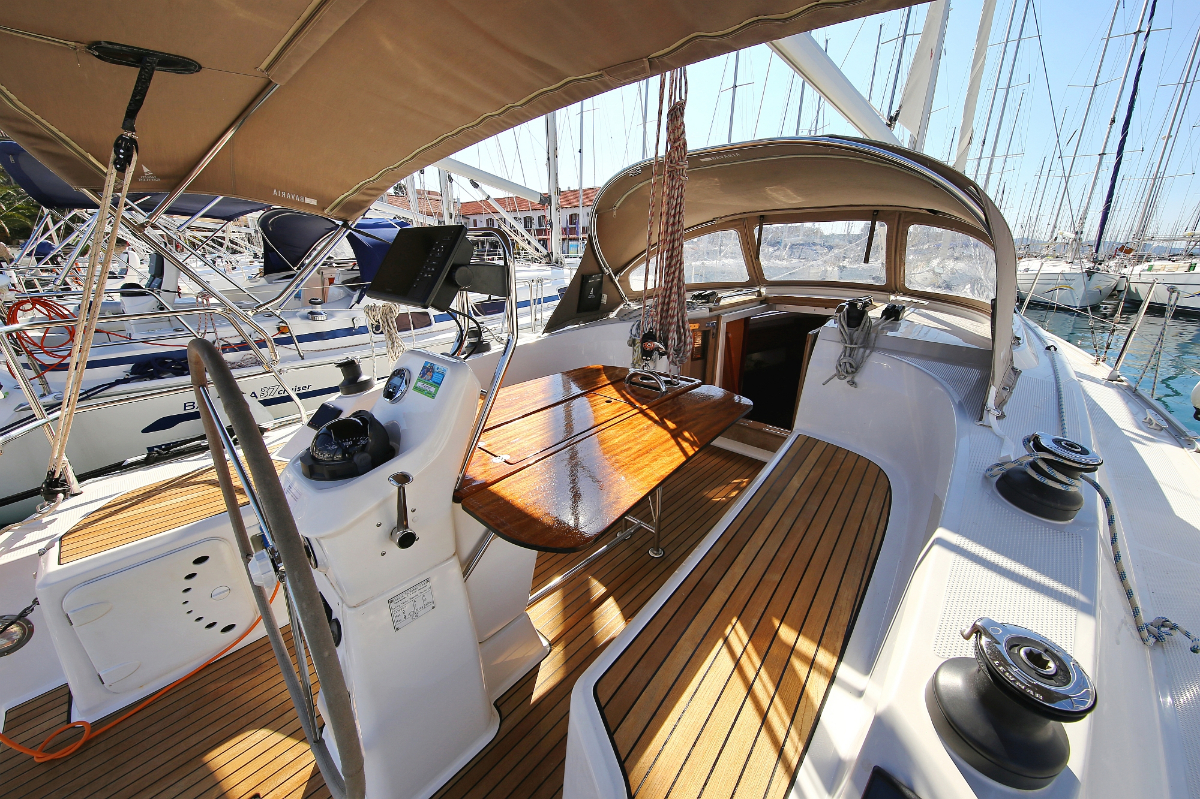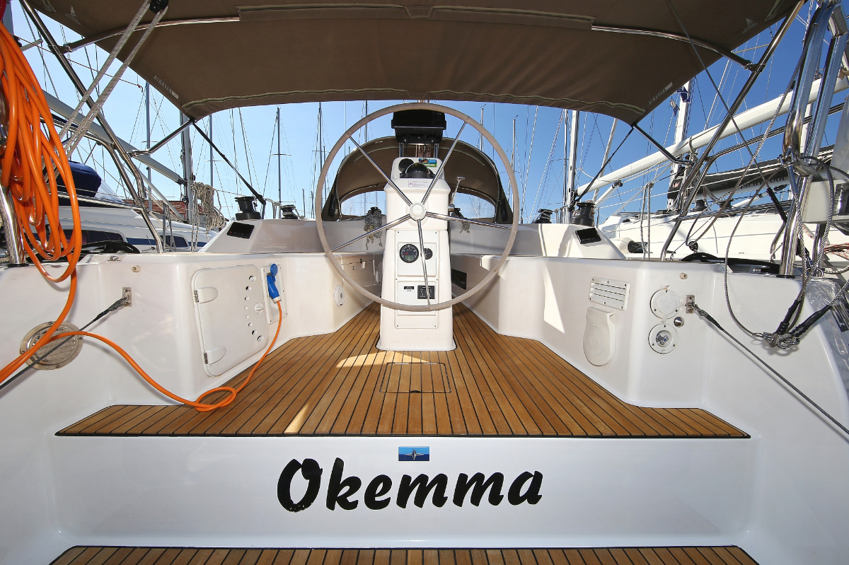 | Outside | 220 V-Landanschluss, Anker mit Kette, Ankerwinsch, Badeplattform, Biminitop, Bootshaken, Cockpitdusche, Cockpitlautsprecher, Cockpitpolster, Cockpittisch, Dieselkanister , elektr. Ankerwinsch, Fender, Festmacherleinen, Gangway, Kugelfender, Kunststoff-Eimer (Pütz), Sprayhood, Teak im Cockpit, Wantenschneider, Wasserkanister , Wasserschlauch, Windex |
