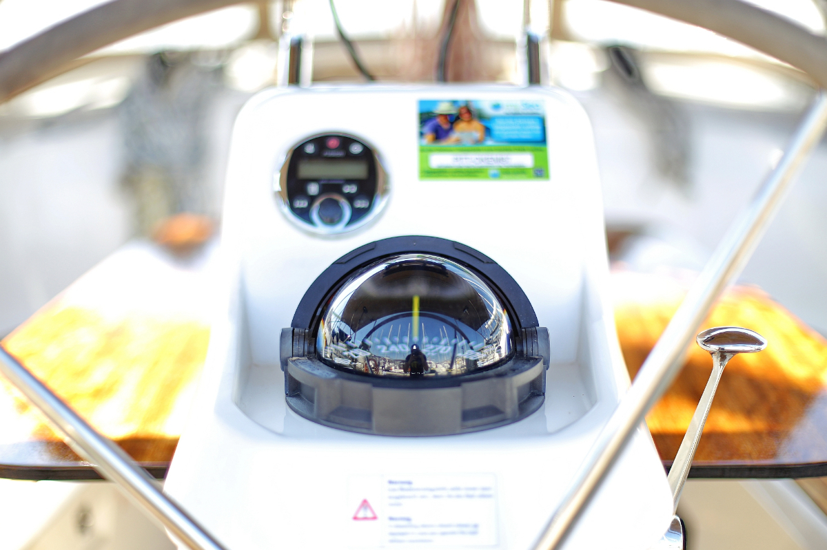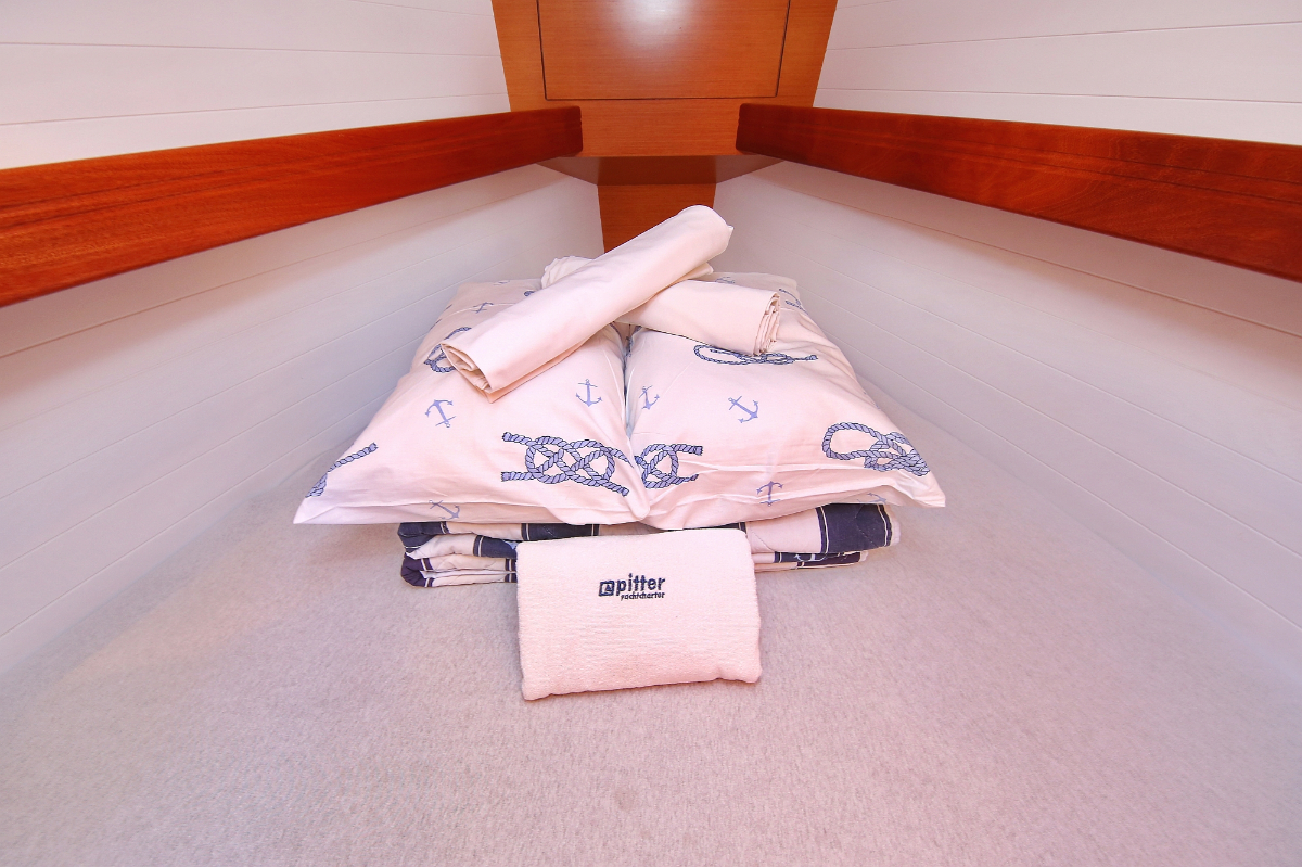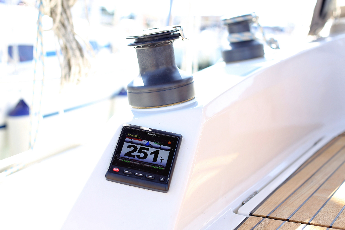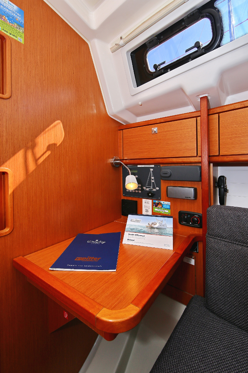 | Navigation | Fernglas, Fernglas mit Peilkompass, GPS mit Kartenplotter im Cockpit, Hafenhandbücher, Navigationsbesteck, Seekarten, Tridata (Log, Echolot, Windm.) |
